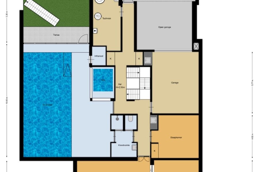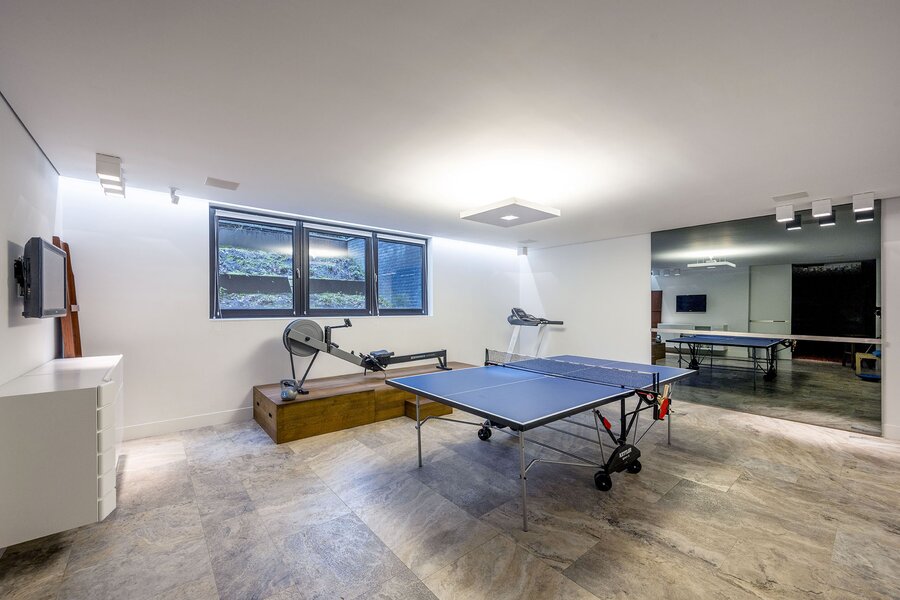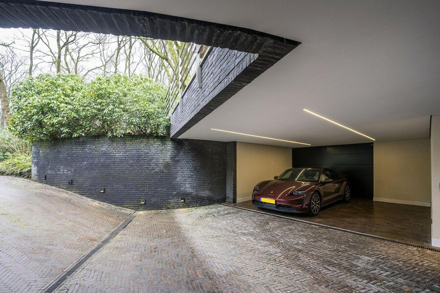 Bij aankomst kunt u ook uw auto parkeren in de carport (en/of garage) onder het huis, waar zich ook de fietsenberging bevindt. De focus van het souterrain ligt op totale ontspanning, met veel ruimte voor wellness, sport en amusement. Hier bevindt zich een tweede entree, tot een gang welke toegang geeft tot de techniekruimte, het trappenhuis, een logeerkamer, de gym, de home cinema en de kleedkamer van de zwemzaal. Vanuit de kleedkamer hebt u toegang tot het binnenzwembad met jetstream, jacuzzi en infrarood sauna. De ruimte geeft toegang tot een verdiept buitenterras met toegang tot de tuin.