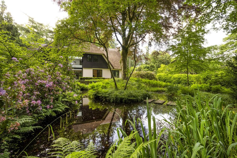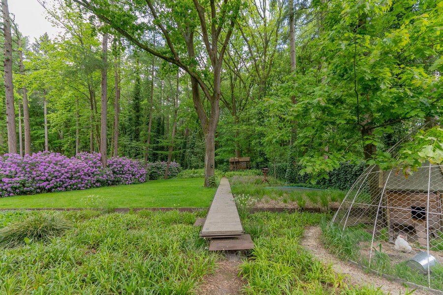 Het perceel beslaat een kleine 3.000 m² en aan de achterzijde grenzend aan natuurgebied. De lager gelegen voortuin karakteriseert zich als bostuin met slingerende paadjes en met een idyllisch gelegen vijver inclusief eiland en is vanuit de woonkamer bereikbaar via een trappenpartij. De woning is geheel rondom bereikbaar en voorzien van borders en toegangspaden. De achtertuin is gericht op ontspanning en ook voorzien van een verhoogd, haast zwevend pad. ’s-Avonds hoort u de wind ruisen in de bomen en verder hoort u…. niets. He-le-maal niets, op roepende uilen en een actieve specht na.