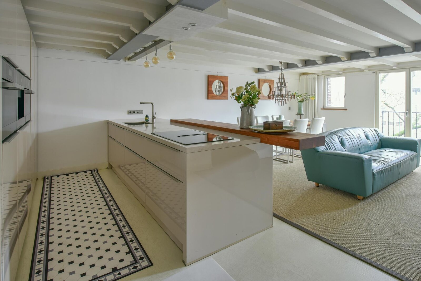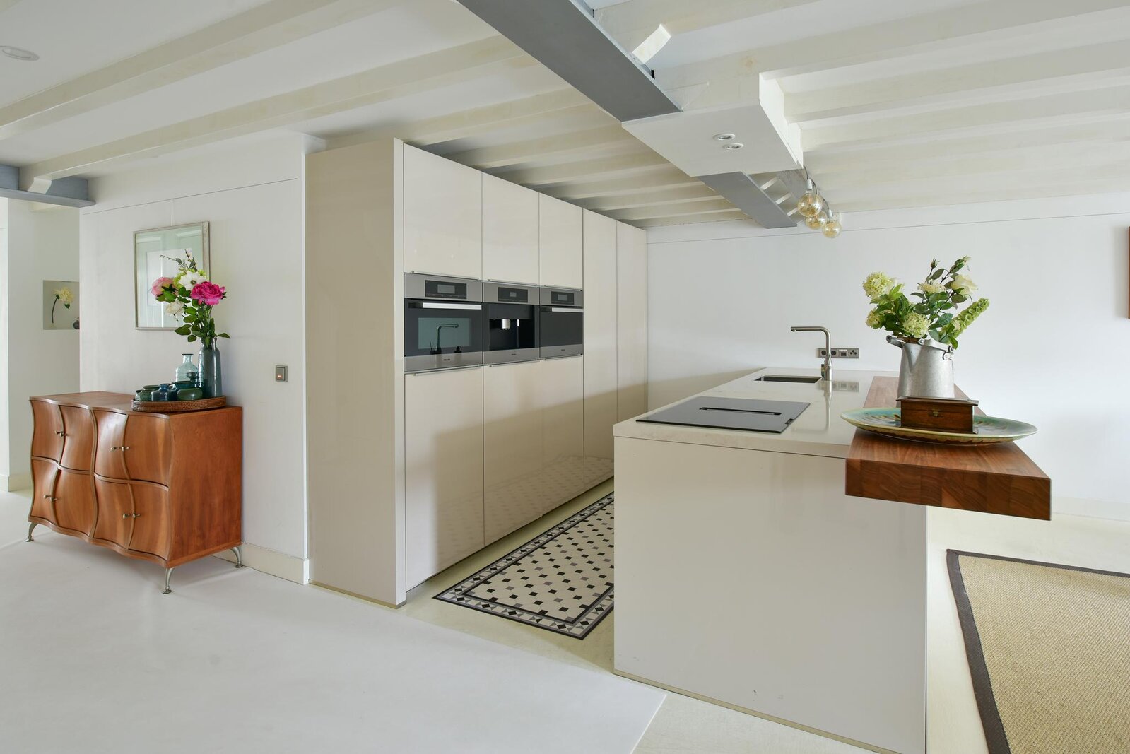 Riante woonkamer aan de voorzijde met openslaande deuren naar een Frans balkon, een sfeervolle gashaard verwerkt in een ingebouwde kast en de keuken in het midden van de verdieping in open opstelling. De moderne hoogglans keuken is voorzien van diverse inbouwapparatuur waaronder een inductiekookplaat met geïntegreerde afzuiger, vaatwasser, koelkast, vriezer, stoomoven, combioven alsmede een koffieautomaat (Miele). De keukenkastjes lopen door in de inbouwkast van de woonkamer die afgewerkt is met noten hout. Dit vind je ook weer terug in de vensterbanken.