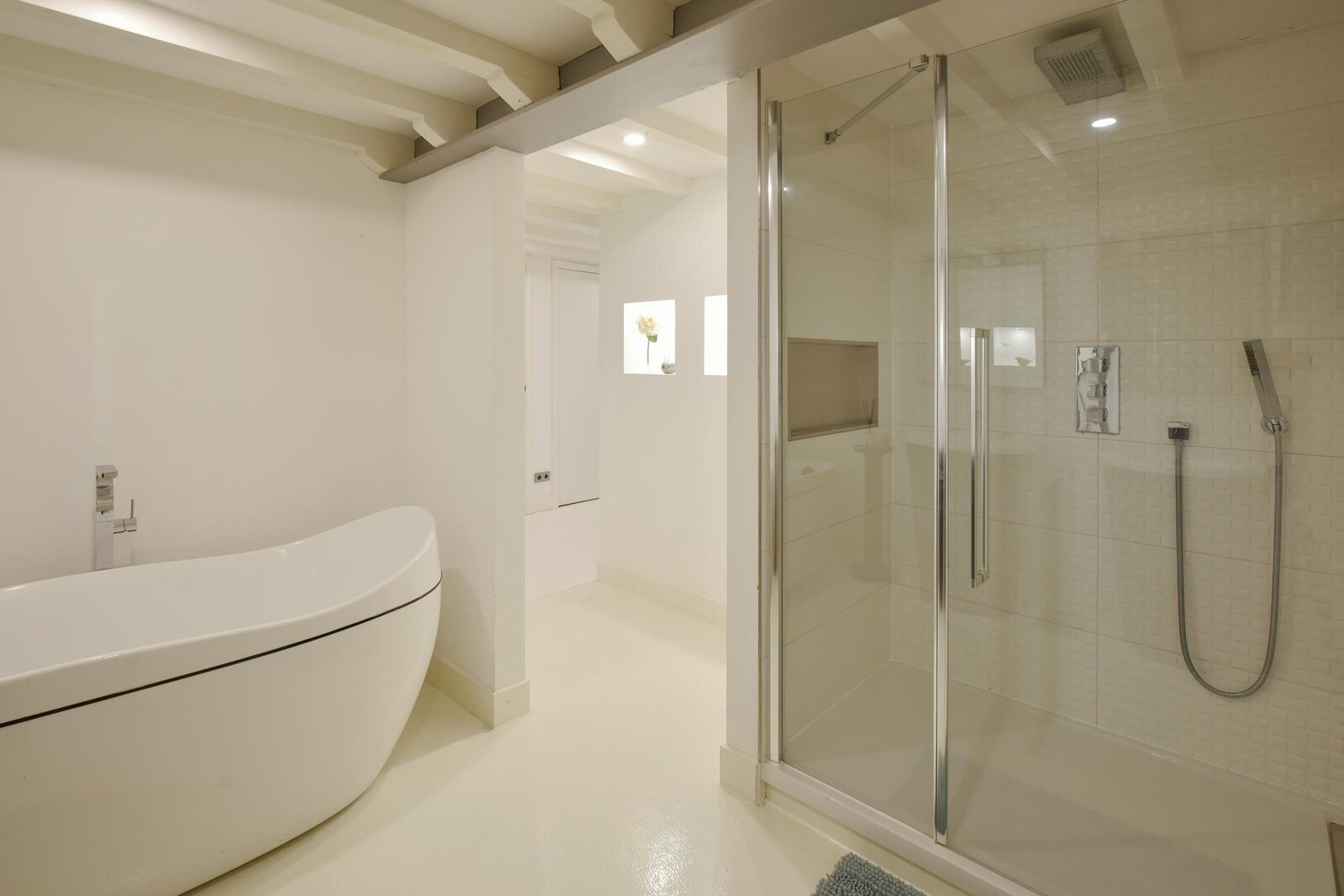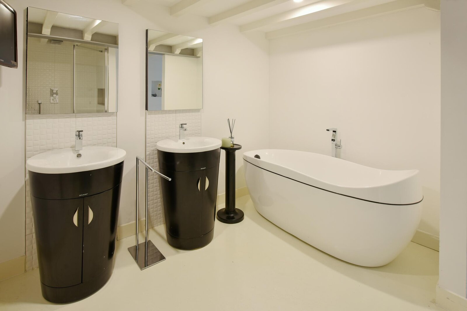 In het midden van de verdieping is de ruime badkamer gesitueerd die voorzien is van een vrijstaand ligbad, ruime douche, dubbele wastafel met meubel alsmede wederom voorbereiding voor coax en utp.