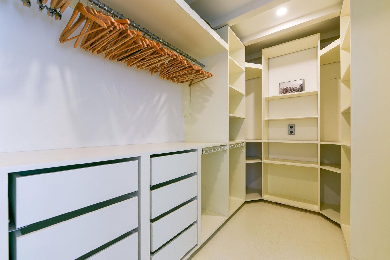 Vanuit de keuken loopt u via de centrale hal door naar de grote slaapkamer aan de achterzijde van de woning. Deze lichte slaapkamer is voorzien van een kastenwand aan de ene zijde en een inloopkast aan de achterzijde. Zoals eerder omschreven is deze kamer in tweeën te delen, waarbij beide kamers voldoende kastruimte hebben. Vanuit deze kamers is er dan ook toegang tot het mogelijke balkon.