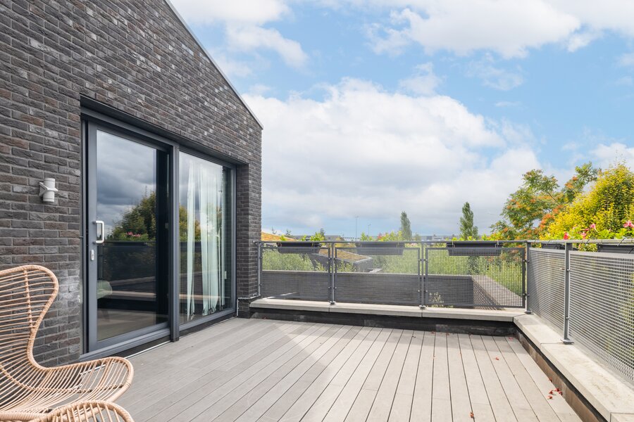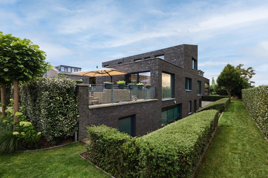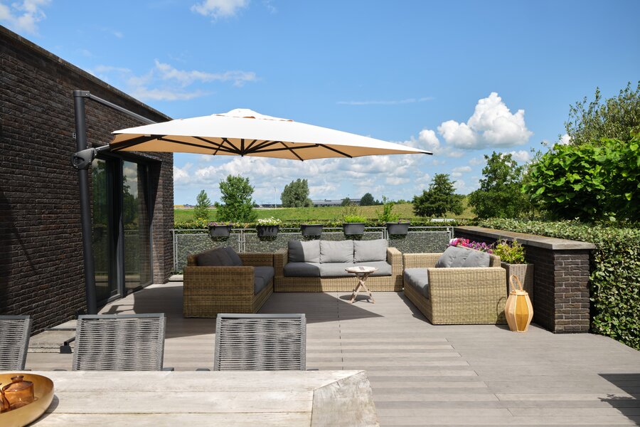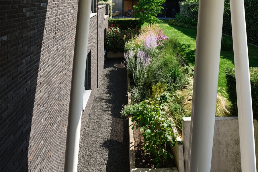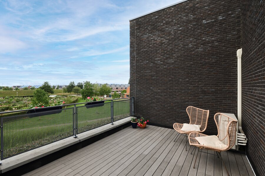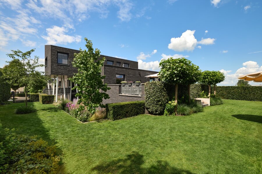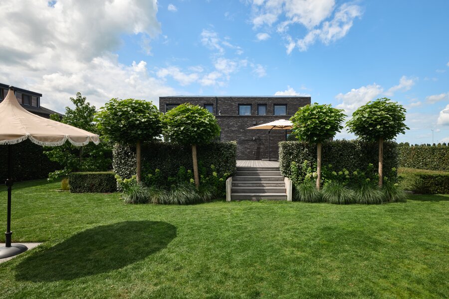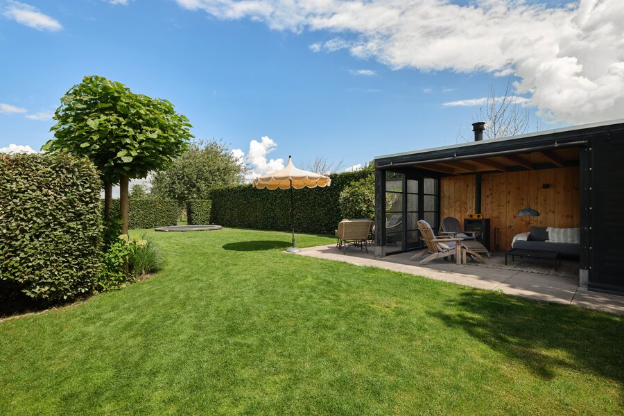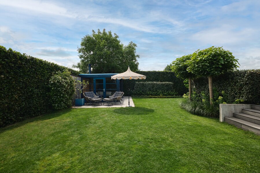 De tuin rondom deze woning is bijzonder. Net als de architectuur van de woning is ook de tuin een aaneenschakeling van mooie plekken. Borders met bijzondere planten en bloemen, een groen gazon, maar ook grote bomen, hagen en terrassen. Het zonneterras aan de achterzijde is bij uitstek de plek om vanuit de keuken lekker buiten te eten met elkaar. Via een paar treden kom je bij de tuin en sta je op het gras. Er is een sfeervolle veranda, voorzien van houtkachel, waar je het hele jaar door heerlijk buiten kunt genieten. Een fijne plek met veel privacy en prachtig uitzicht op de tuin. De grootte van de tuin rondom met de meerdere terrassen en balkons zorgen ervoor dat je altijd ergens een schaduwplek kan vinden of voor de zonliefhebber juist altijd een plek in de zon kunt opzoeken.