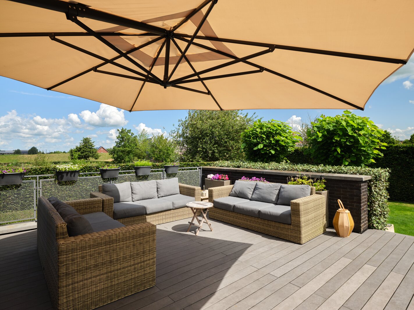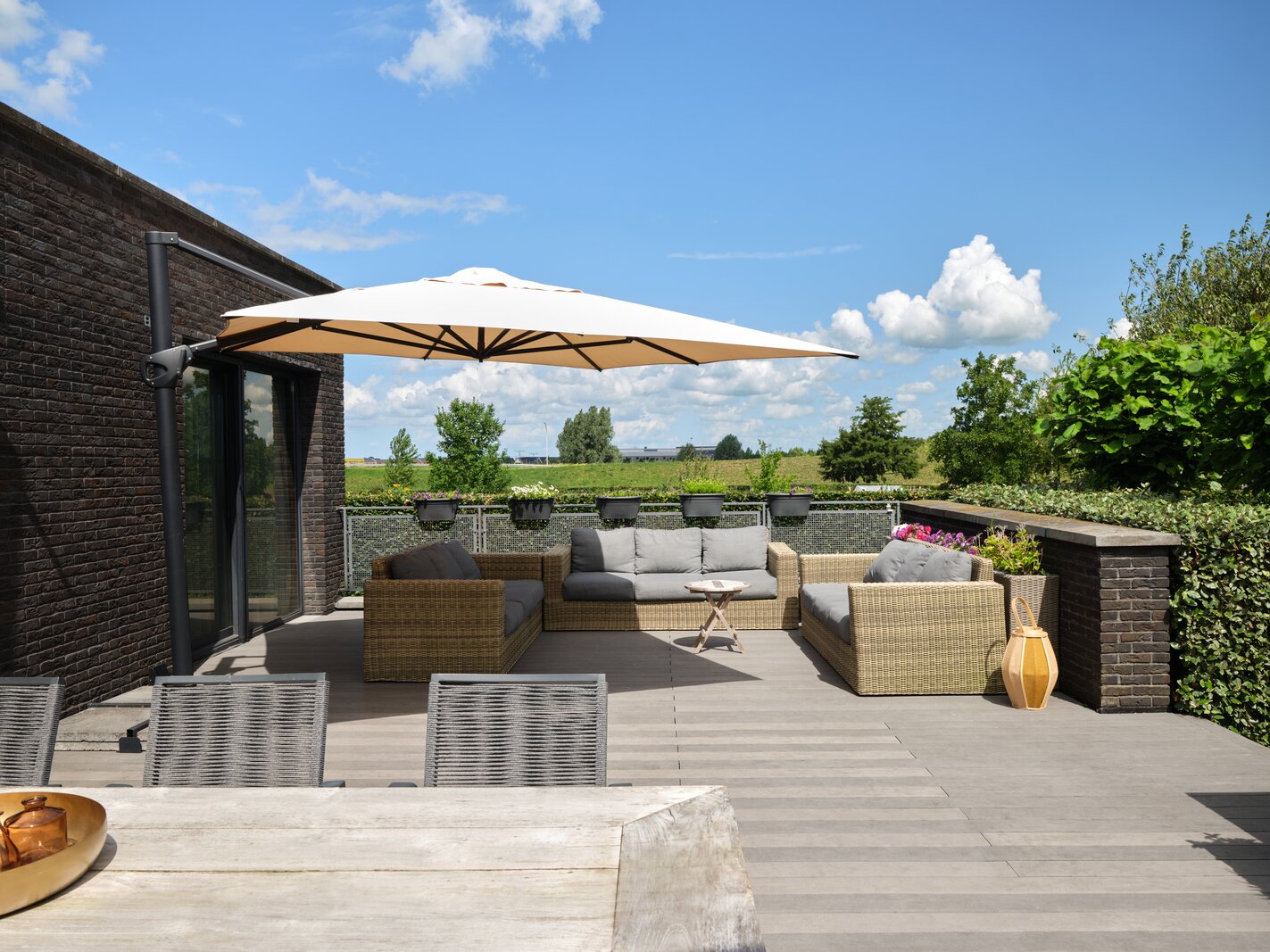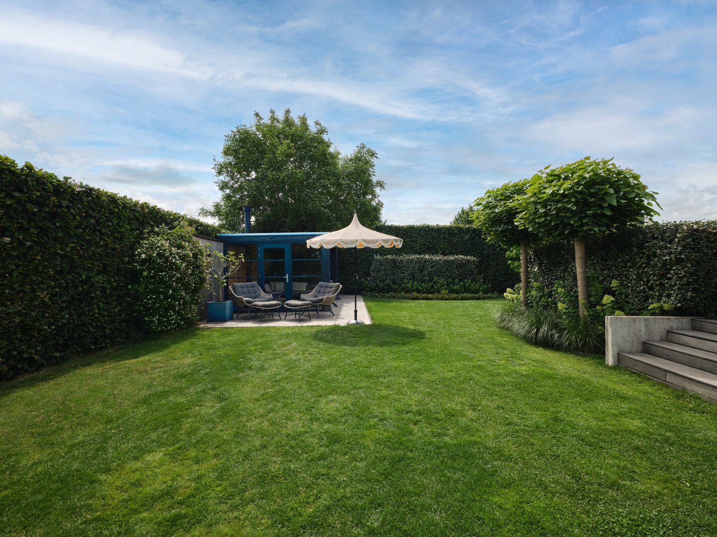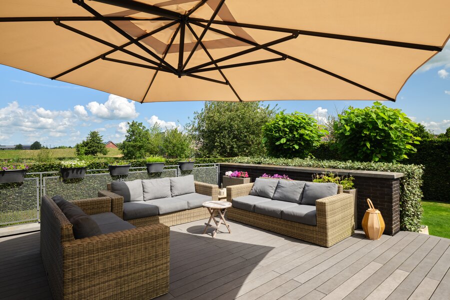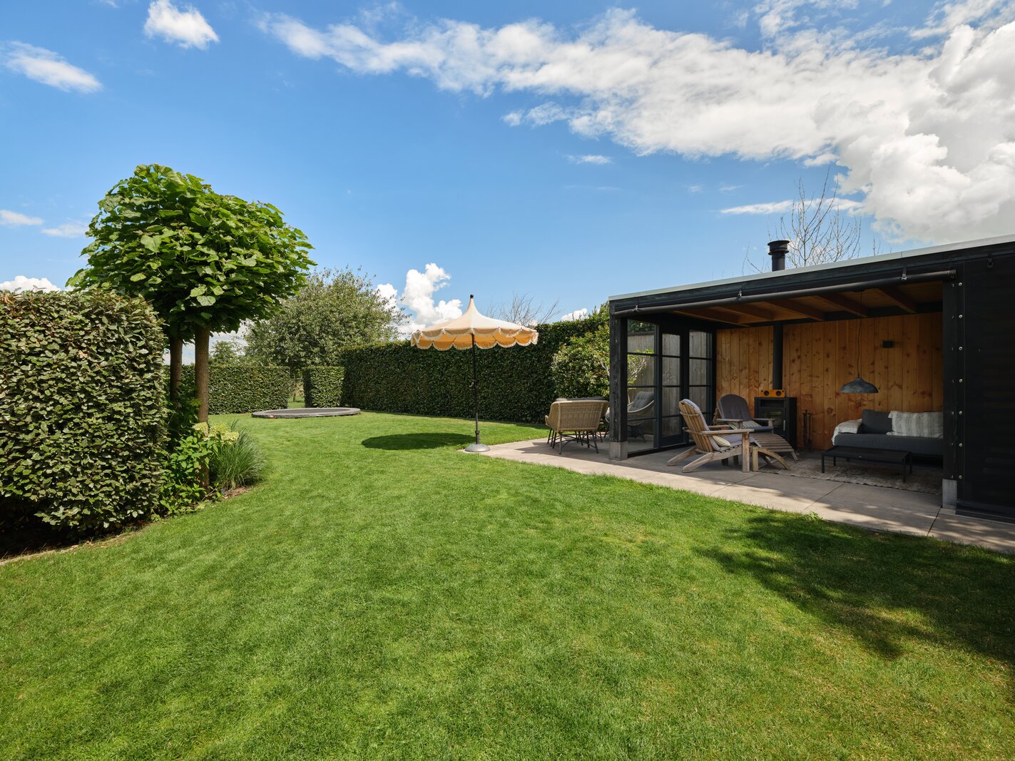 De tuin rondom deze woning is bijzonder. Net als de architectuur van de woning is ook de tuin een aaneenschakeling van mooie plekken. Borders met bijzondere planten en bloemen, een groen gazon, maar ook grote bomen, hagen en terrassen. Het zonneterras aan de achterzijde is bij uitstek de plek om vanuit de keuken lekker buiten te eten met elkaar. Via een paar treden kom je bij de tuin en sta je op het gras. Er is een sfeervolle veranda, voorzien van houtkachel, waar je het hele jaar door heerlijk buiten kunt genieten. Een fijne plek met veel privacy en prachtig uitzicht op de tuin. De grootte van de tuin rondom met de meerdere terrassen en balkons zorgen ervoor dat je altijd ergens een schaduwplek kan vinden of voor de zonliefhebber juist altijd een plek in de zon kunt opzoeken.
