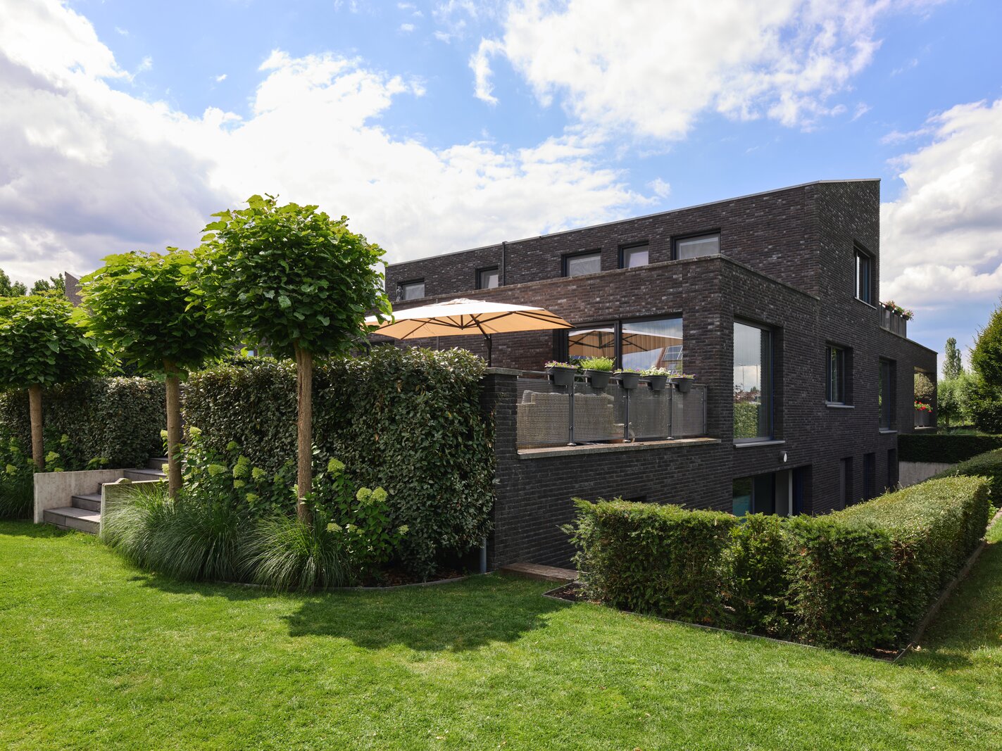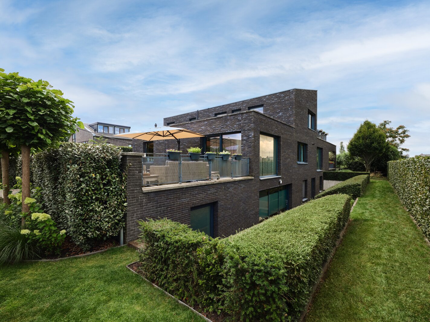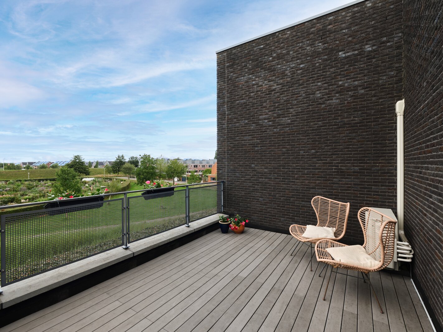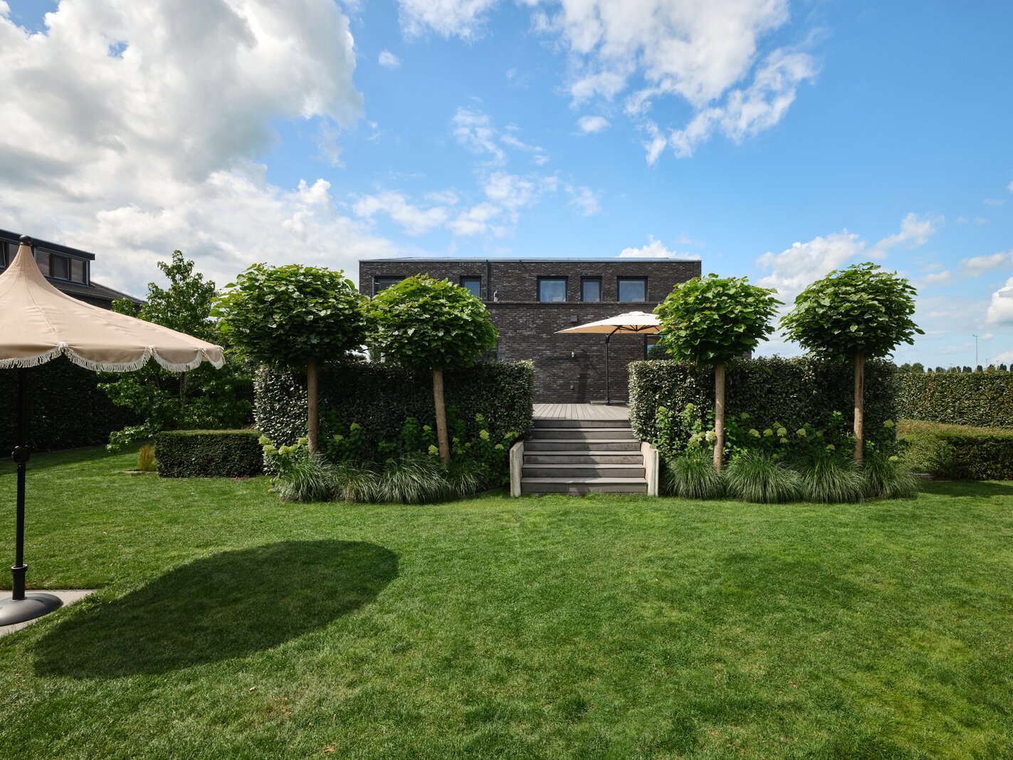 De tuin rondom deze woning is bijzonder. Net als de architectuur van de woning is ook de tuin een aaneenschakeling van mooie plekken. Borders met bijzondere planten en bloemen, een groen gazon, maar ook grote bomen, hagen en terrassen. Het zonneterras aan de achterzijde is bij uitstek de plek om vanuit de keuken lekker buiten te eten met elkaar. Via een paar treden kom je bij de tuin en sta je op het gras. Er is een sfeervolle veranda, voorzien van houtkachel, waar je het hele jaar door heerlijk buiten kunt genieten. Een fijne plek met veel privacy en prachtig uitzicht op de tuin. De grootte van de tuin rondom met de meerdere terrassen en balkons zorgen ervoor dat je altijd ergens een schaduwplek kan vinden of voor de zonliefhebber juist altijd een plek in de zon kunt opzoeken.