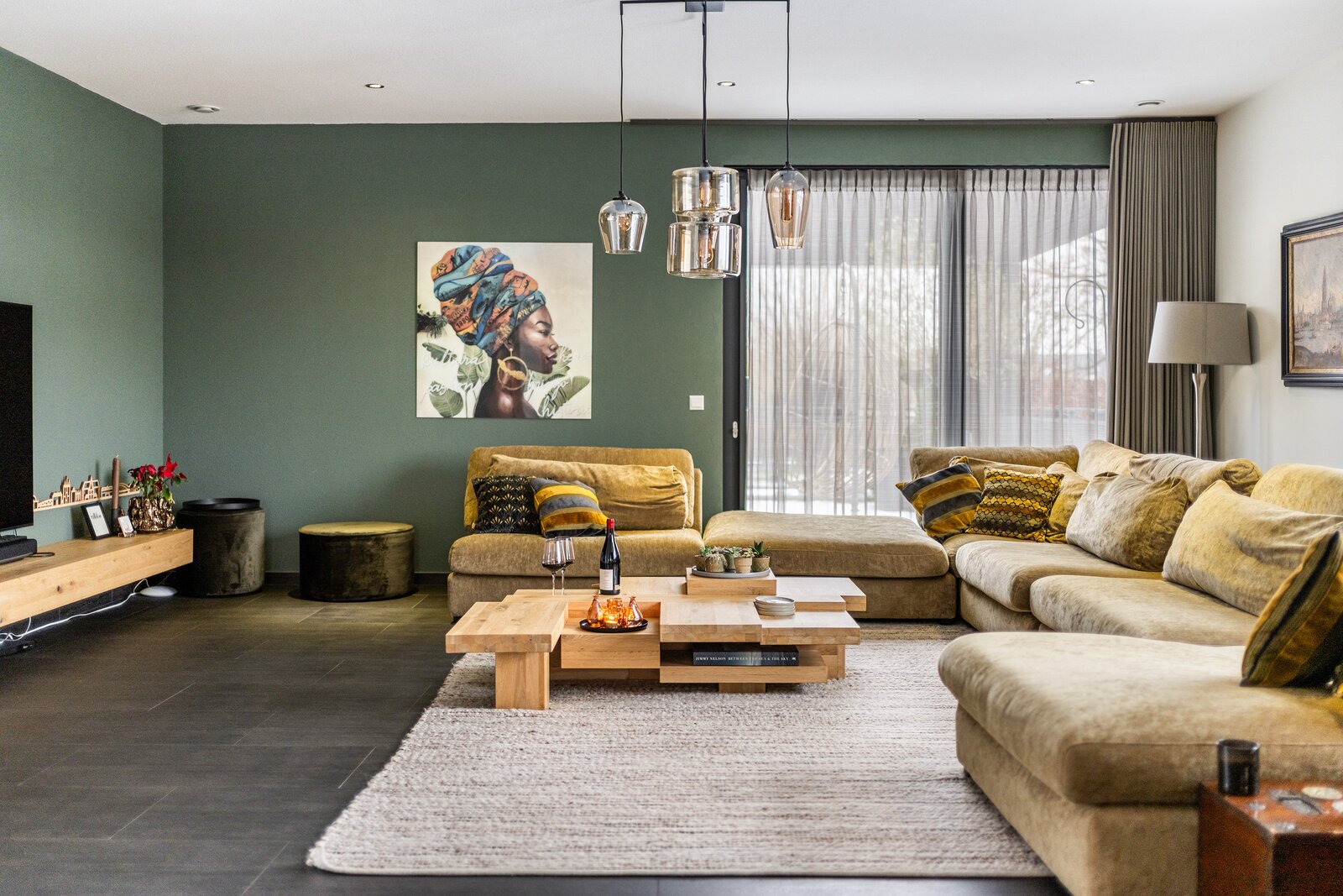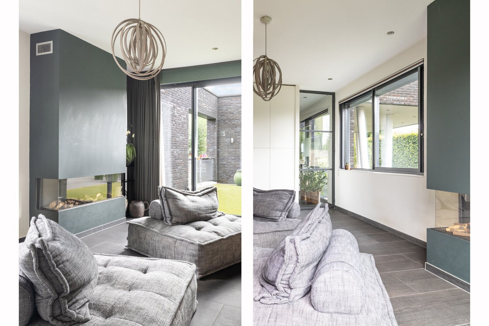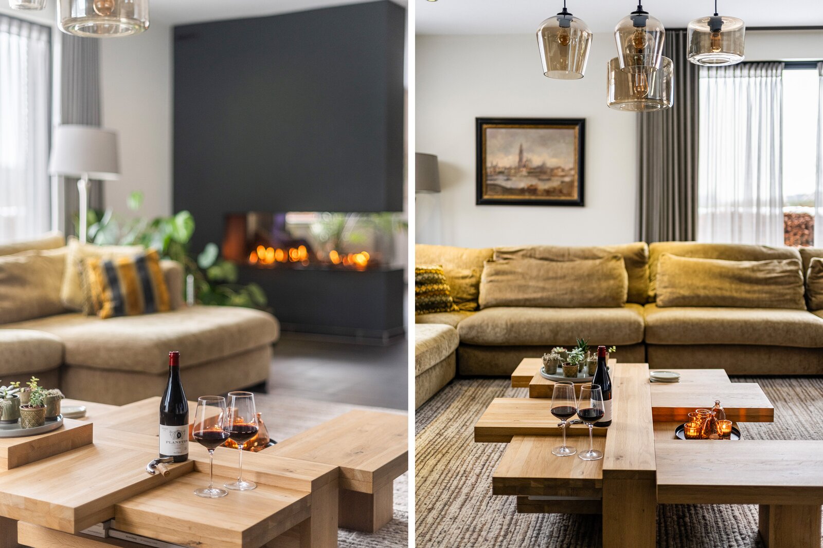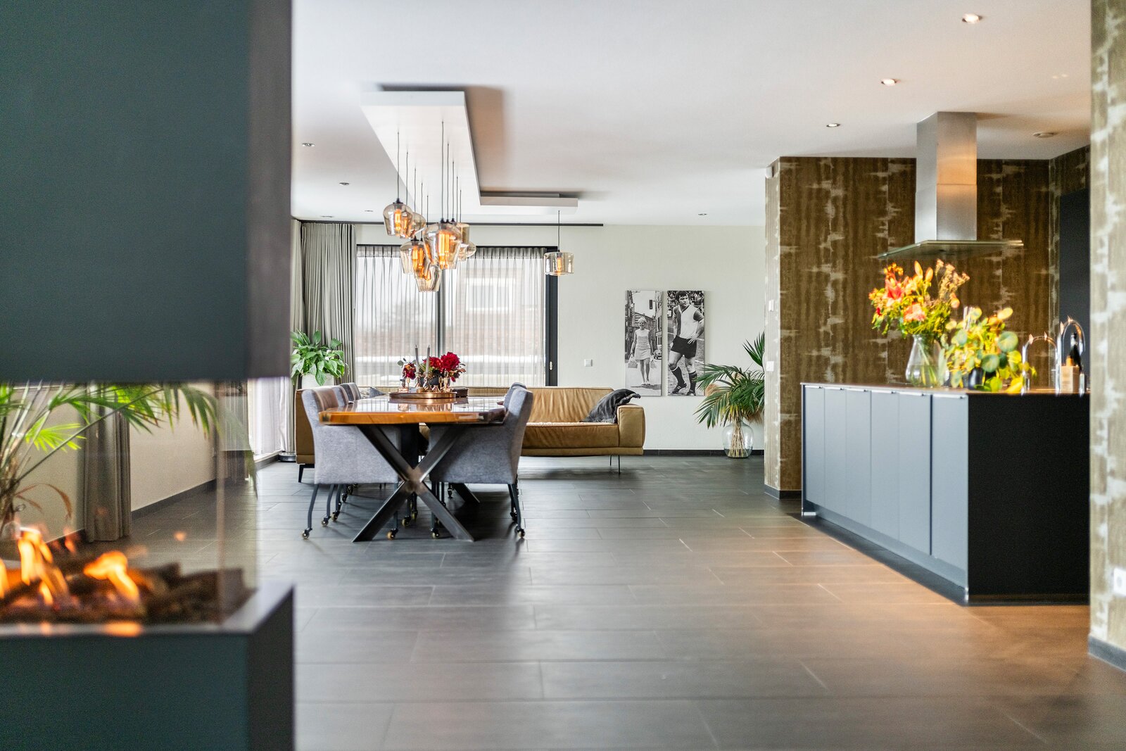 Op deze verdieping vind je het woongedeelte; met een riante living – uiteraard met haard – open licht, ruim en tegelijkertijd warm en uitnodigend. De leefruimte is sfeervol ondanks de grootte en goed in te delen. De woonkamer gaat over naar de open keuken met ruime eetkamer en er is een aparte tv-kamer, ook met haard. Beide woonkamers zijn voorzien van een schuifpui naar het terras aan de voorzijde en ook de eetkamer biedt toegang tot een fraai zonneterras.
