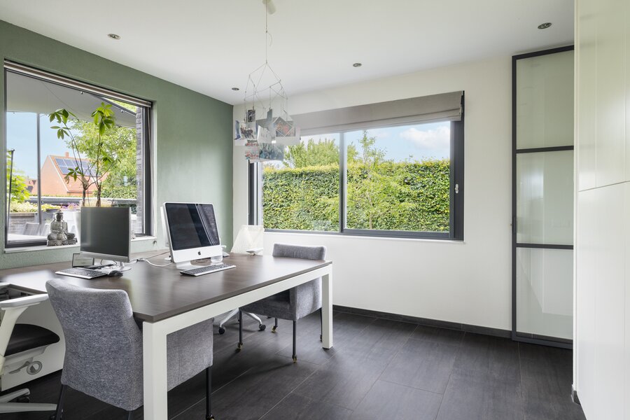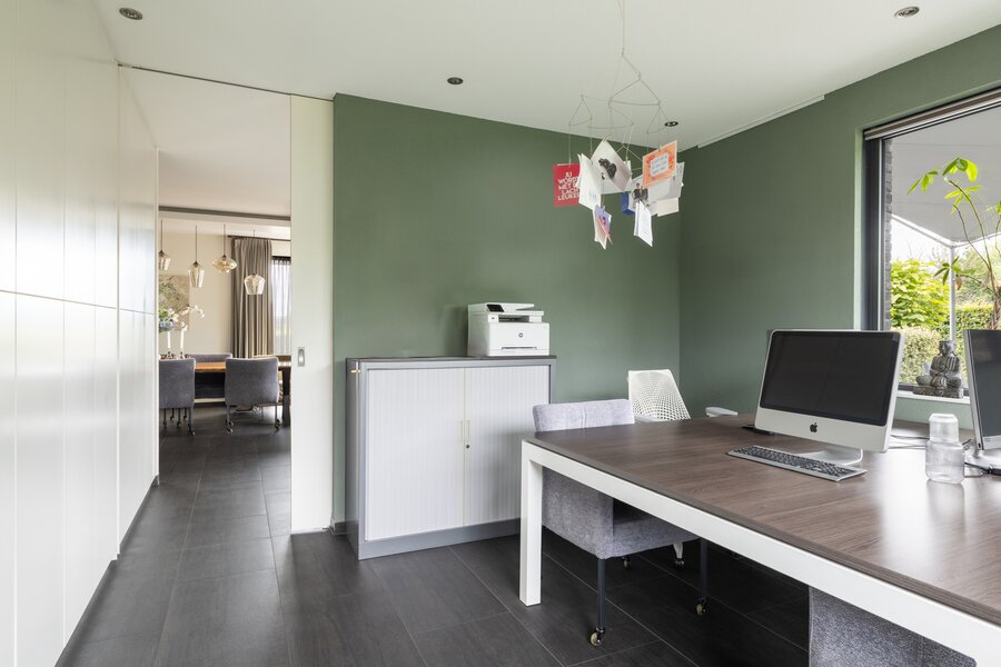De keuken centraal in de woning nodigt uit tot heerlijke avonden koken en genieten met elkaar. Er is genoeg werkblad op het kook- en spoeleiland, je beschikt over alle benodigde inbouwapparatuur en voldoende kastruimte. Het eetgedeelte vind je in het verlengde van de living wat ervoor zorgt dat de hele woonverdieping één geheel vormt. Dat biedt ruimte, maar ook rust en woongenot. De werkkamer is een af te sluiten extra kamer met genoeg kastruimte en veel licht door de vele ramen. Dit is een heerlijke plek, voor een kantoor, een atelier of speelkamer.