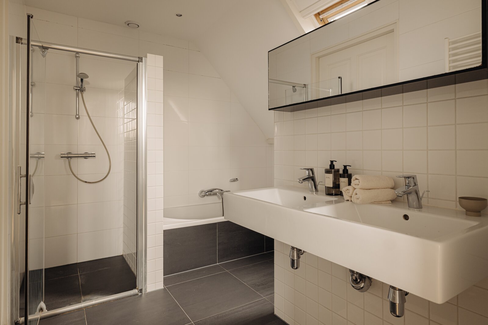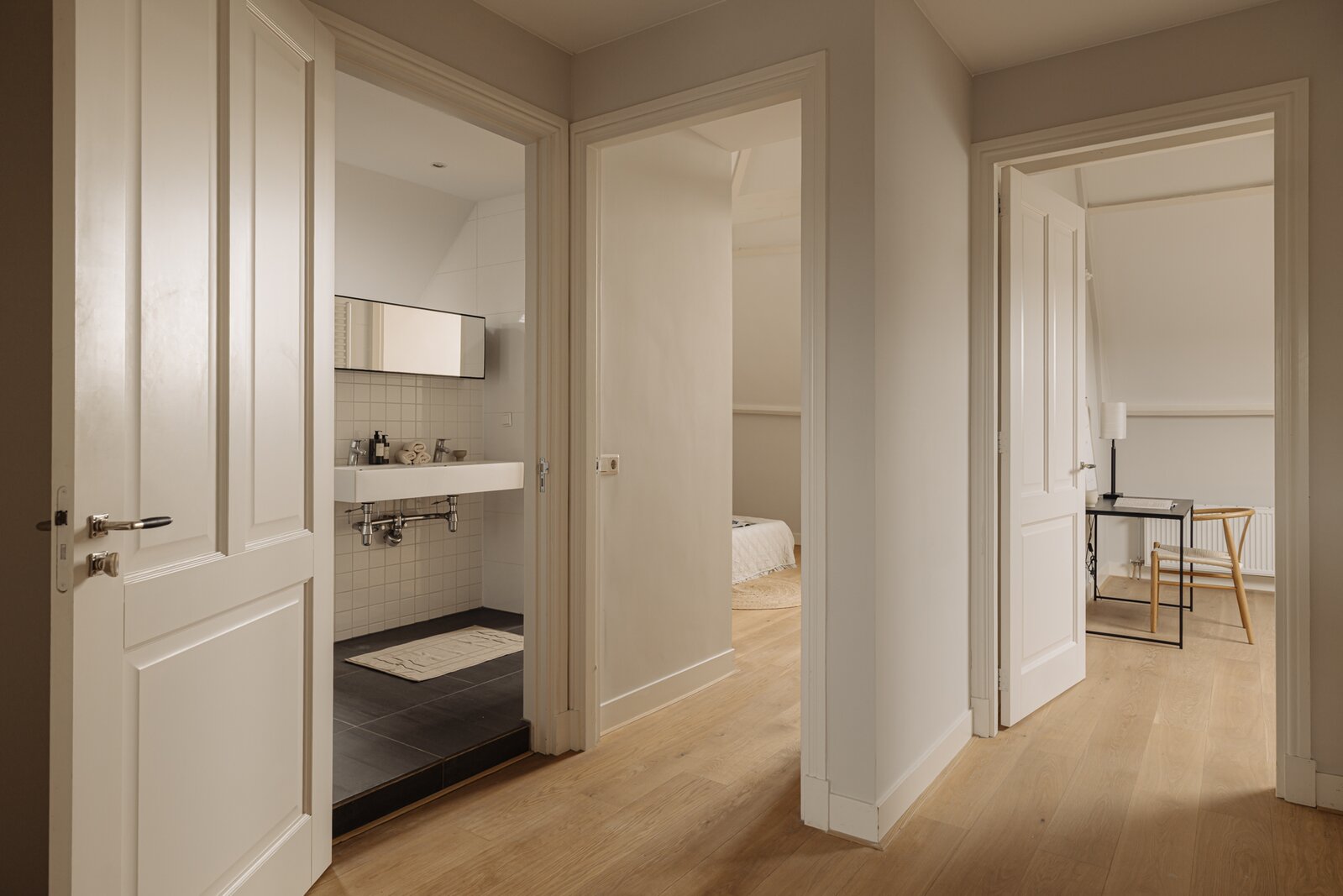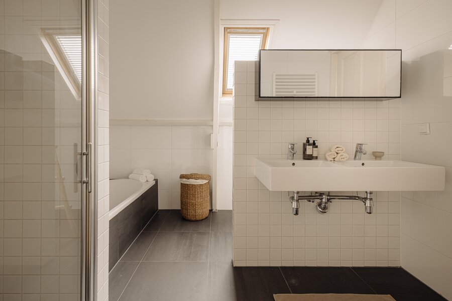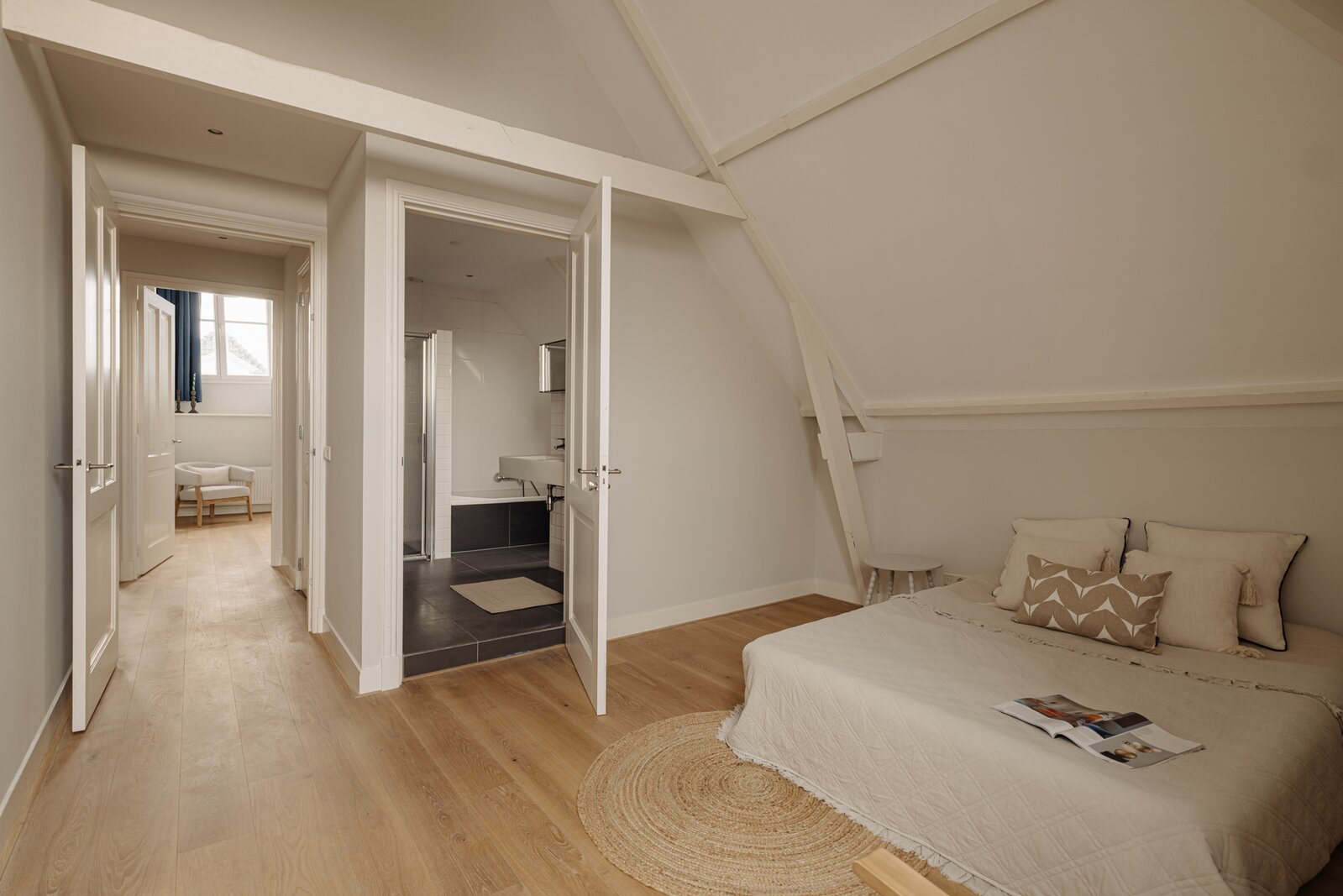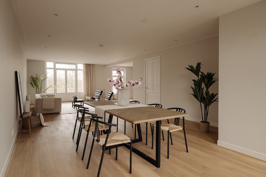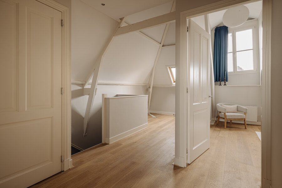 Communal entrance, stairs to the first floor. Private front door with access to the second floor. Spacious hallway with stairs to the top floor, plenty of built-in closets with storage space, a separate toilet, and a door to the spacious living area. Upon entering, you'll immediately notice the abundance of light that fills the apartment. At the front is the well-equipped kitchen with various built-in appliances. The rear offers ample space to create a cozy living room and (home) workspace. French doors open onto the approximately 10 m² balcony with unobstructed views and a sout-west-facing location, perfect for enjoying the afternoon and evening sun. The second floor features a spacious landing, three good-sized bedrooms, built-in wardrobes with storage space, a separate toilet, and a bathroom with a double sink, bathtub, shower, and connections for a washing machine and dryer. A hatch provides access to the attic with additional storage space.