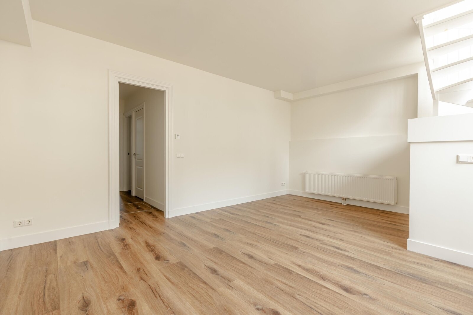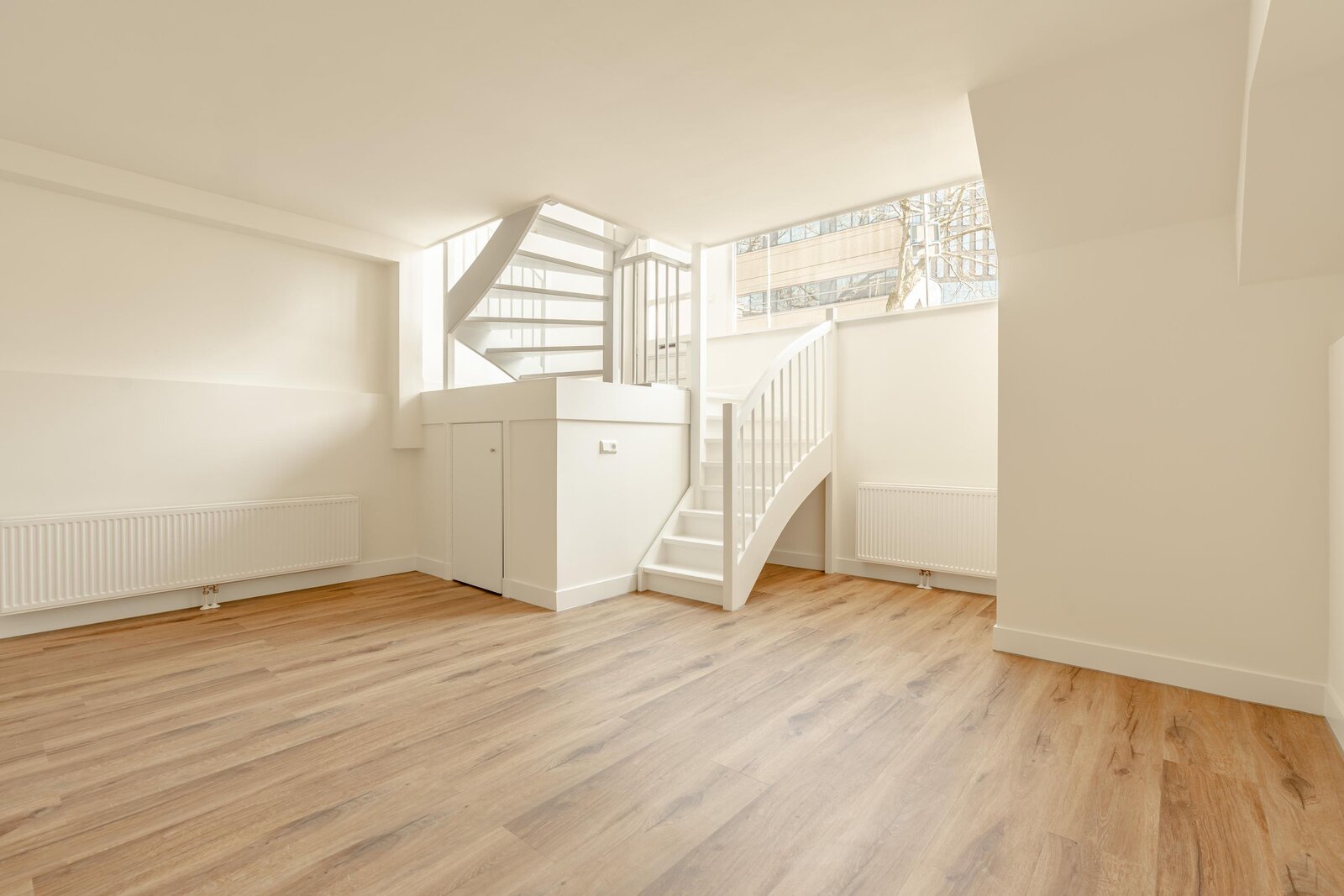 The apartment features a spacious and bright living room, which, thanks to the open staircase and large shopfront window, has a pleasant connection to the street and offers a beautiful view of the canal and Roeters Island. The open-plan kitchen, situated on the mezzanine level, is equipped with various built-in appliances and forms the heart of the home — ideal for families as well as for shared living with multiple occupants.