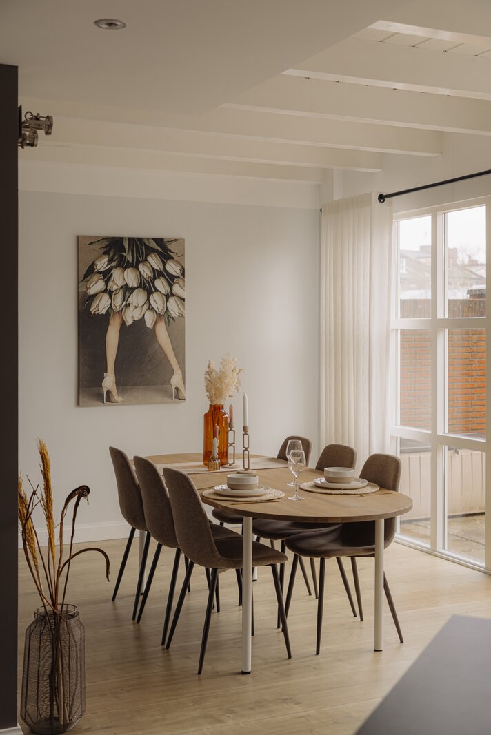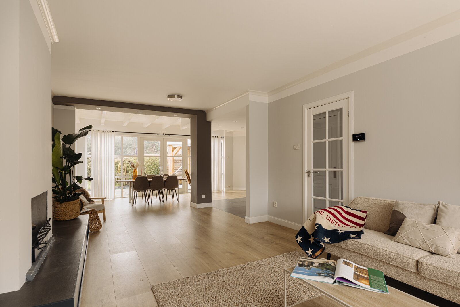 Ground floor: entrance, spacious hall with coat closet, modern toilet with hand basin, and under-stairs cupboard with meter cupboard. Very spacious living/dining room with beautiful flooring and a sleek plastered gas fireplace. From the dining area (with underfloor heating), large windows and a wide patio door open onto the sunny, covered back garden.