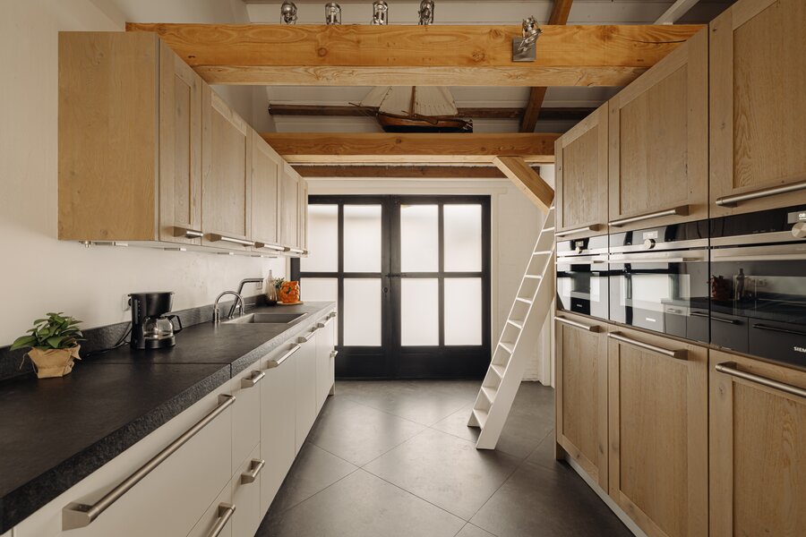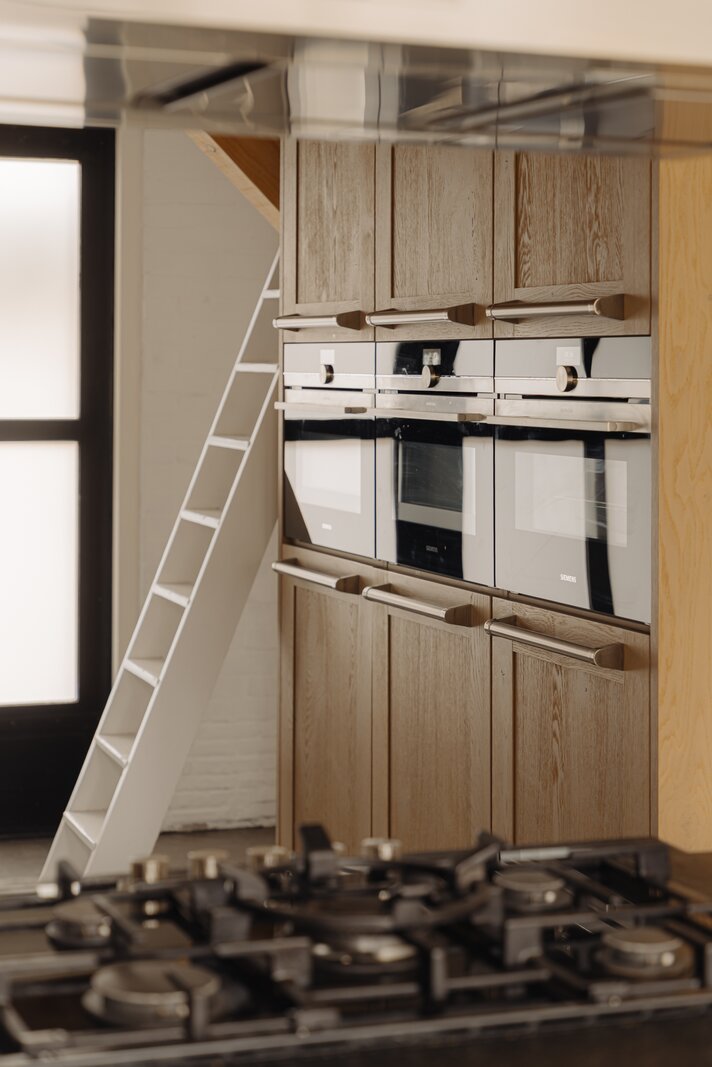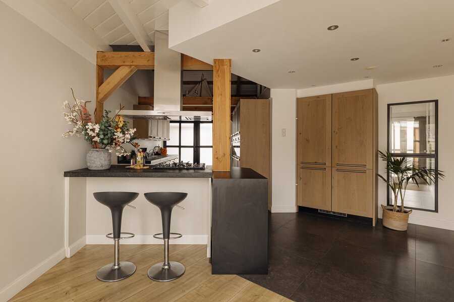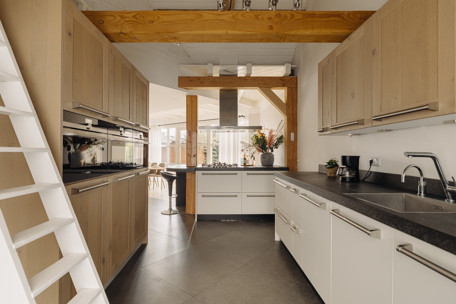 De luxe keuken is royaal opgezet en uitgerust met een bar, veel werk- en bergruimte en een vliering. De keuken is voorzien van hoogwaardige Siemens inbouwapparatuur, waaronder drie ovens (stoom-, hetelucht- en combi-oven), een hoge koelkast en hoge vriezer, een vaatwasser en een Quooker. Aansluitend bevindt zich de praktische pantry met wasmachine- en drogeropstelling en extra bergruimte.