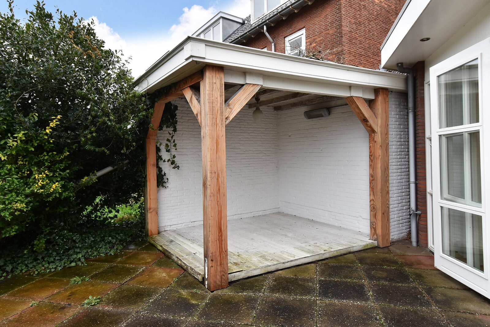 Aan de zijkant van het perceel bevindt zich een carport met parkeergelegenheid op eigen terrein. De voortuin biedt ruimte voor een zitje met uitzicht over het plantsoen. De meer dan 28 meter diepe achtertuin, gelegen op het zuidwesten, beschikt over een achterom en een prieel/overkapping waar u tot in de late uurtjes van het buitenleven kunt genieten.