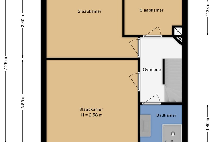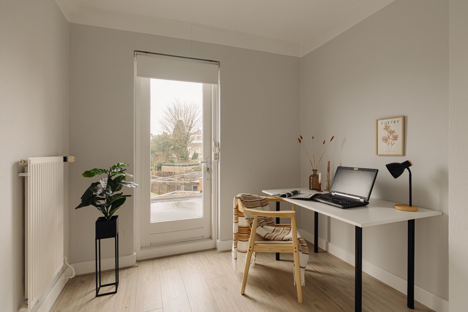 Overloop, slaapkamer aan de voorzijde met airco, nieuwe kozijnen en vrij uitzicht over het plantsoen. Ruime slaapkamer aan de achterzijde en een derde slaapkamer aan de achter-/zijkant met toegang tot het balkon. Moderne en complete badkamer met inloopdouche, toilet en dubbele wastafel met meubel.