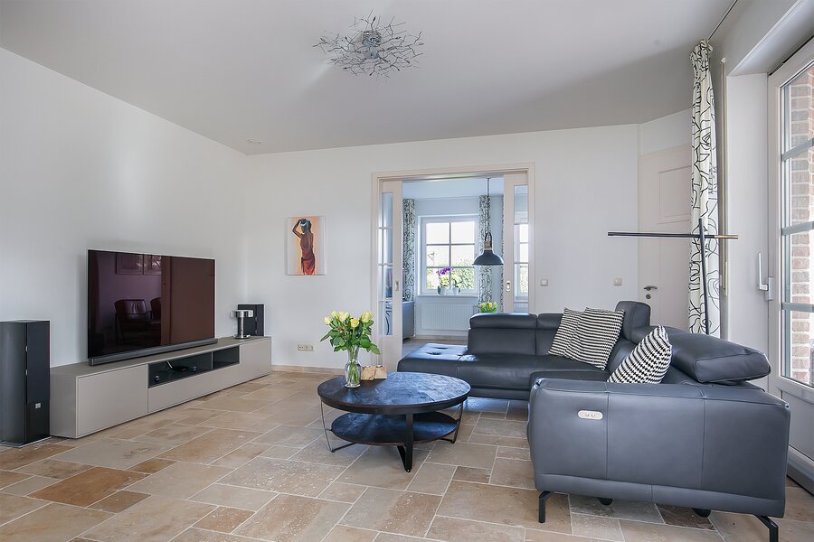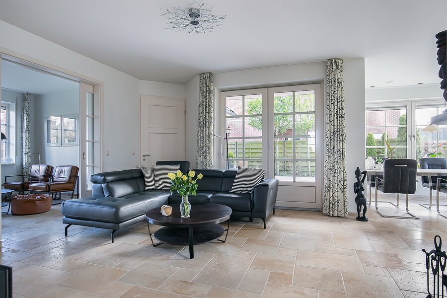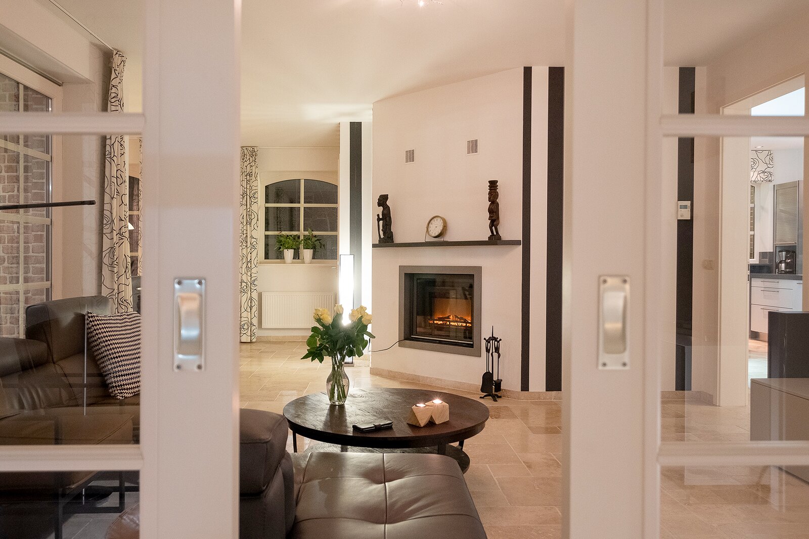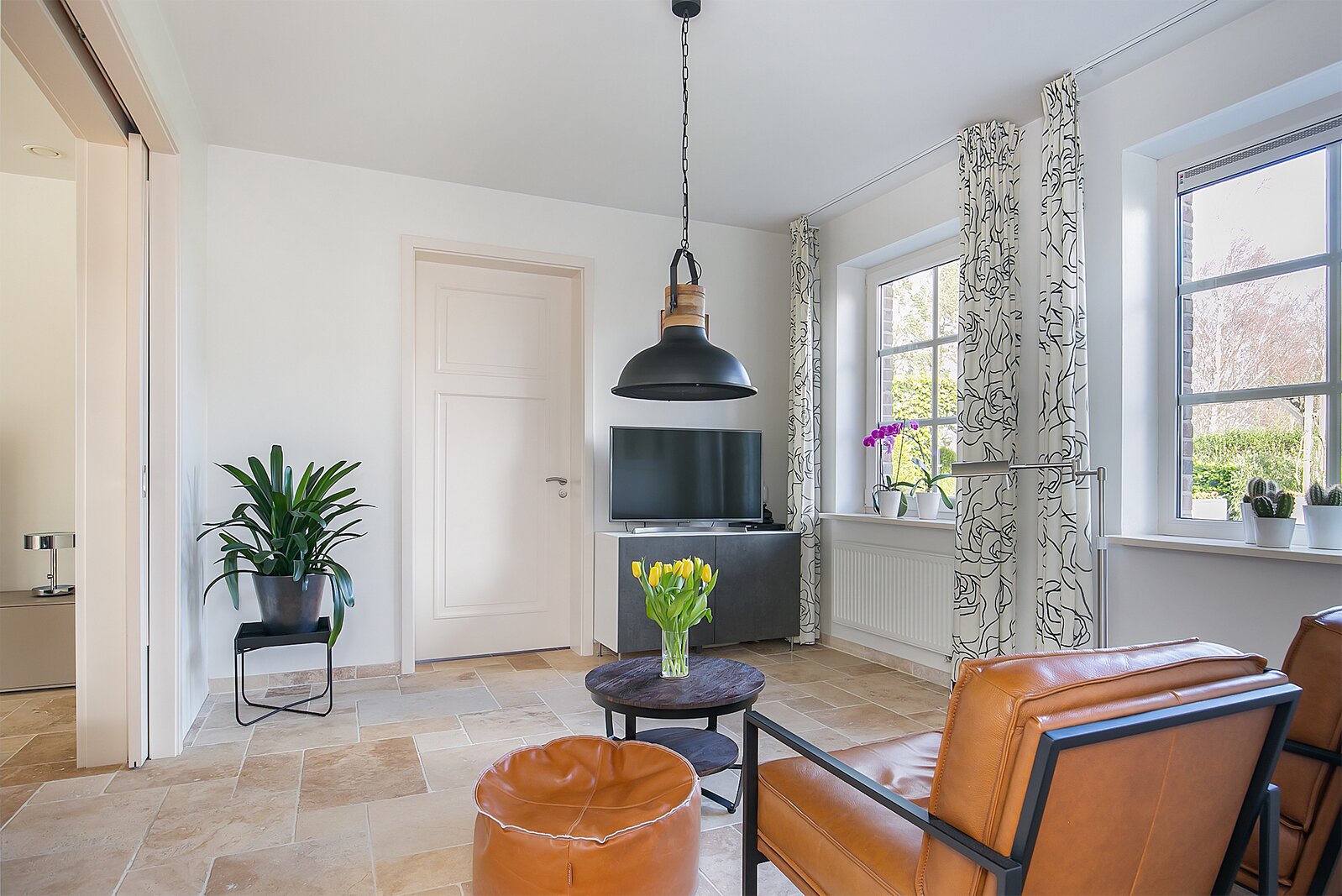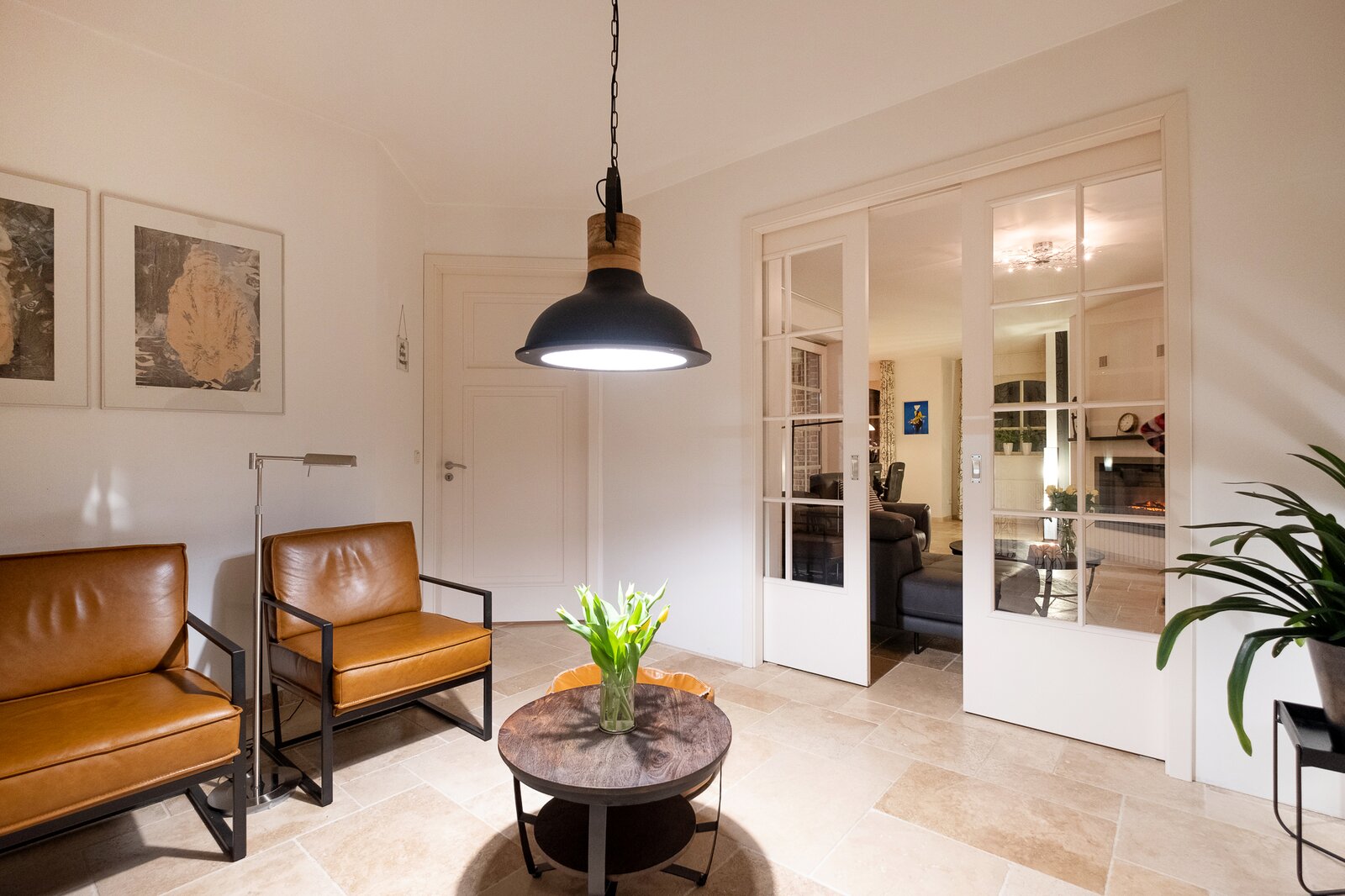 Entree in hal, royale woonkamer met schuifpui naar de tuin, inbouwhaard en suitedeuren naar een separate TV-kamer die ook goed als slaapkamer is te gebruiken.