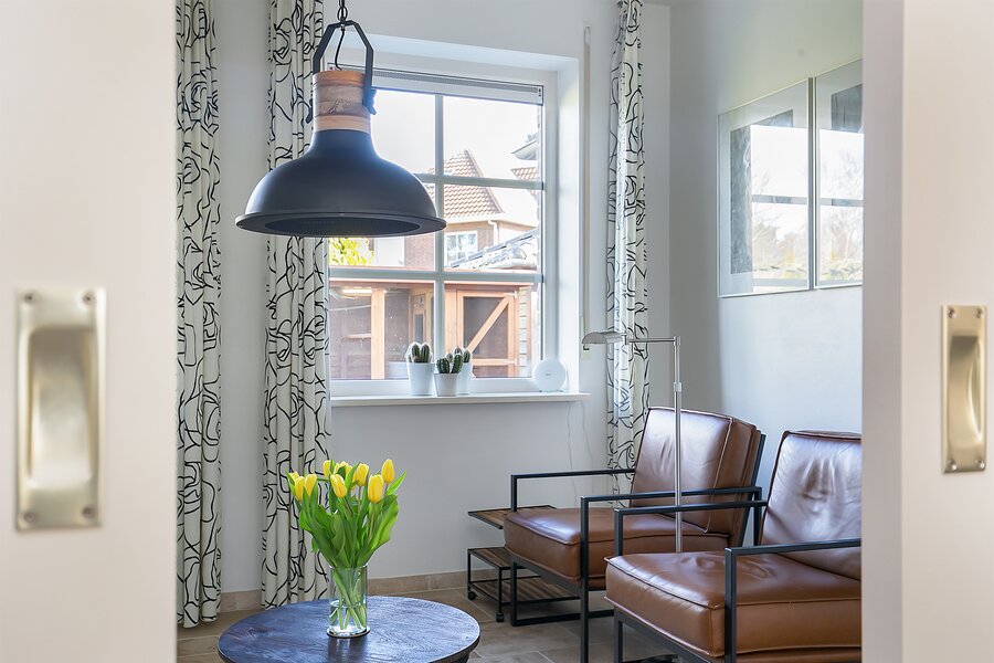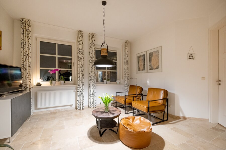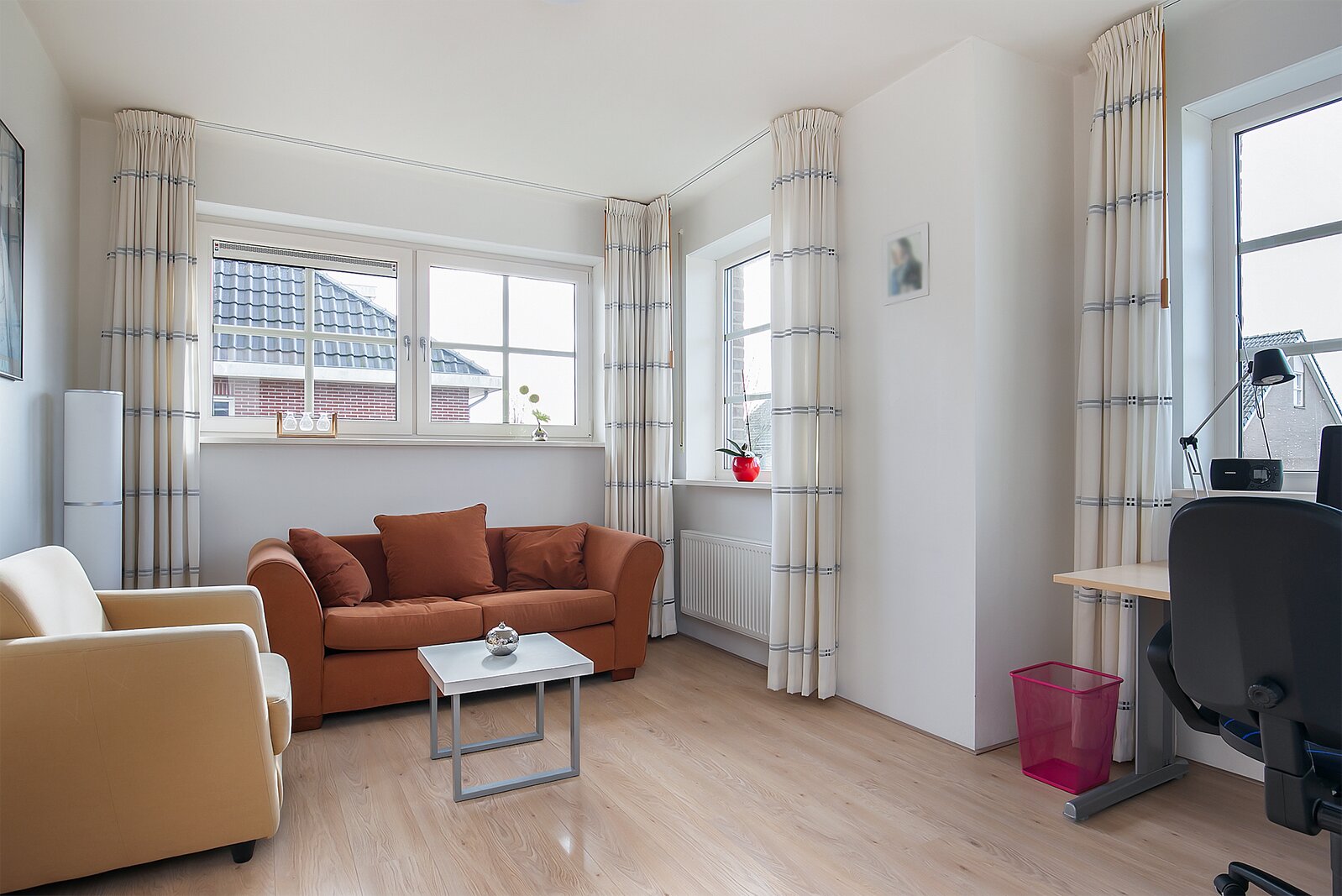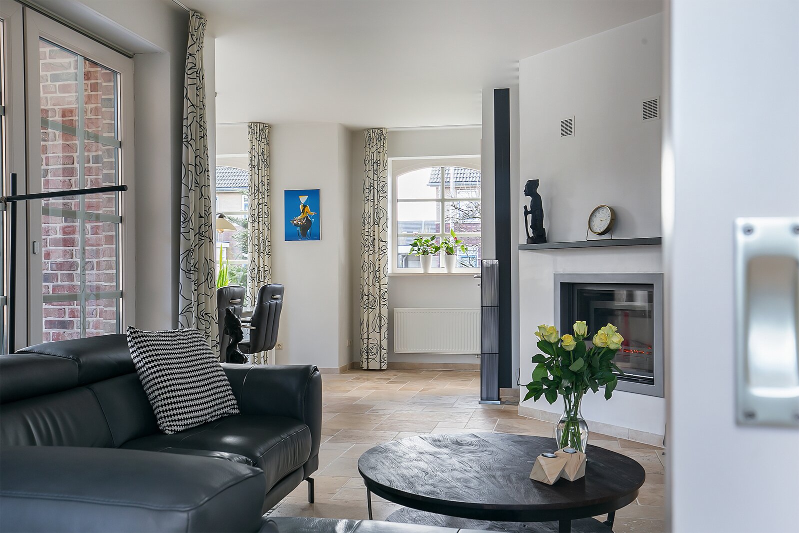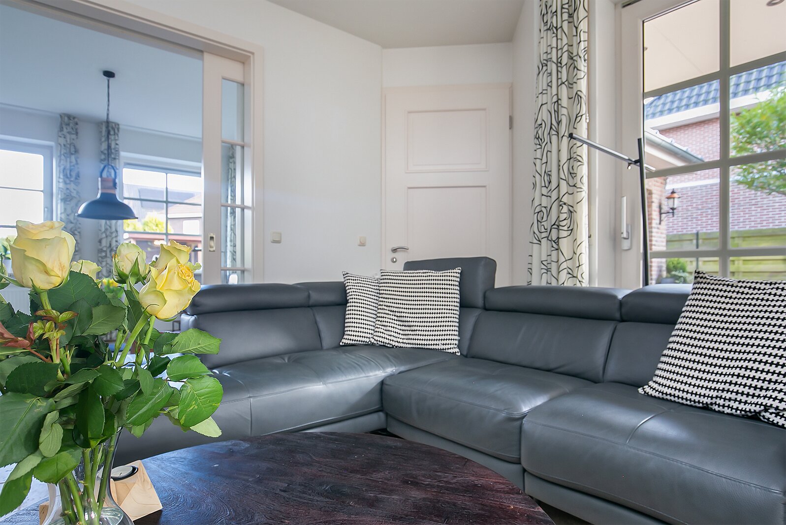 Entree in hal, royale woonkamer met schuifpui naar de tuin, inbouwhaard en suitedeuren naar een separate TV-kamer die ook goed als slaapkamer is te gebruiken.
