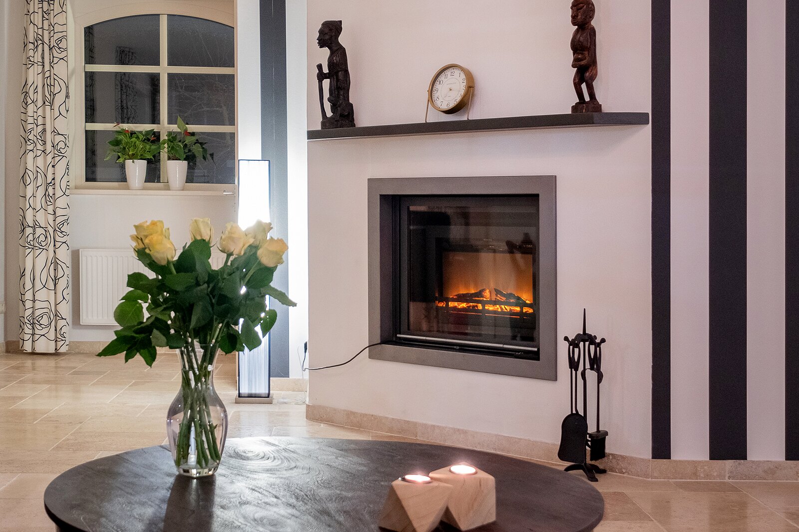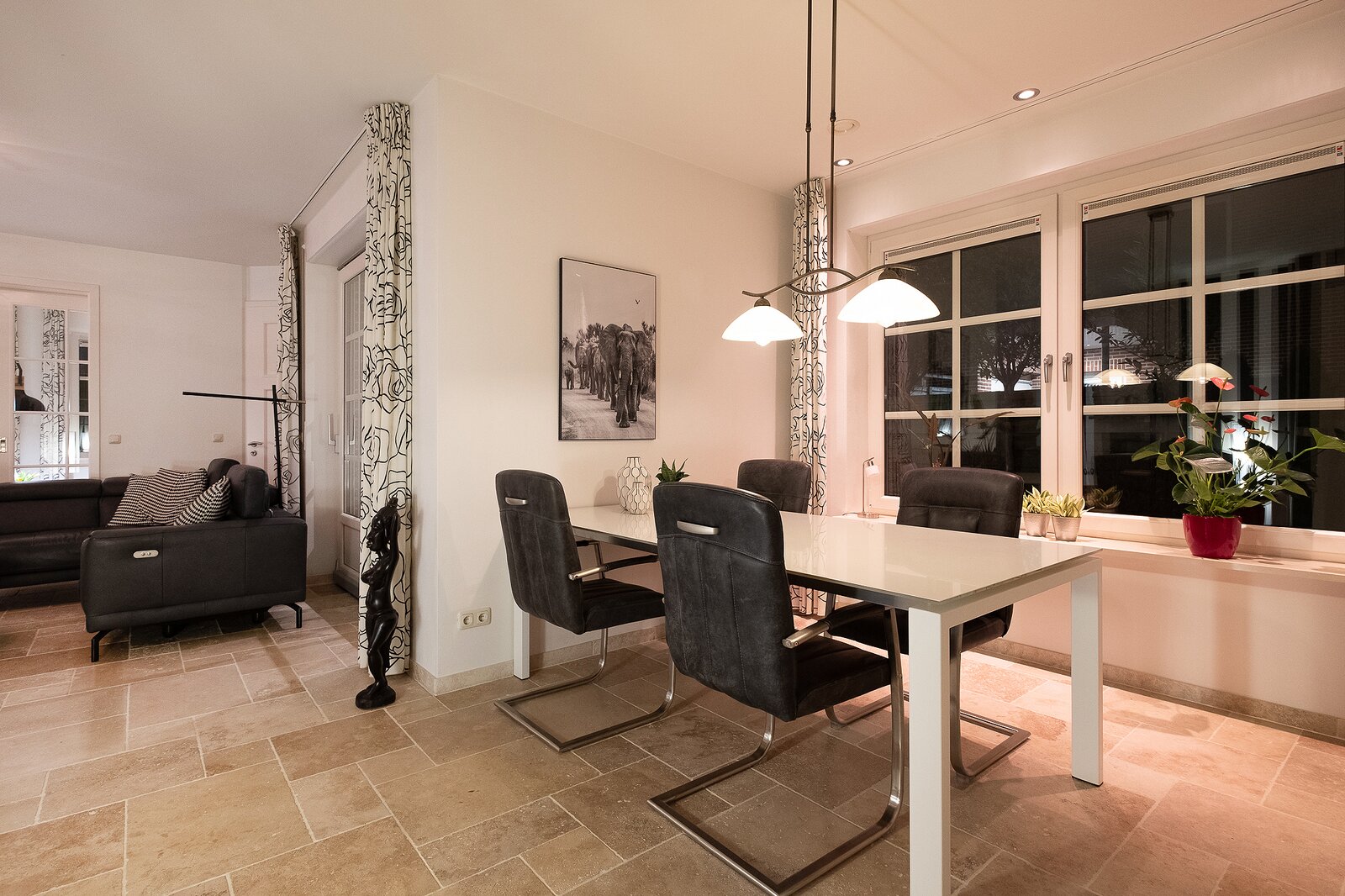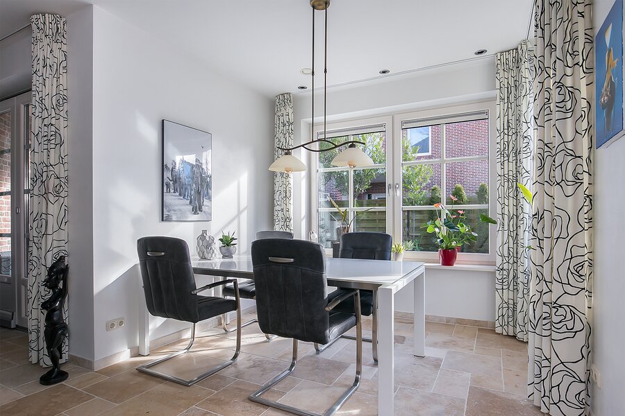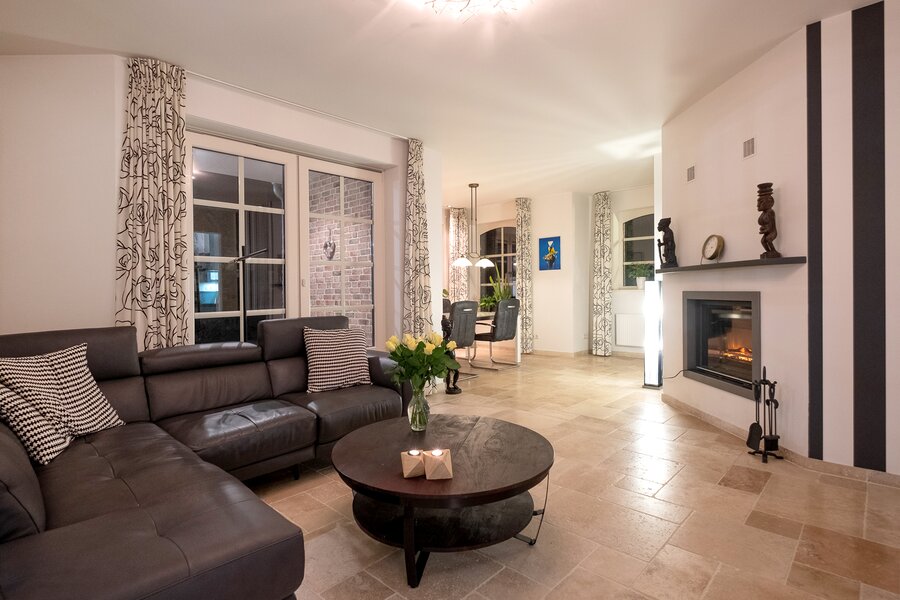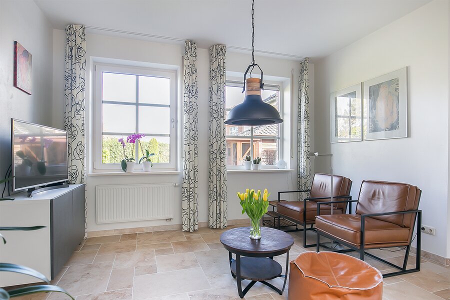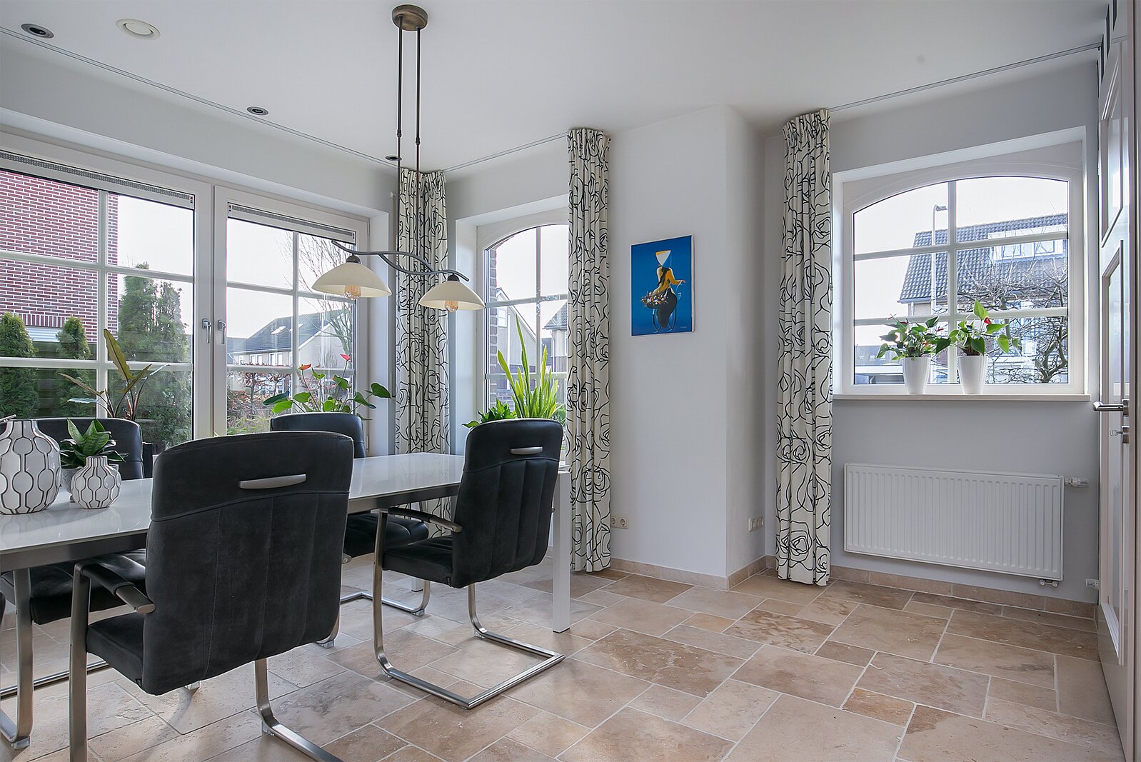 Entree in hal, royale woonkamer met schuifpui naar de tuin, inbouwhaard en suitedeuren naar een separate TV-kamer die ook goed als slaapkamer is te gebruiken.