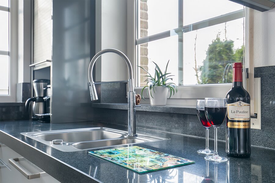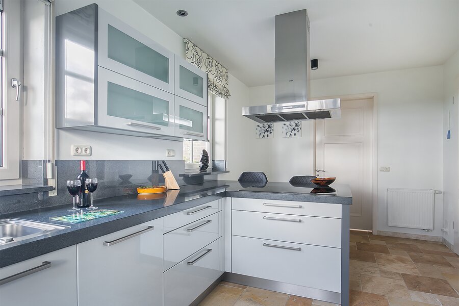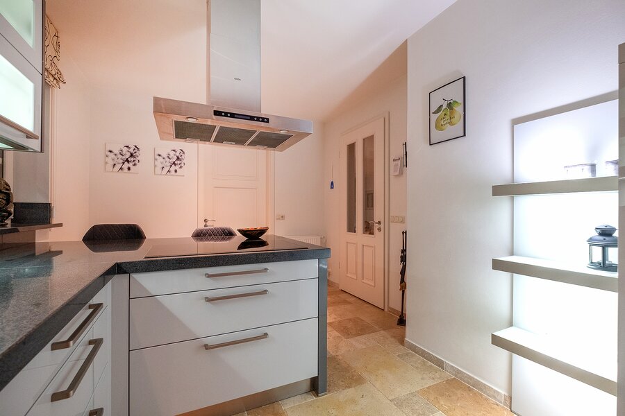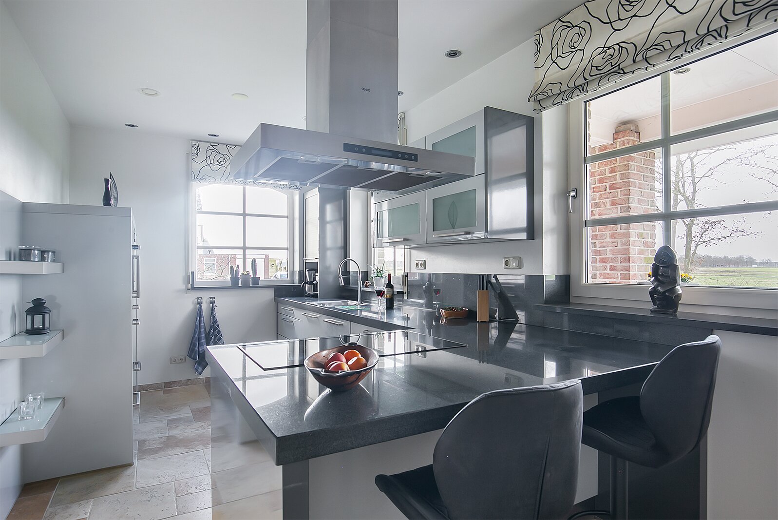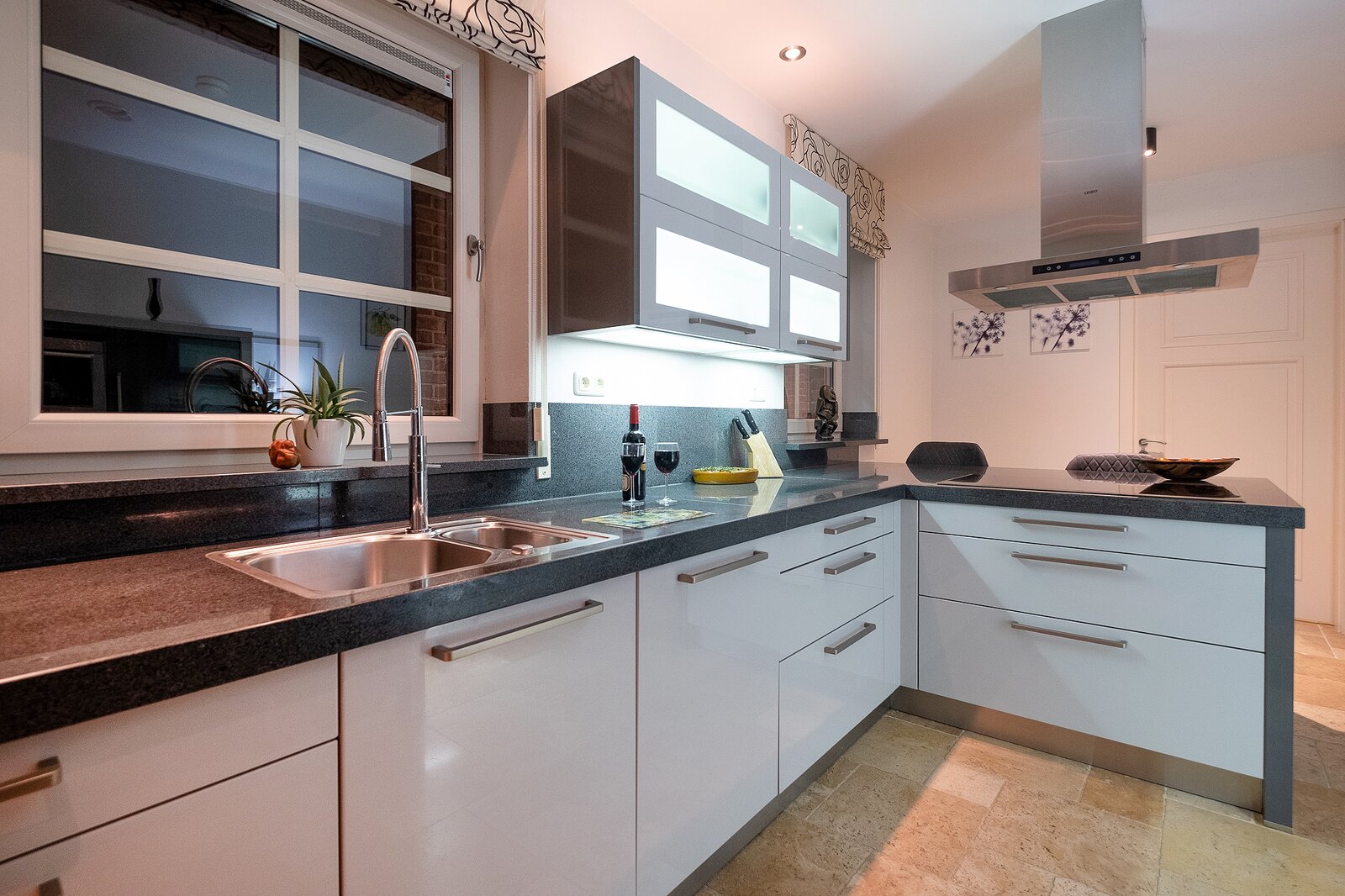Luxe keuken met 'Next 125' design opstelling voorzien van een hardstenen blad en diverse 'Siemens' inbouwapparatuur zoals een vaatwasser, koelkast, combi-oven, inductie kookplaat en afzuigkap. Royale en moderne badkamer met dubbele wastafel, bidet, hangcloset, stortdouche en ligbad.