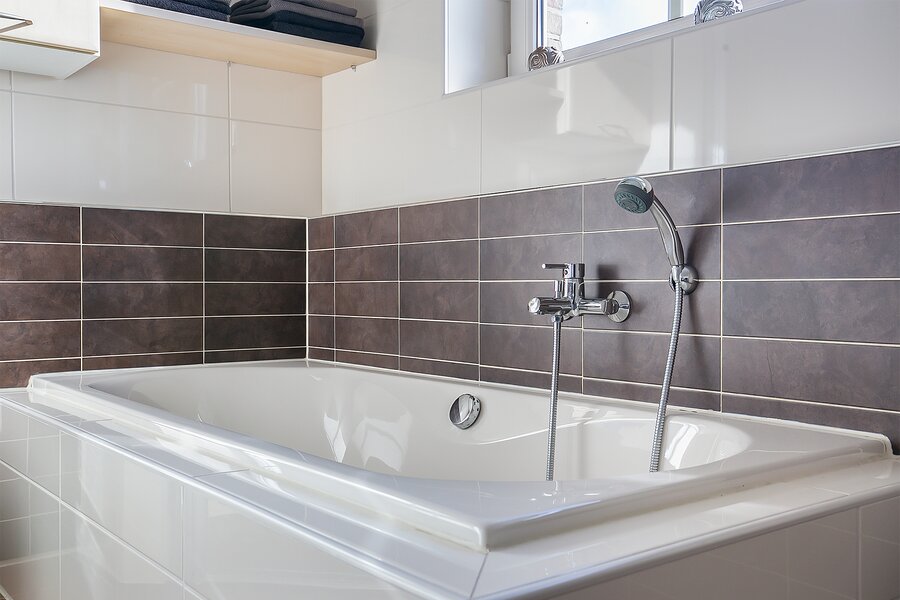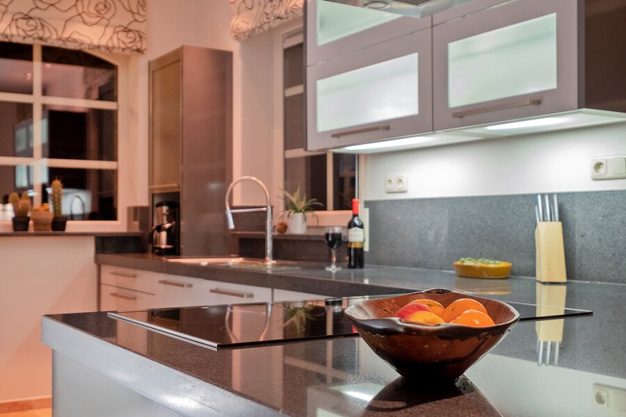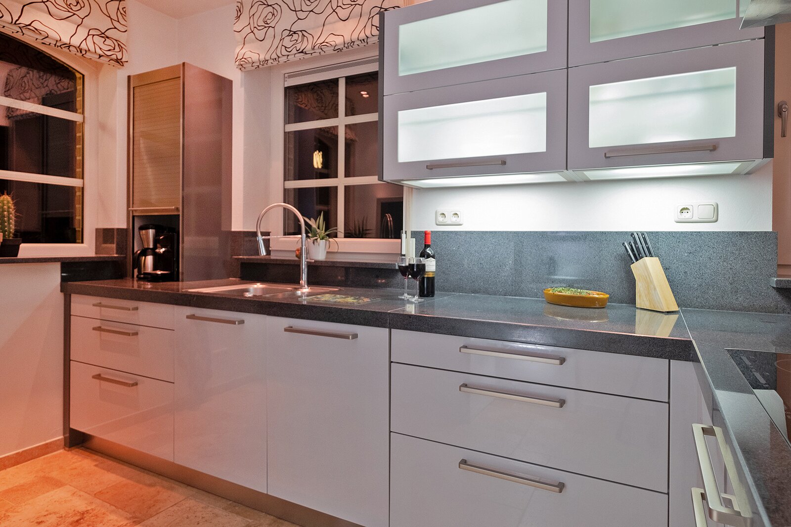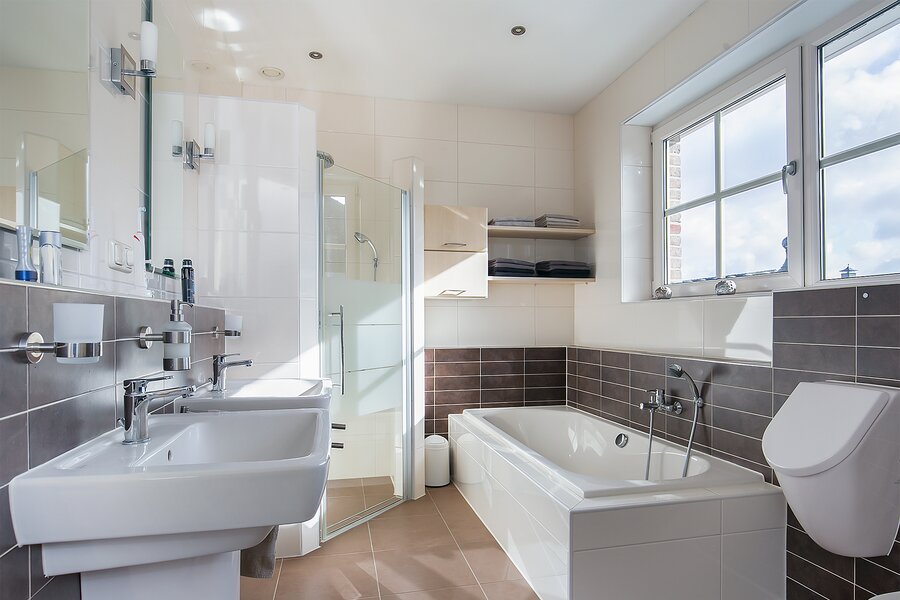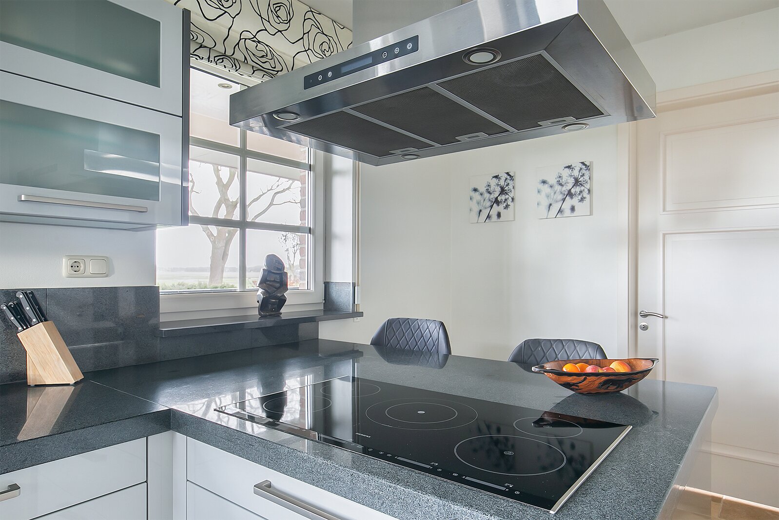 Luxe keuken met 'Next 125' design opstelling voorzien van een hardstenen blad en diverse 'Siemens' inbouwapparatuur zoals een vaatwasser, koelkast, combi-oven, inductie kookplaat en afzuigkap. Royale en moderne badkamer met dubbele wastafel, bidet, hangcloset, stortdouche en ligbad.