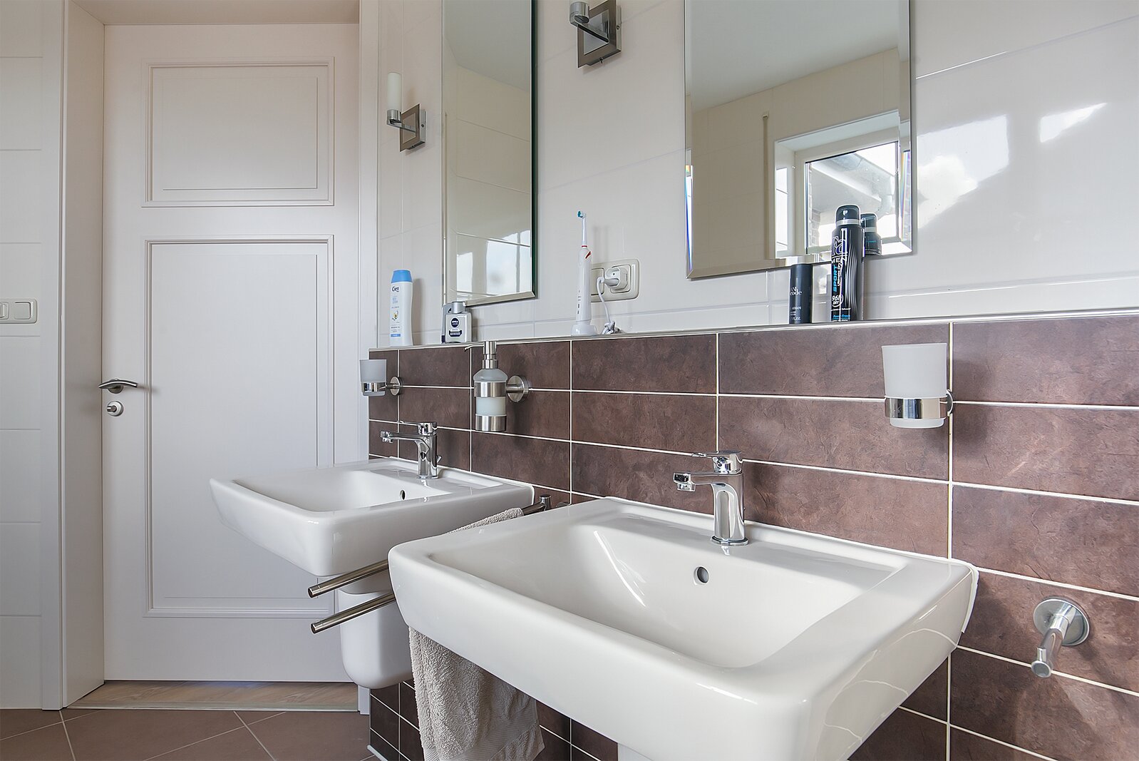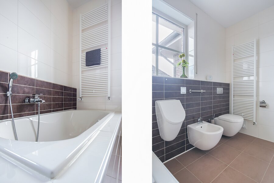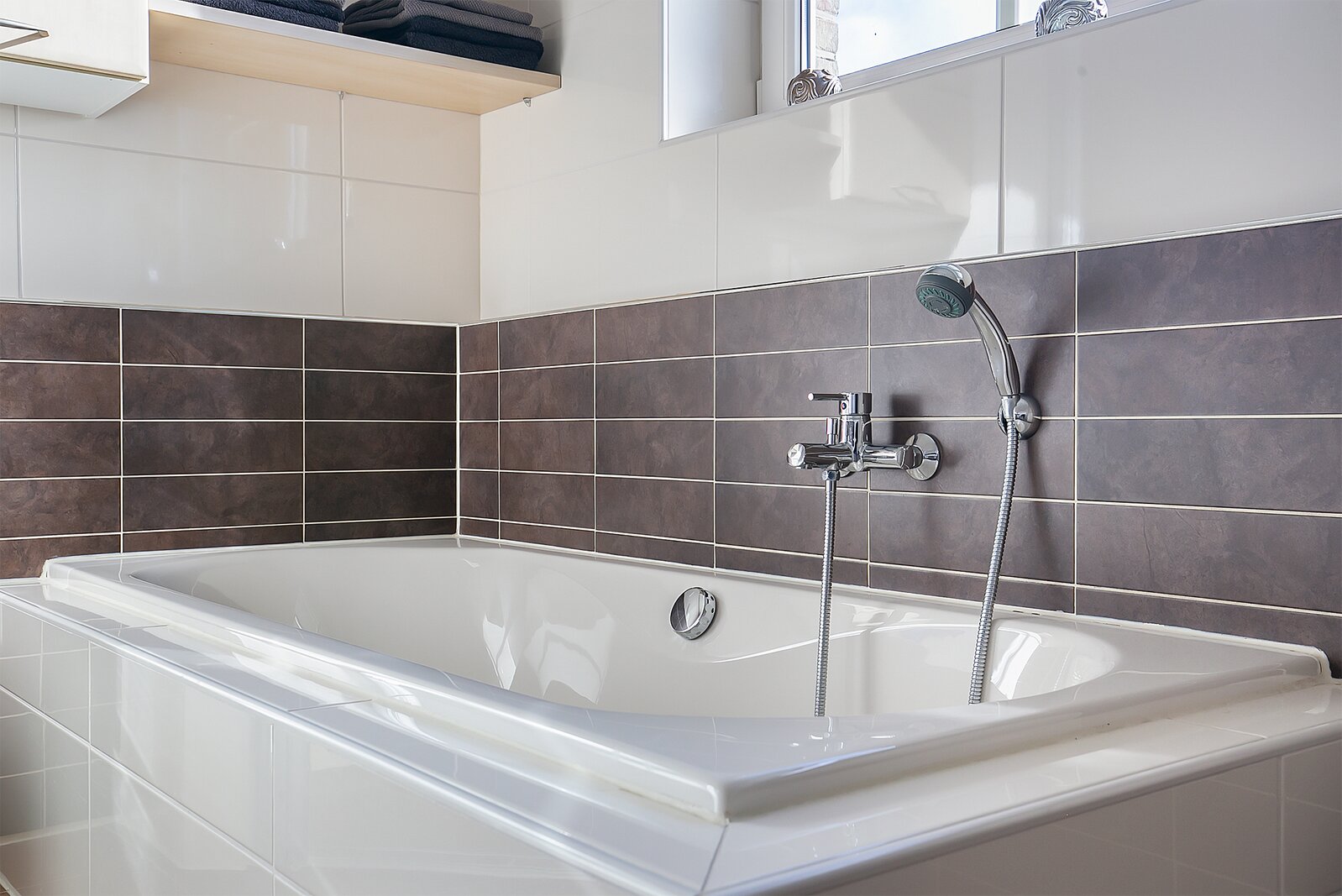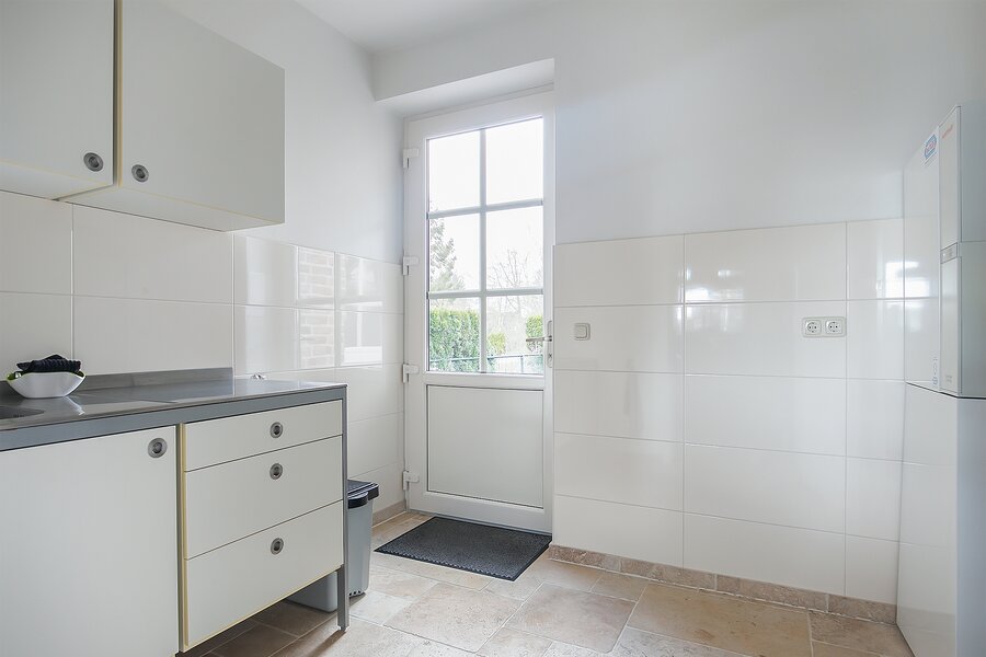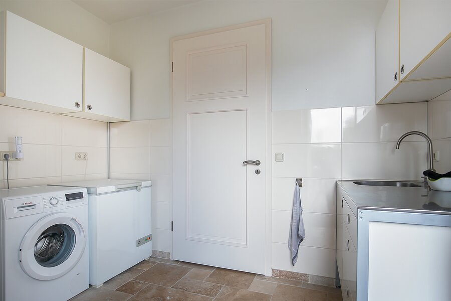 Bijkeuken met keukenblok, witgoedaansluitingen, CV-opstelling en tuindeur naar terras. Tussenhal met apart toilet met urinoir, hangcloset en wastafel. Vanuit de tussenhal is er toegang tot de garage.