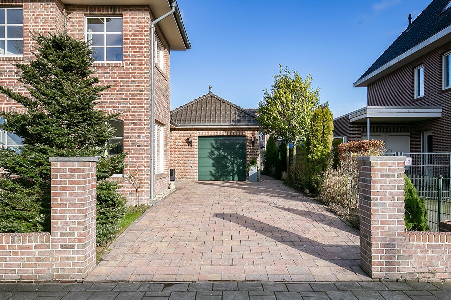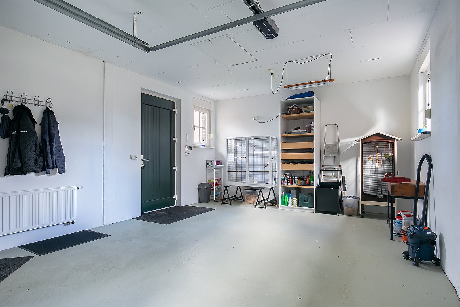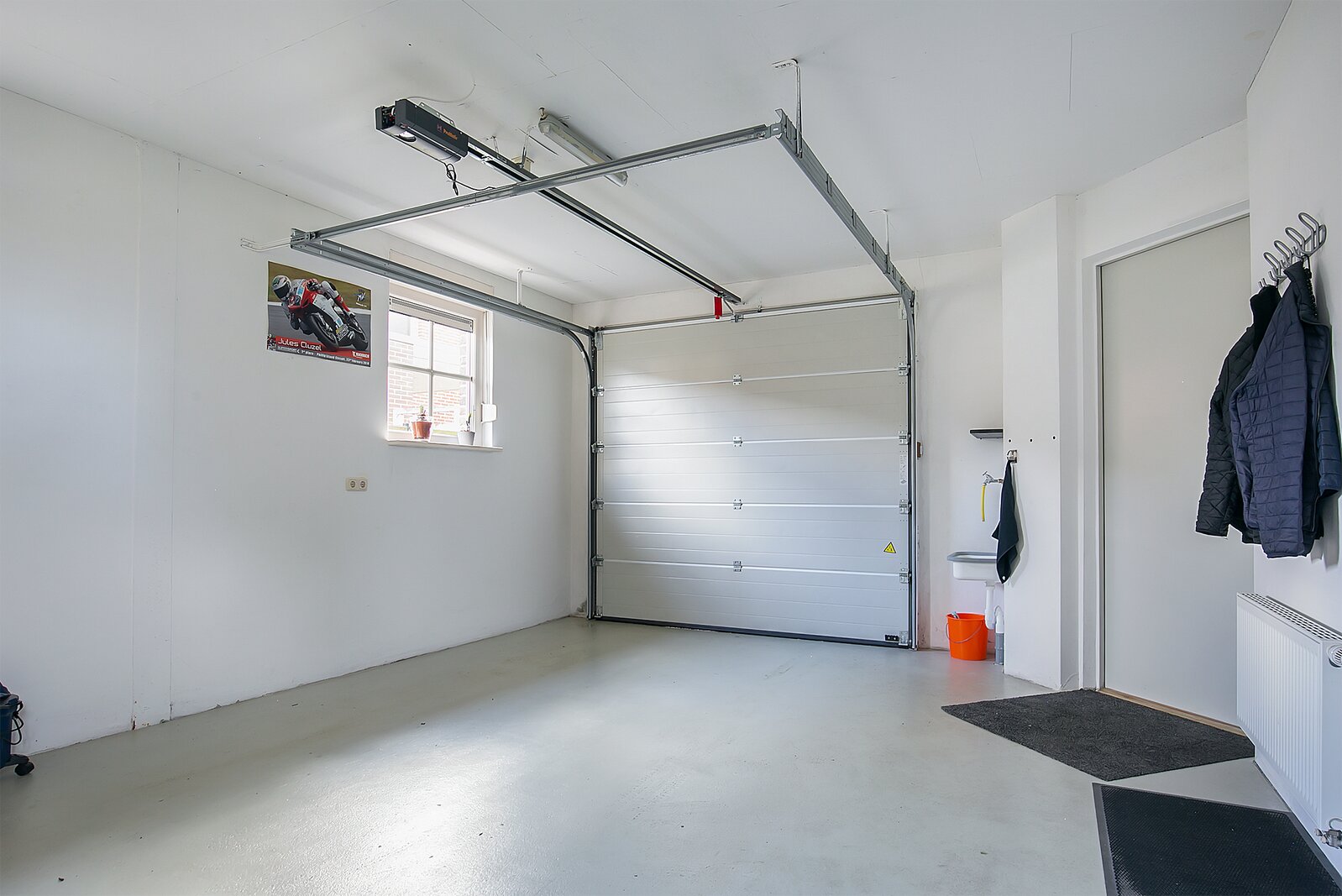 De garage is geïsoleerd en voorzien van water, elektra, verwarming een elektrische sectionaal deur en een vliering.