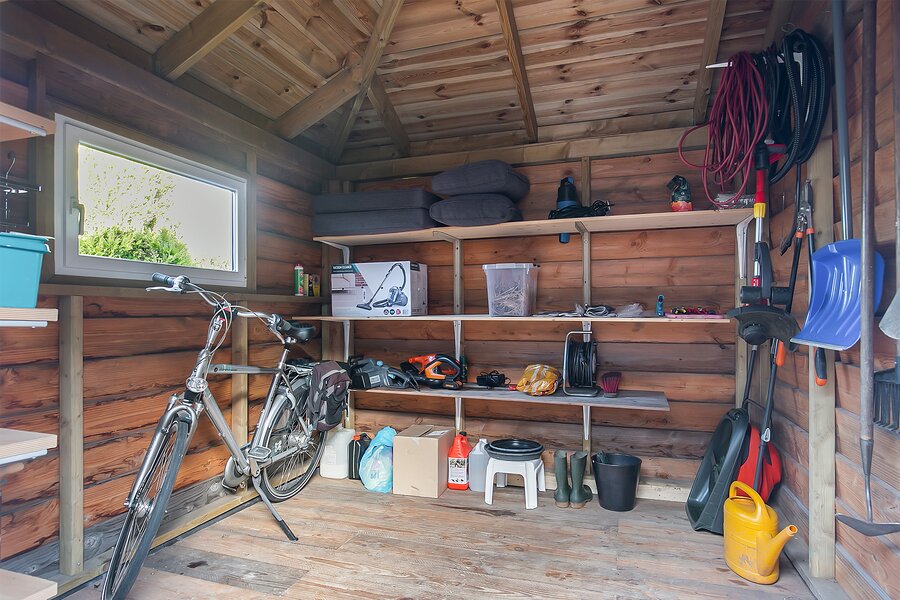 Houten kapschuur met een apart gedeelte voor houtopslag en een afsluitbare berging.