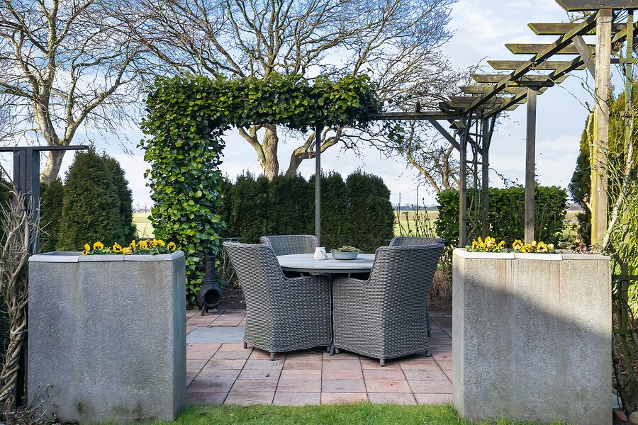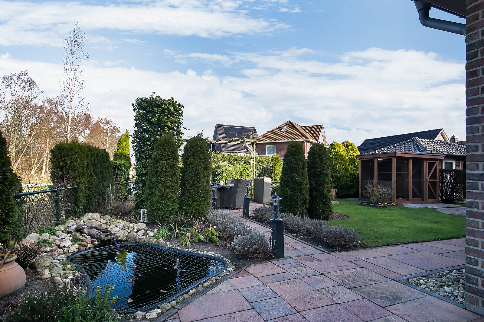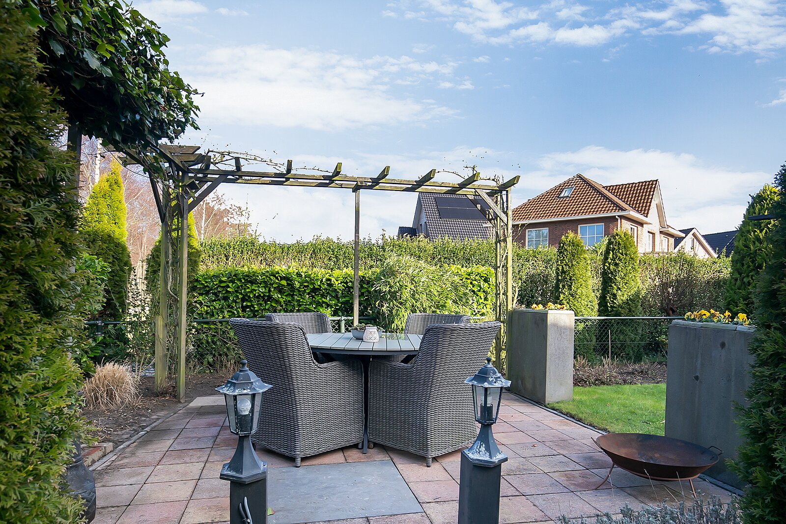 Fraai aangelegde tuin rondom met meerdere terrassen.