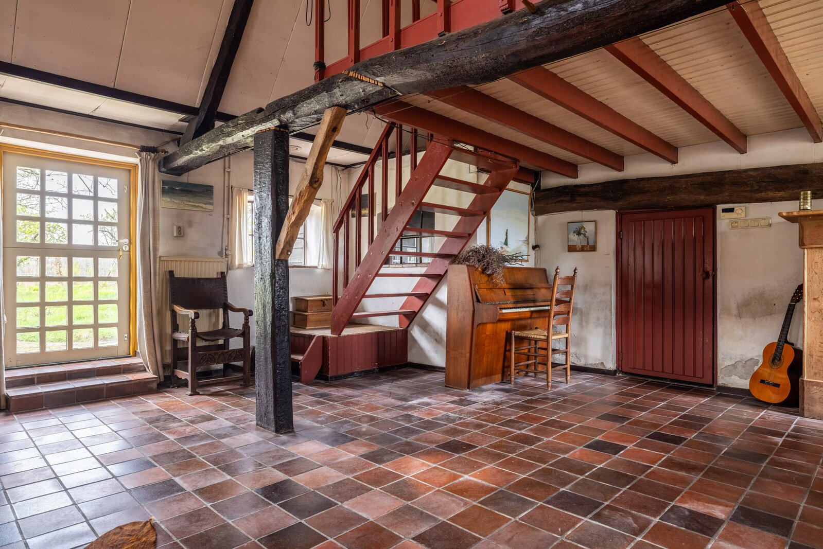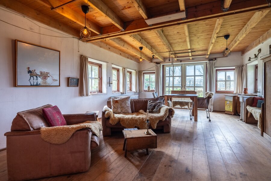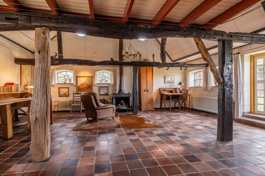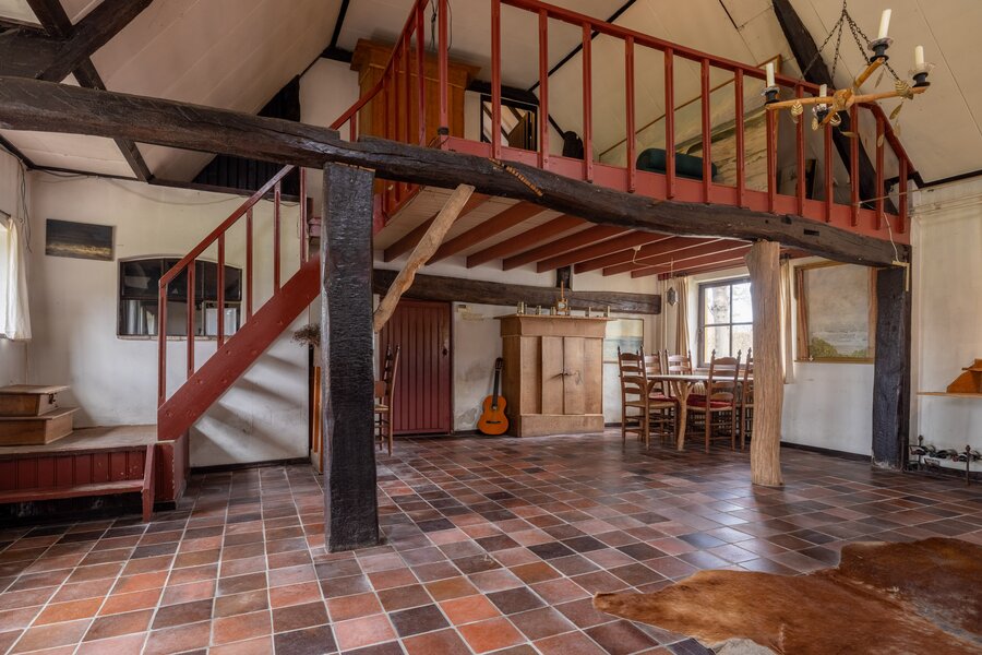 Aansluitend aan het voorhuis bevindt zich het voormalige stalgedeelte, dat momenteel in gebruik is als woonkamer. Hier ontvouwt zich een sfeervolle en bijzonder ruime eet-/woonkamer met plavuizenvloer, een vide tot in de nok en zichtbare houten constructiebalken. De karakteristieke stalraampjes zorgen voor een fraaie lichtinval, terwijl de houtkachel warmte en geborgenheid toevoegt. De hoogte, indeling en authentieke elementen maken dit tot een ruimte met karakter én potentie – een plek waar uiteenlopende woonwensen tot leven kunnen komen.