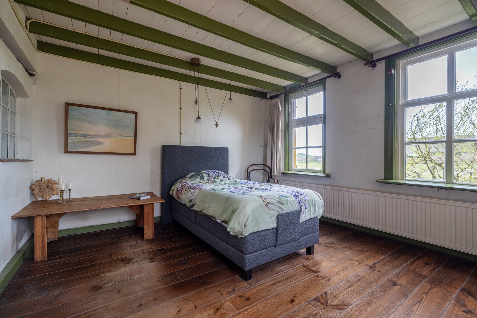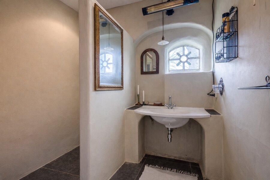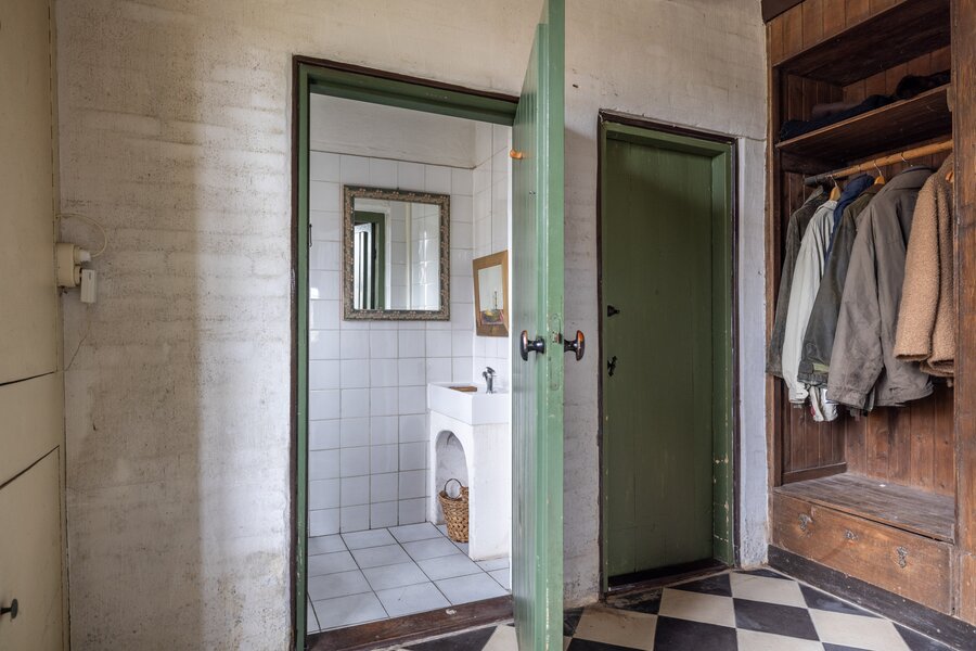 Aansluitend aan de keukenkamer bevindt zich de ontvangsthal. Vanuit hier bereik je de (slaap)kamer aan de voorzijde – de ‘goeikamer’ – voorzien van een vaste kastenwand. In de hal bevinden zich naast elkaar het toilet en een eenvoudige badkamer met douche en wastafel. Tevens is er een praktische opstelplaats voor de wasapparatuur in de bijkeuken naast de keuken.