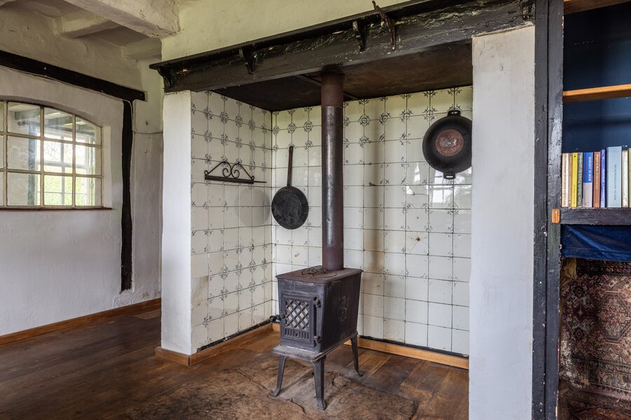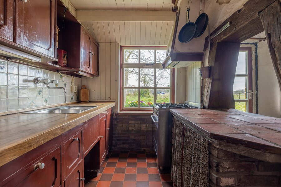 De keukenkamer vormt het hart van het voorhuis en staat via een karakteristieke trapeziumvormige doorkijk in verbinding met de werkkeuken. De plavuizen vloer, originele balken en de sfeervolle haardplaats met schouw dragen bij aan de knusse en uitnodigende ambiance. Vanuit deze leefruimte geniet je van een vrij uitzicht over de achtertuin en het achterliggende landschap, waar de zonsondergangen een dagelijks decor vormen. Vanuit de keukenkamer is er toegang tot de praktische kelder met daglichttoetreding, evenals via enkele opgaande treden naar de hoger gelegen opkamer.