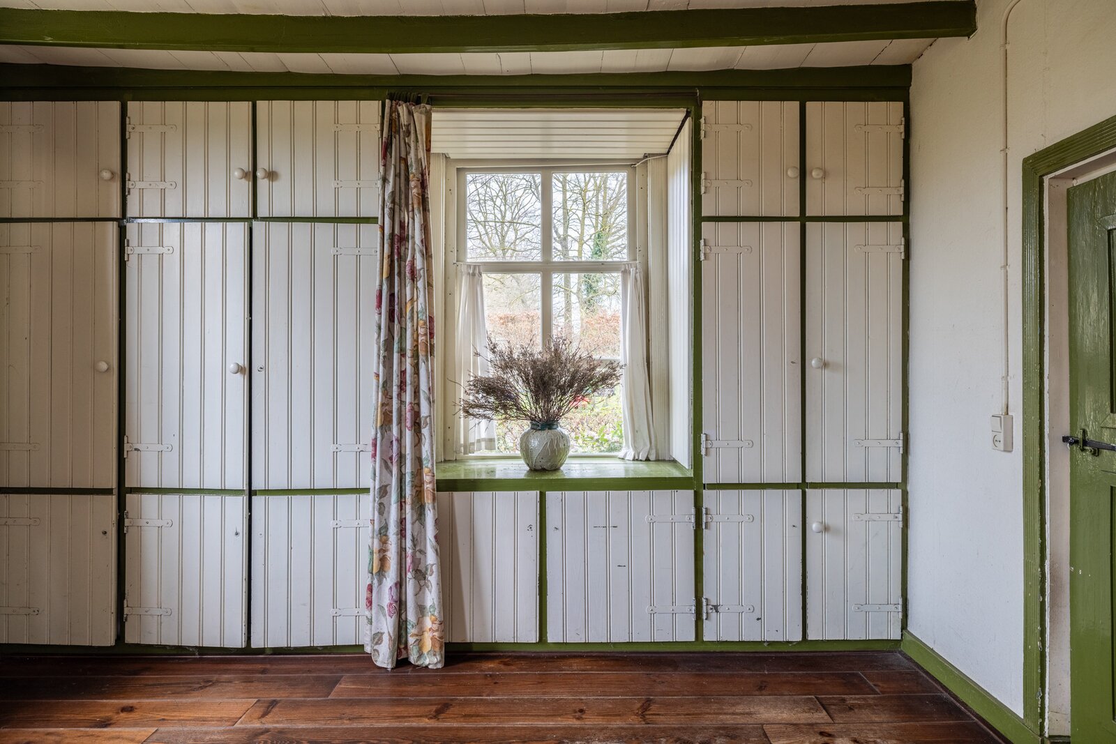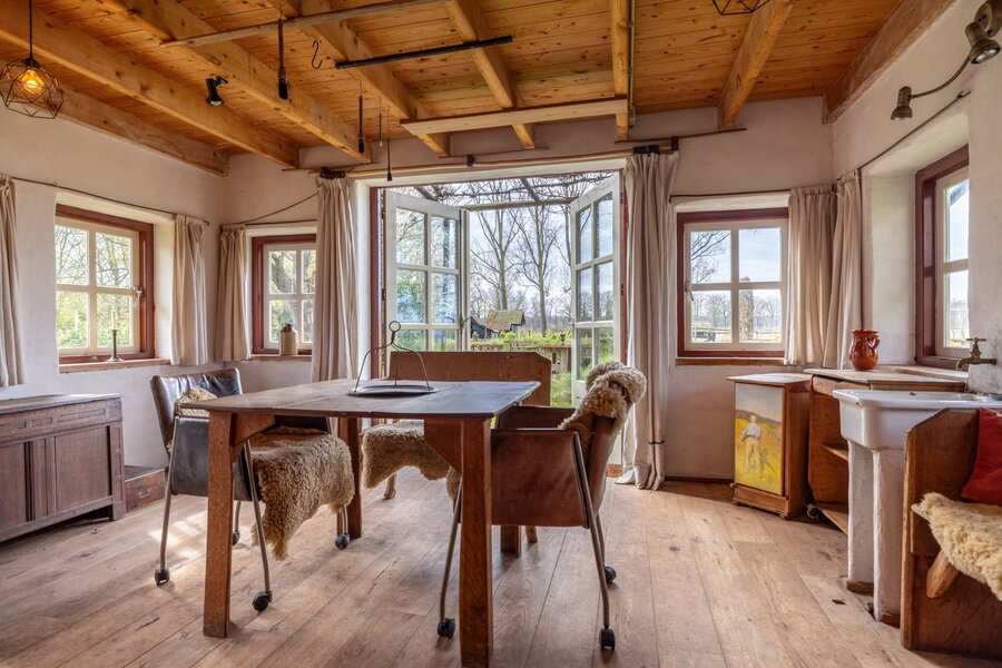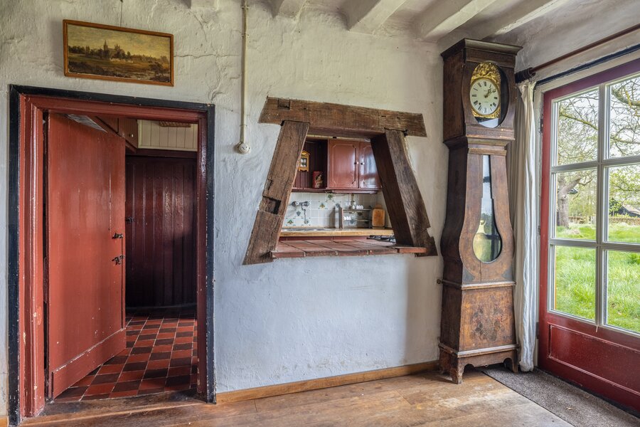 Het voorhuis wordt in de praktijk betreden via de oprit aan de linkerzijde van de woning en de achtertuin, met toegang tot de keukenkamer met houtkachel. Hier ervaar je direct de sfeer en het karakter van deze langgevelboerderij. Authentieke elementen zijn volop aanwezig: van houten deuren met origineel beslag – kenmerkend voor de bouwperiode met een iets lagere doorloophoogte – tot stuc-op-riet plafonds en robuuste houtconstructies, die het geheel een warme en doorleefde uitstraling geven.