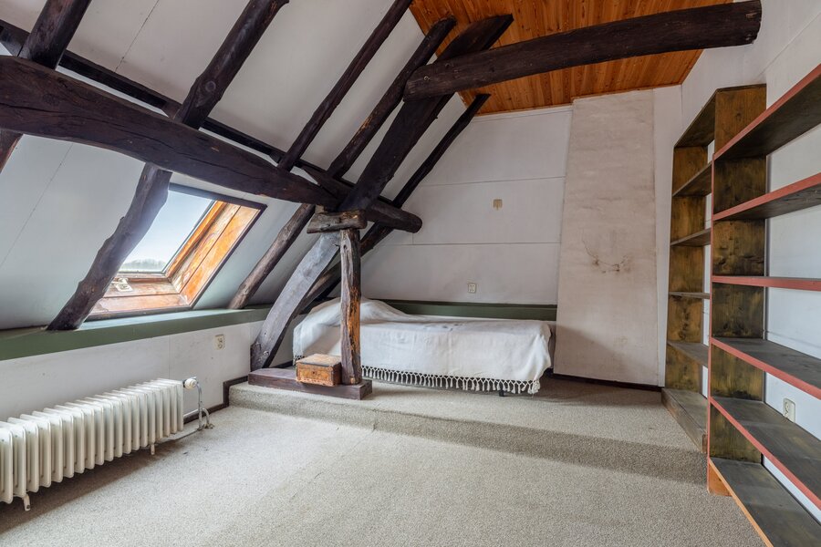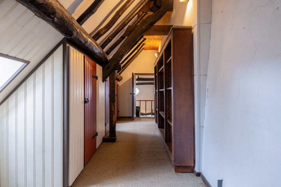 De ruime bovenverdieping is bereikbaar via een vaste bordestrap en biedt eveneens volop mogelijkheden voor verdere invulling. Aan de lange overloop bevinden zich twee slaapkamers, meerdere bergruimtes, een technische ruimte met cv-combiketel en een compacte doucheruimte met wastafel. Ook hier biedt de aanwezige ruimte alle gelegenheid om het geheel naar eigen inzicht en woonwensen verder te optimaliseren.