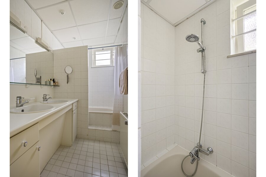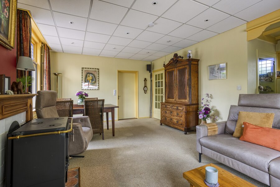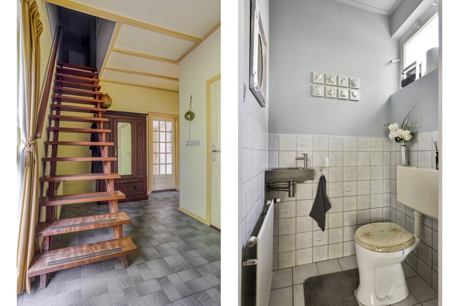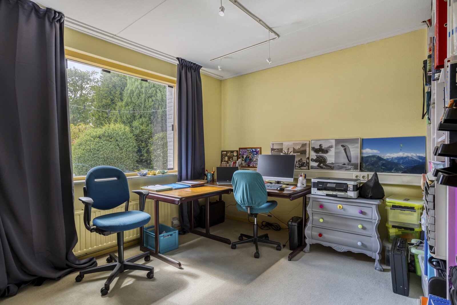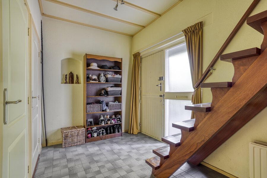 De woning zelf heeft een praktische en verrassend ruime indeling. Vanuit de hal heeft u toegang tot het toilet, een bergkast met cv-ketel, de trapopgang naar de eerste verdieping, de badkamer en diverse leefruimtes. De badkamer is compleet uitgerust met een bad en een dubbele wastafel – ideaal voor een ontspannen start of afsluiting van uw dag. Grenzend aan de hal bevindt zich een royale werkkamer, perfect als thuiskantoor, hobbyruimte of extra slaapkamer.