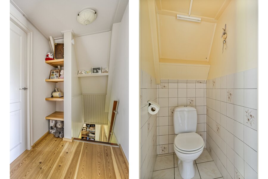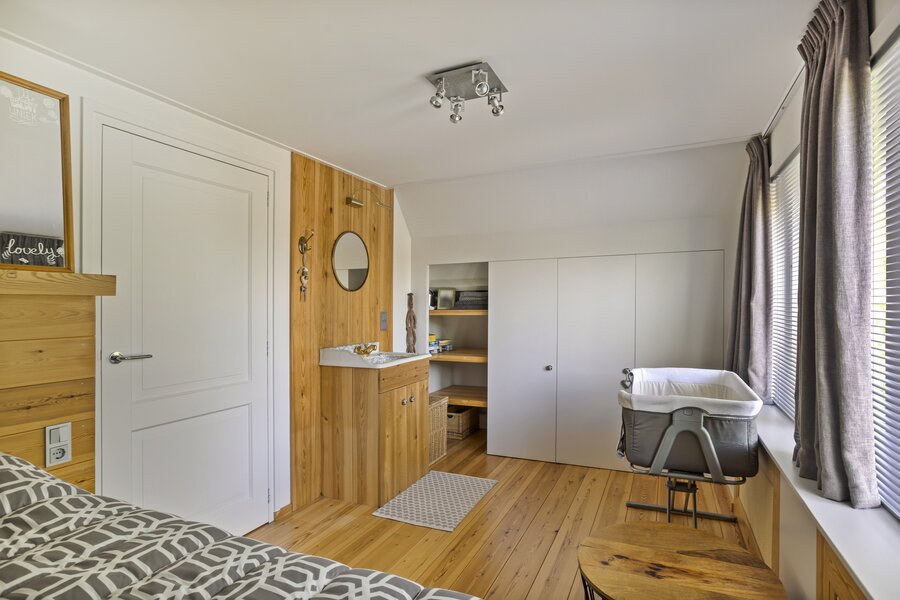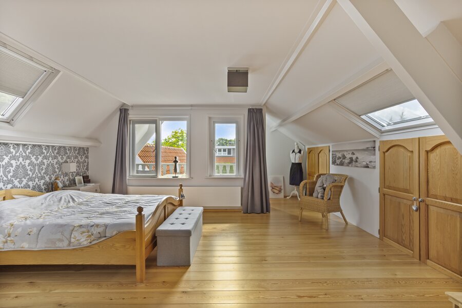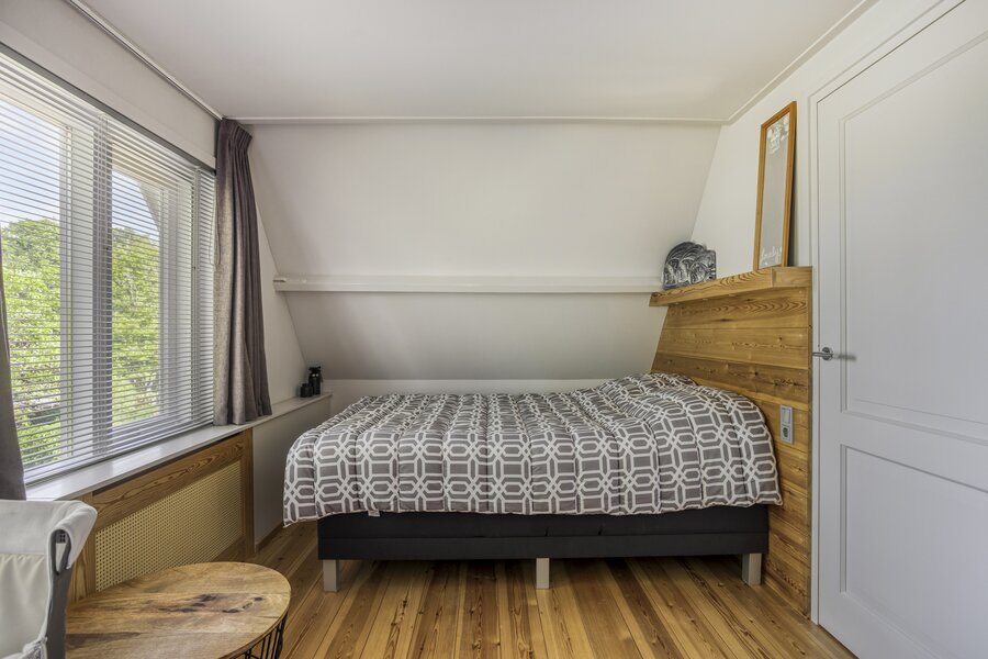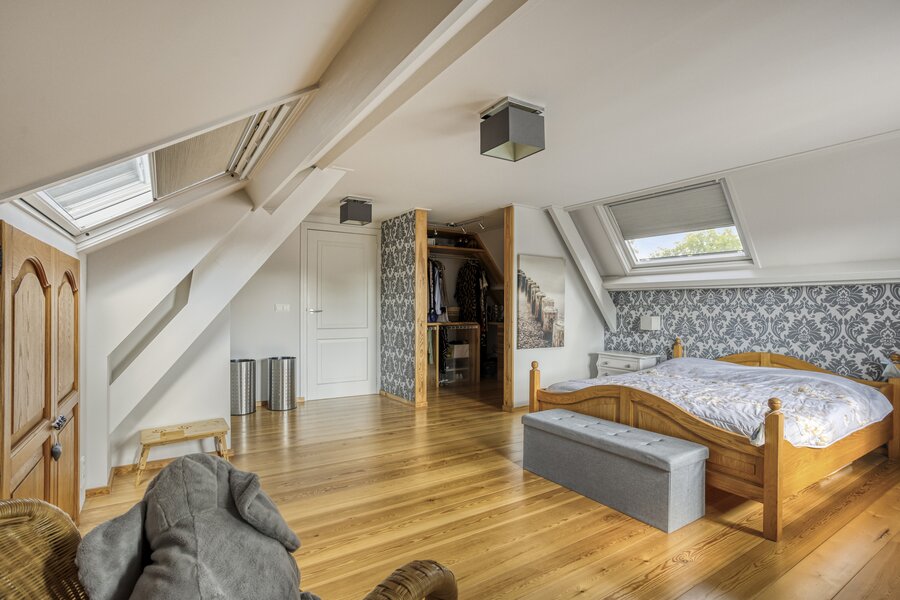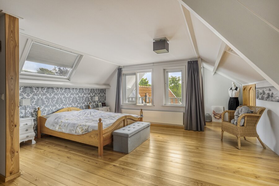 Op de verdieping vindt u twee slaapkamers en een tweede toilet. De master bedroom is royaal van opzet en beschikt over een walk-in closet en toegang tot een balkon – een heerlijke plek om de dag rustig te beginnen. Onder het schuine dak is veel praktische bergruimte beschikbaar. Ook is er nog een bergzolder, bereikbaar via een vlizotrap.