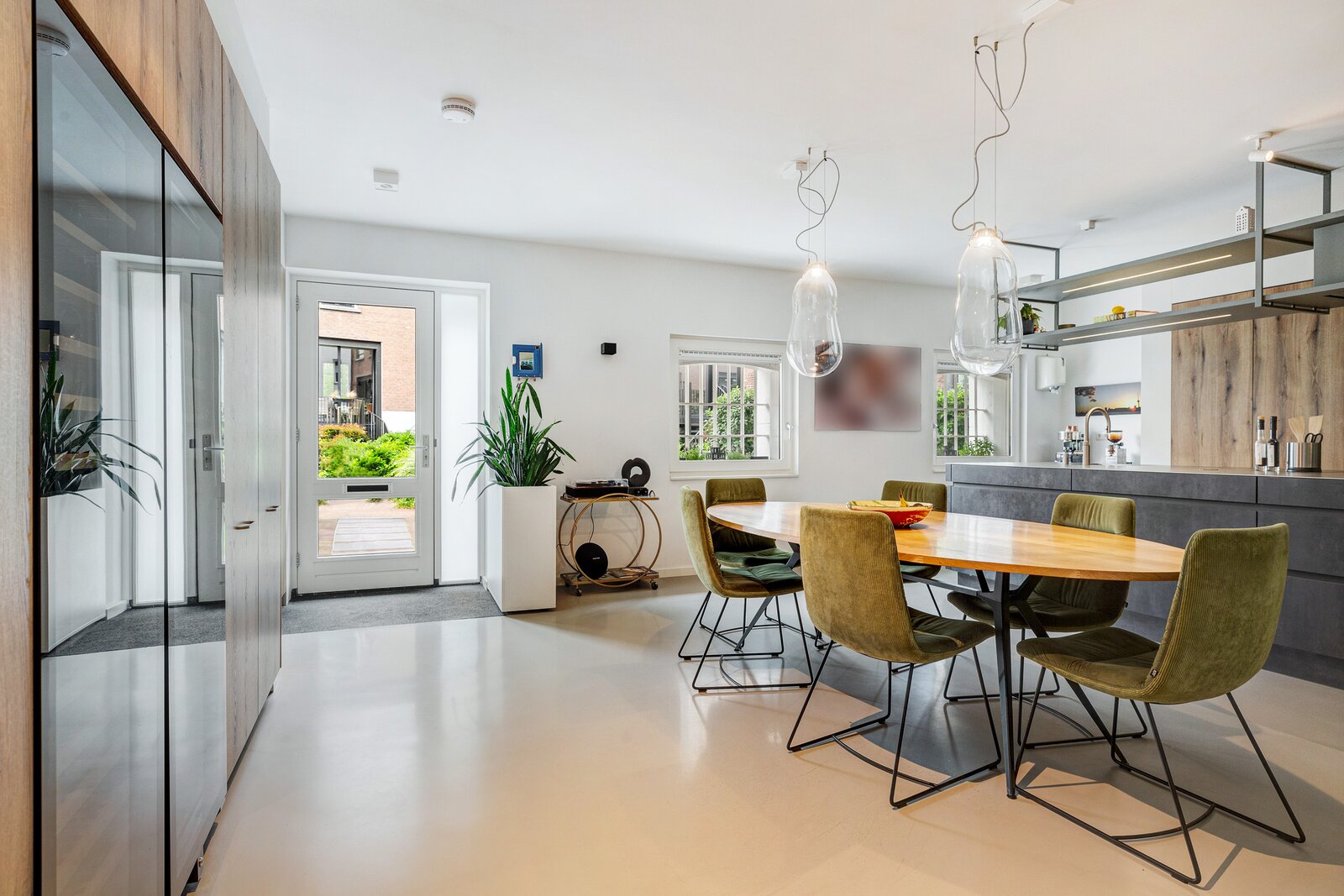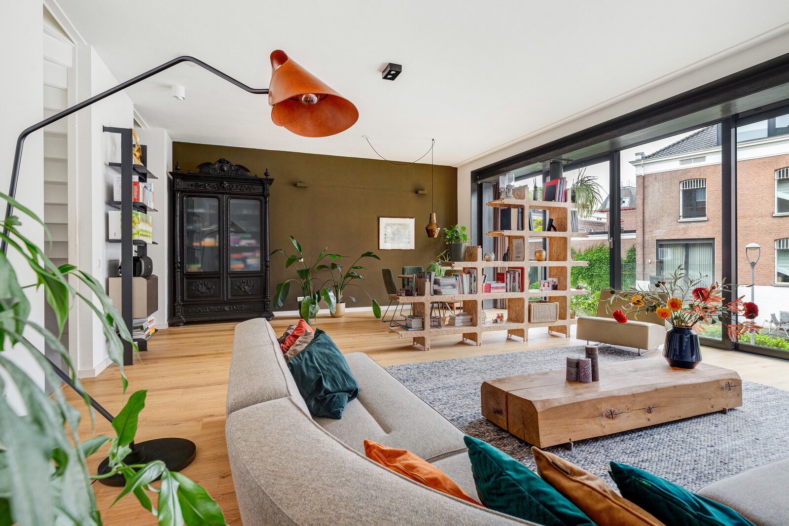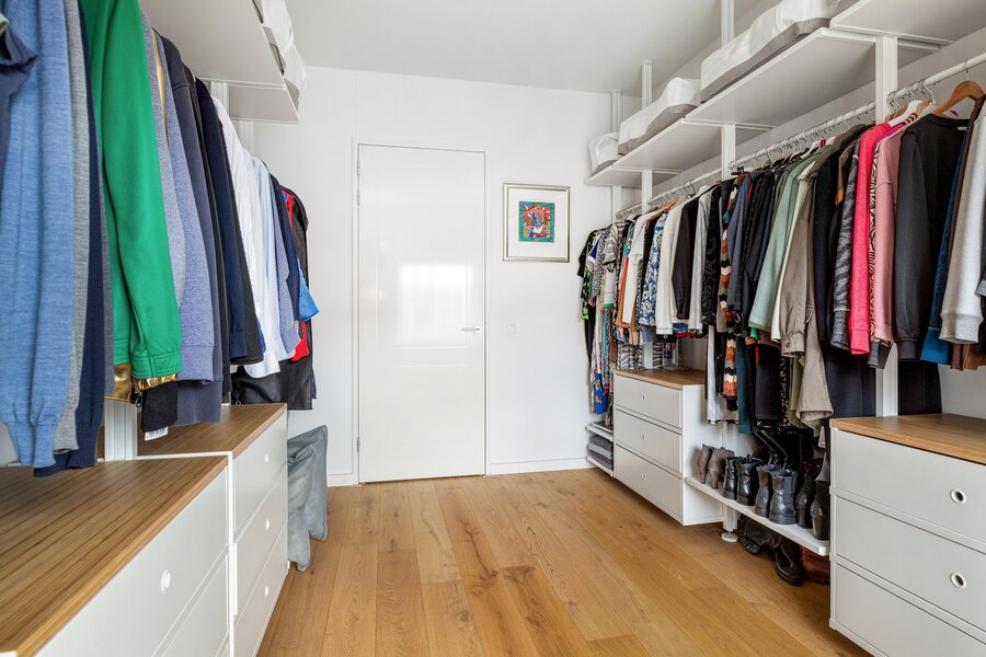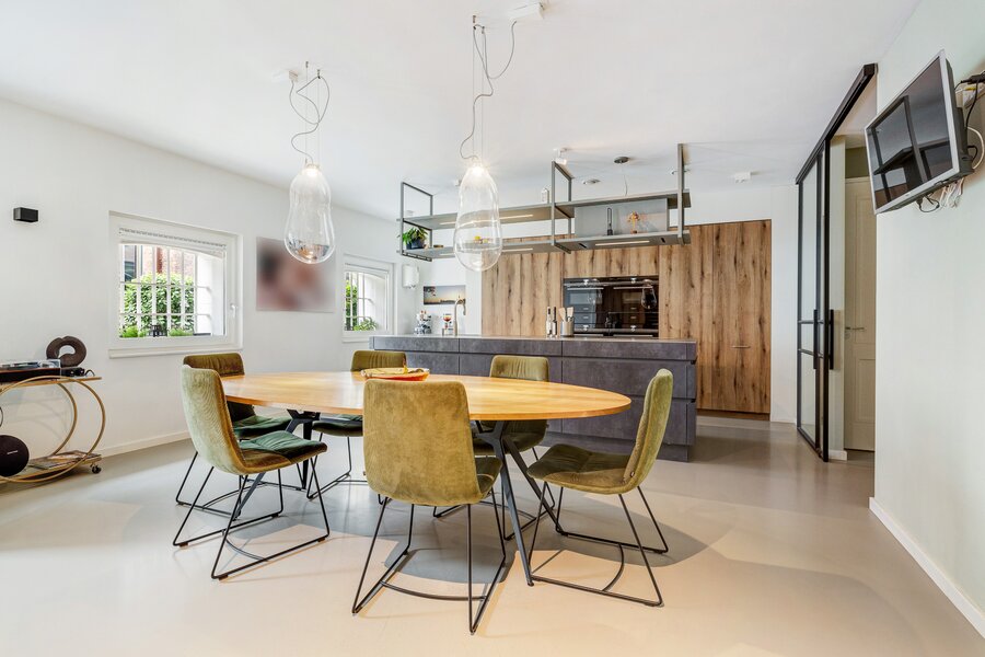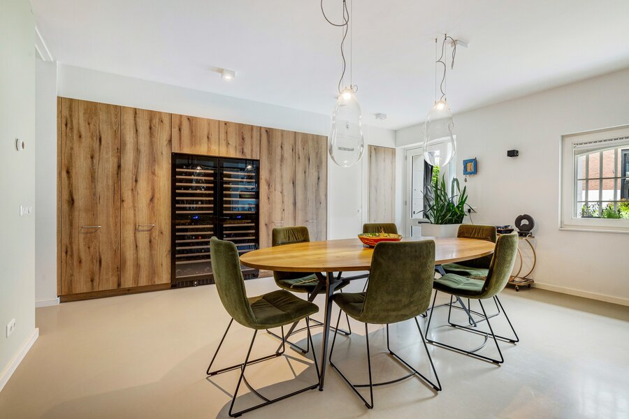 Imposante living met een royale plafondhoogte van ca. 3.05 m, voorzien van eikenhouten vloerdelen met comfortabele vloerverwarming. In de monumentale gevel is over de volledige breedte en hoogte een spectaculaire, extra grote glaspartij gerealiseerd met drie te openen schuifpuien, elektrische zonnescreens en een fraai groen uitzicht. Hier is tevens een ruime bergkast gesitueerd.