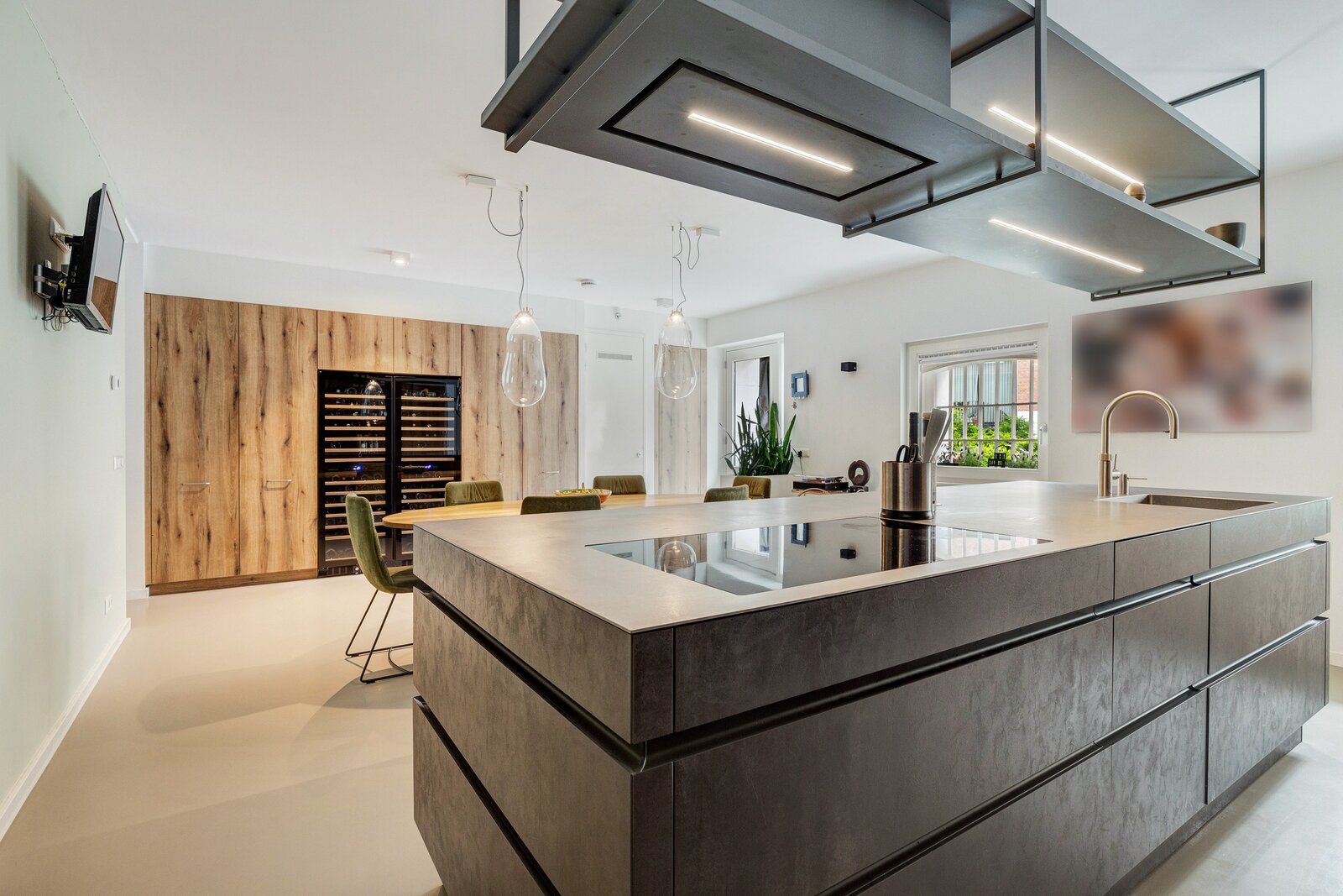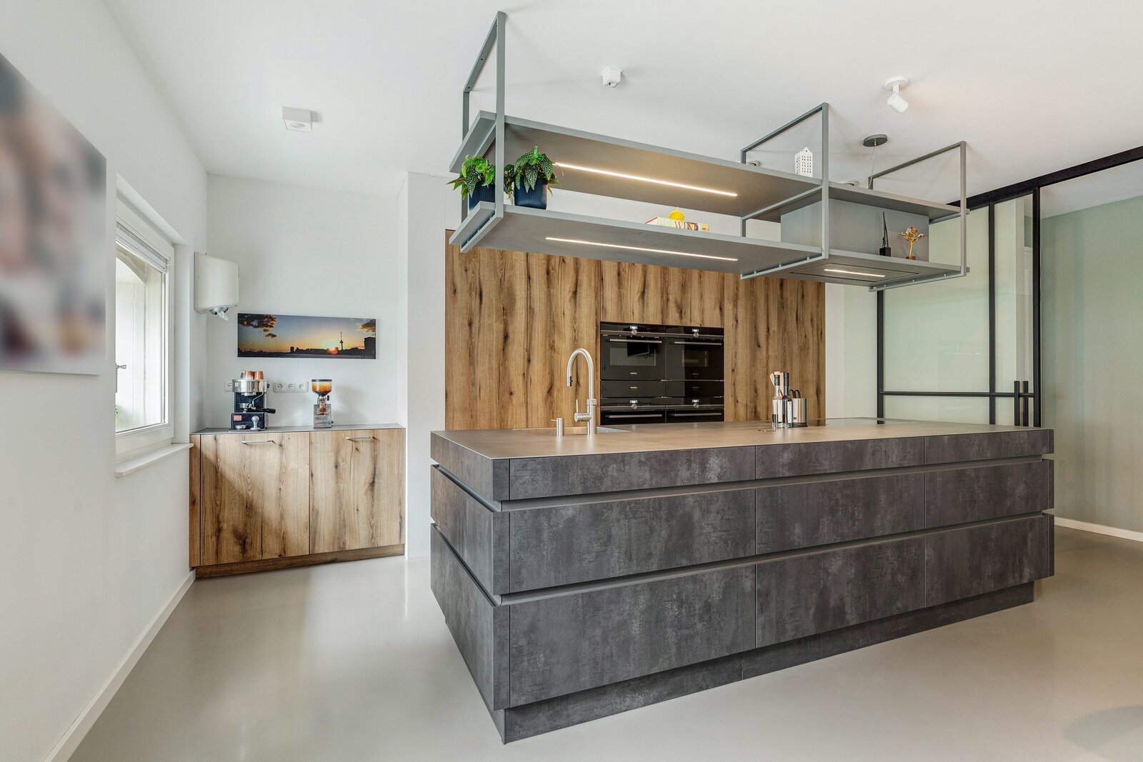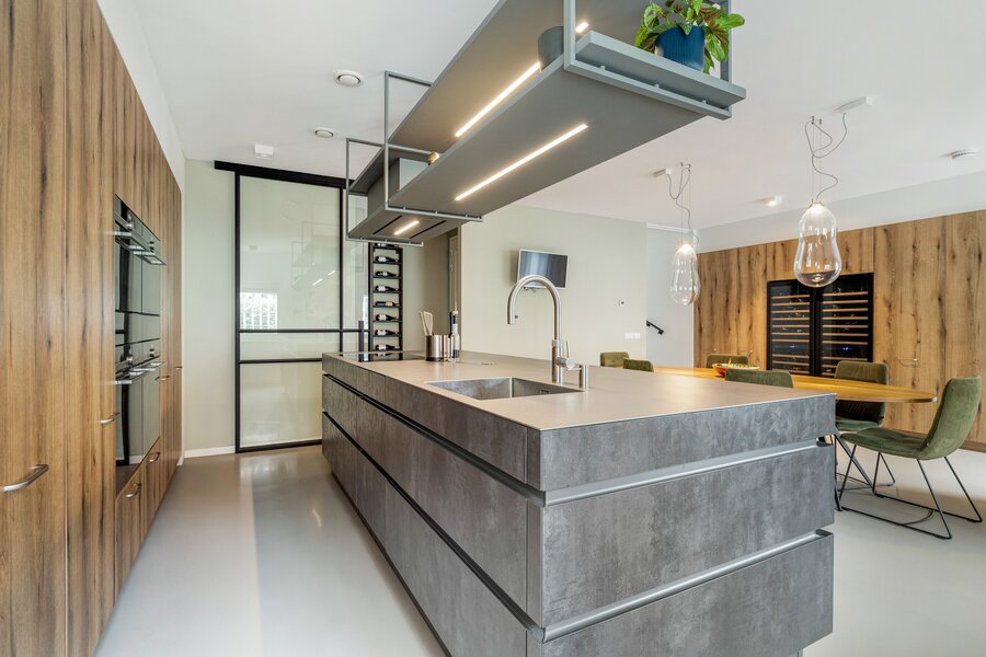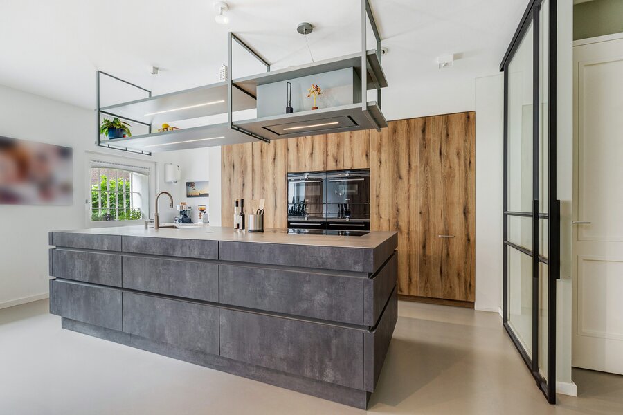 Entree, ruime woonkeuken (ca. 50 m²) voorzien van stoere gietvloer met vloerverwarming. Luxe keuken (Leicht) met kookeiland uitgevoerd in geborsteld staal. De keuken heeft veel opbergruimte en alle denkbare inbouwapparatuur zoals een inductiekookplaat, afzuigkap, 2 heteluchtovens, stoomoven, oven, magnetron, 2 koelkasten met vriesvak, 2 warmhoudlades, vaatwasser, Quooker en 2 wijnklimaatkasten. Een waar walhalla voor liefhebbers van koken. Via mooie stalen deuren is er toegang naar de hal met toilet voorzien van wandcloset en fonteintje en een ruime provisiekast.