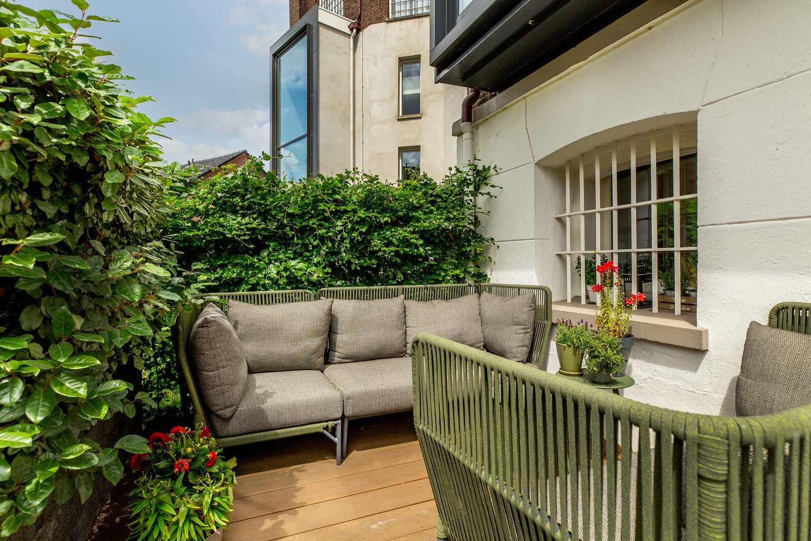 De privéparkeerplaats en de aparte berging bevinden zich op het afgesloten terrein en zijn inbegrepen in de vraagprijs.