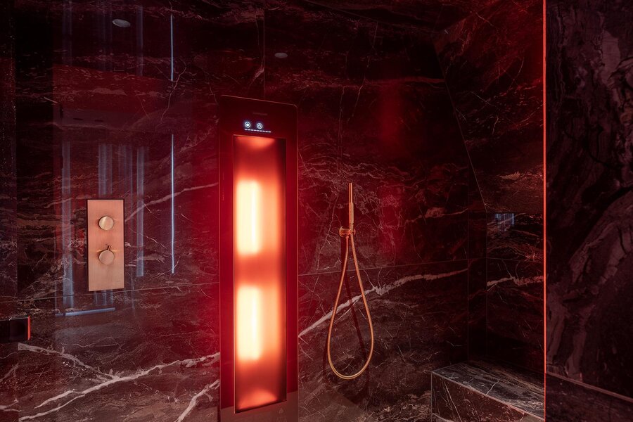 This system works seamlessly with the integrated home automation system by the prestigious brand Basalte. Throughout the residence, minimalist switches and displays have been installed, each crafted with the utmost precision from the same solid, noble material.