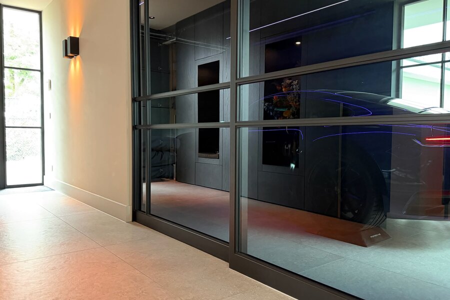 Naast de aanwezigheid van een volwaardige home cinema, een gym en een representatief kantoor aan de ‘stille zijde’, biedt de inpandige garage een unieke extra dimensie. Dankzij de verfijnde afwerking en de overvloedige lichtinval leent deze ruimte zich uitstekend als inspirerend atelier, extra ruimte of -zoals in de huidige opstelling- als expositieruimte voor uw geliefde bolide.