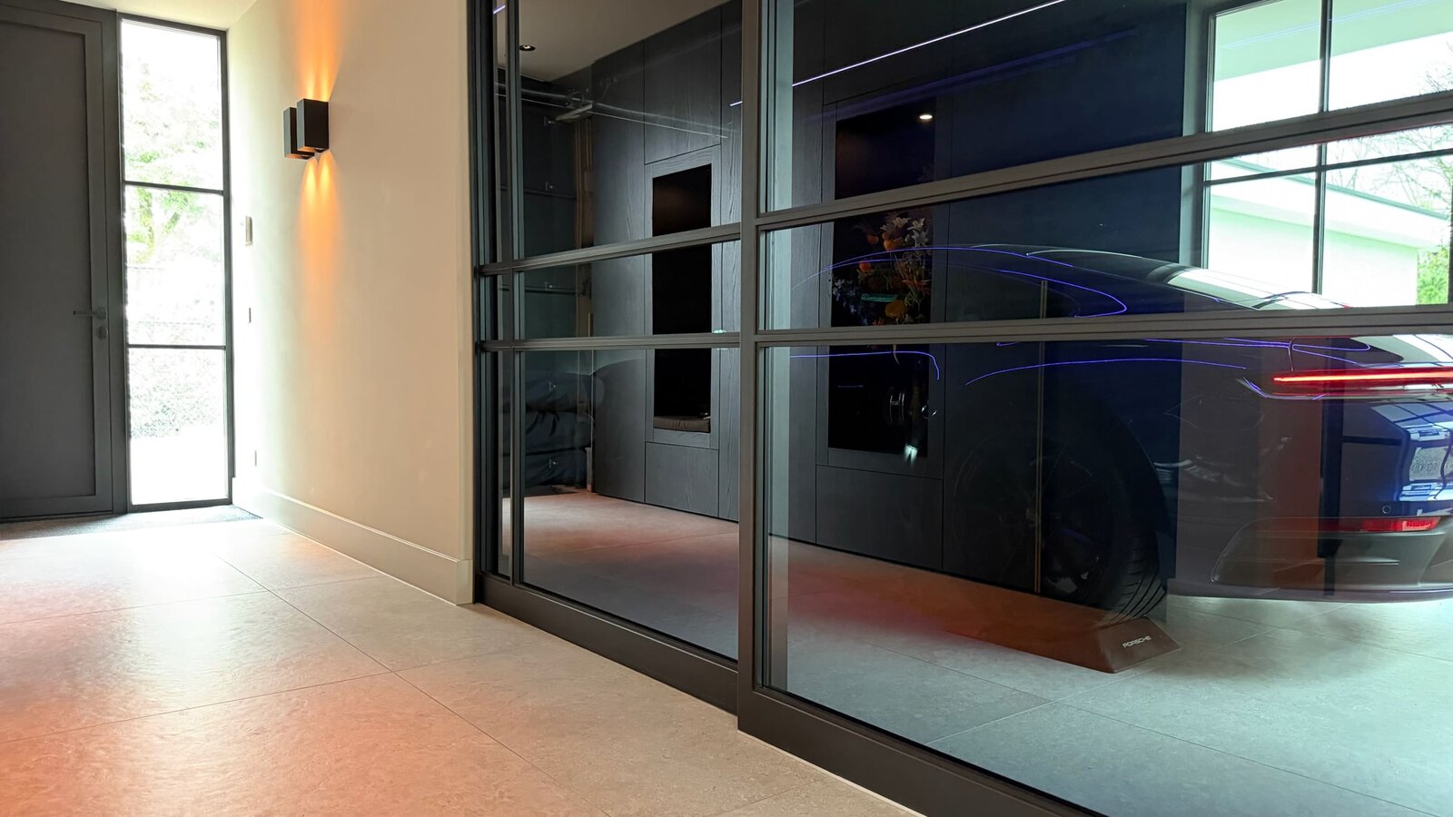In addition to a full home cinema, gym and a representative office on the quiet side of the house, the integral garage offers a unique added dimension. Thanks to its refined finish and abundant natural light, this space is also perfectly suited as an inspiring studio, additional living area or — as in its current setup — an exhibition space for your cherished automobile.