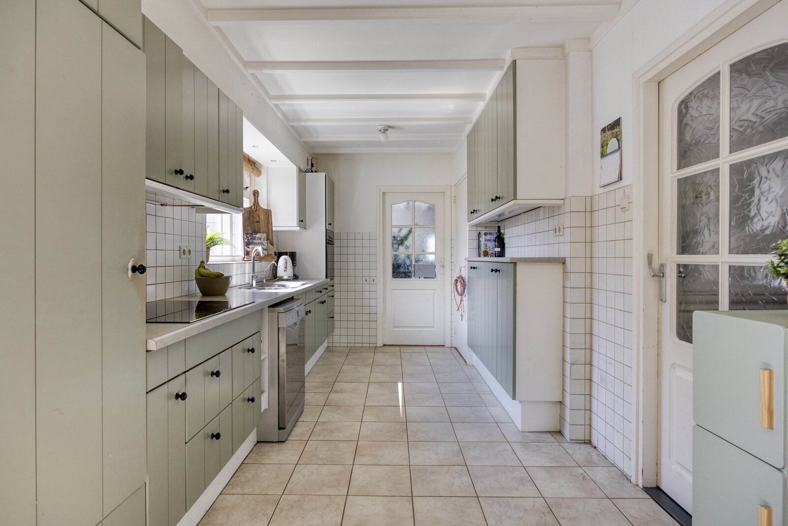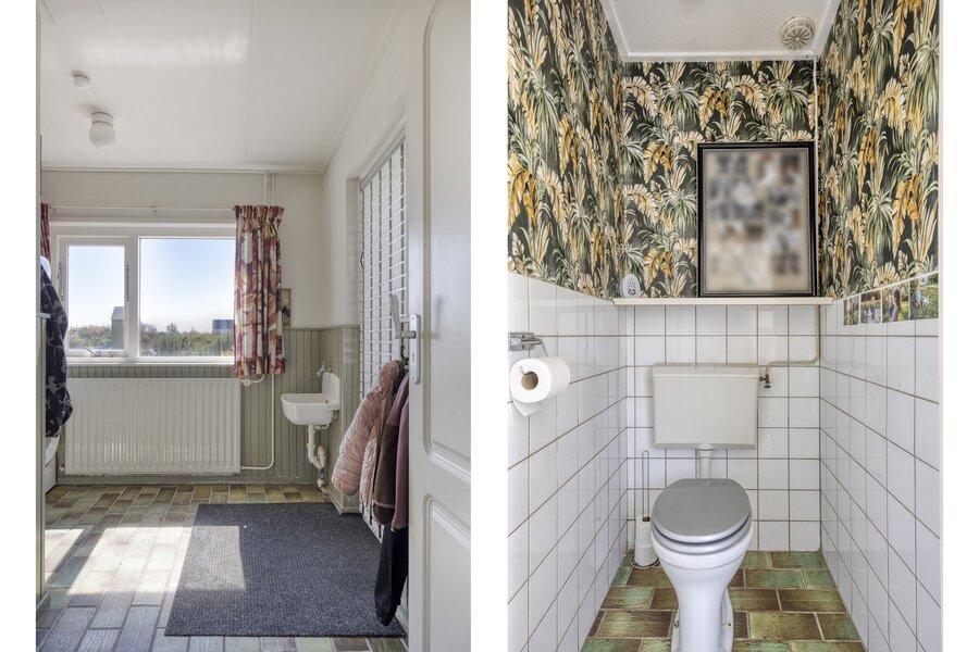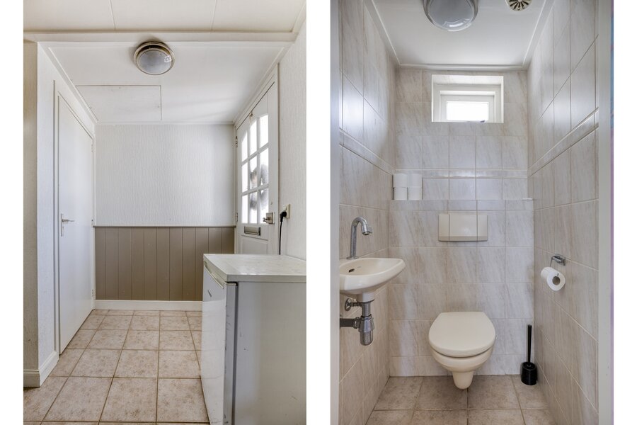 Begane grond: entree via de berging (voorheen tweede woonkamer) of via de bijkeuken met toilet naar de woonkamer.
