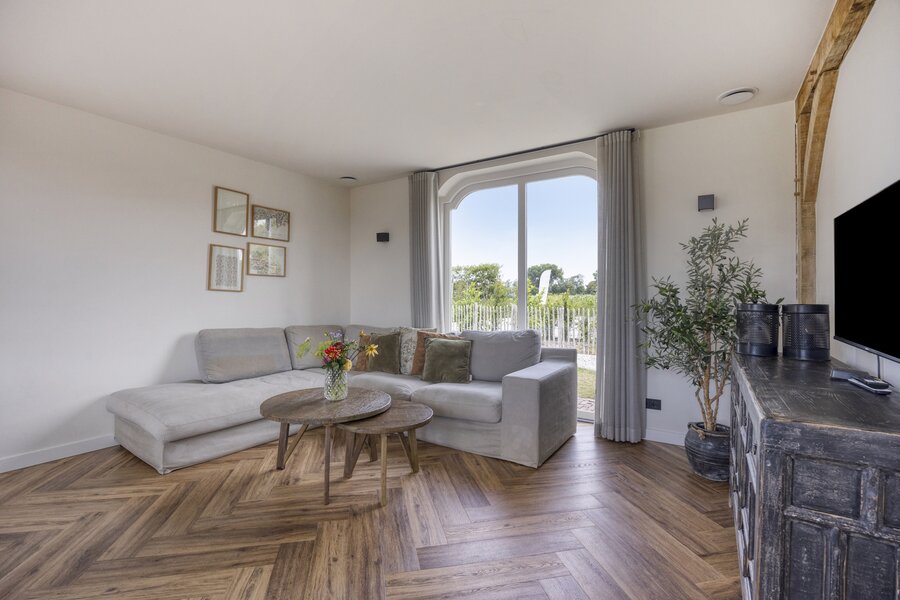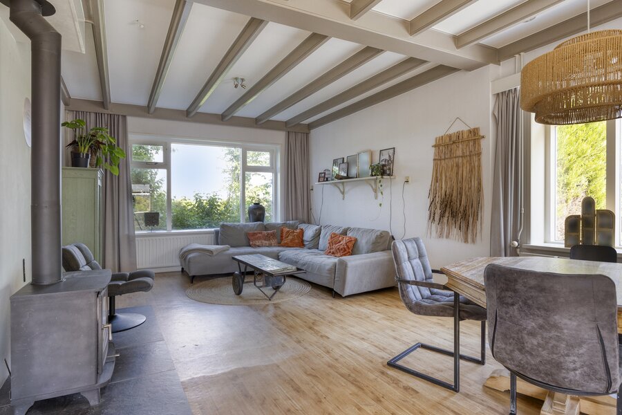 De ruime, lichte woonkamer aan de andere zijde van de woning beschikt over een sfeervolle houtkachel en staat in open verbinding met de keuken.