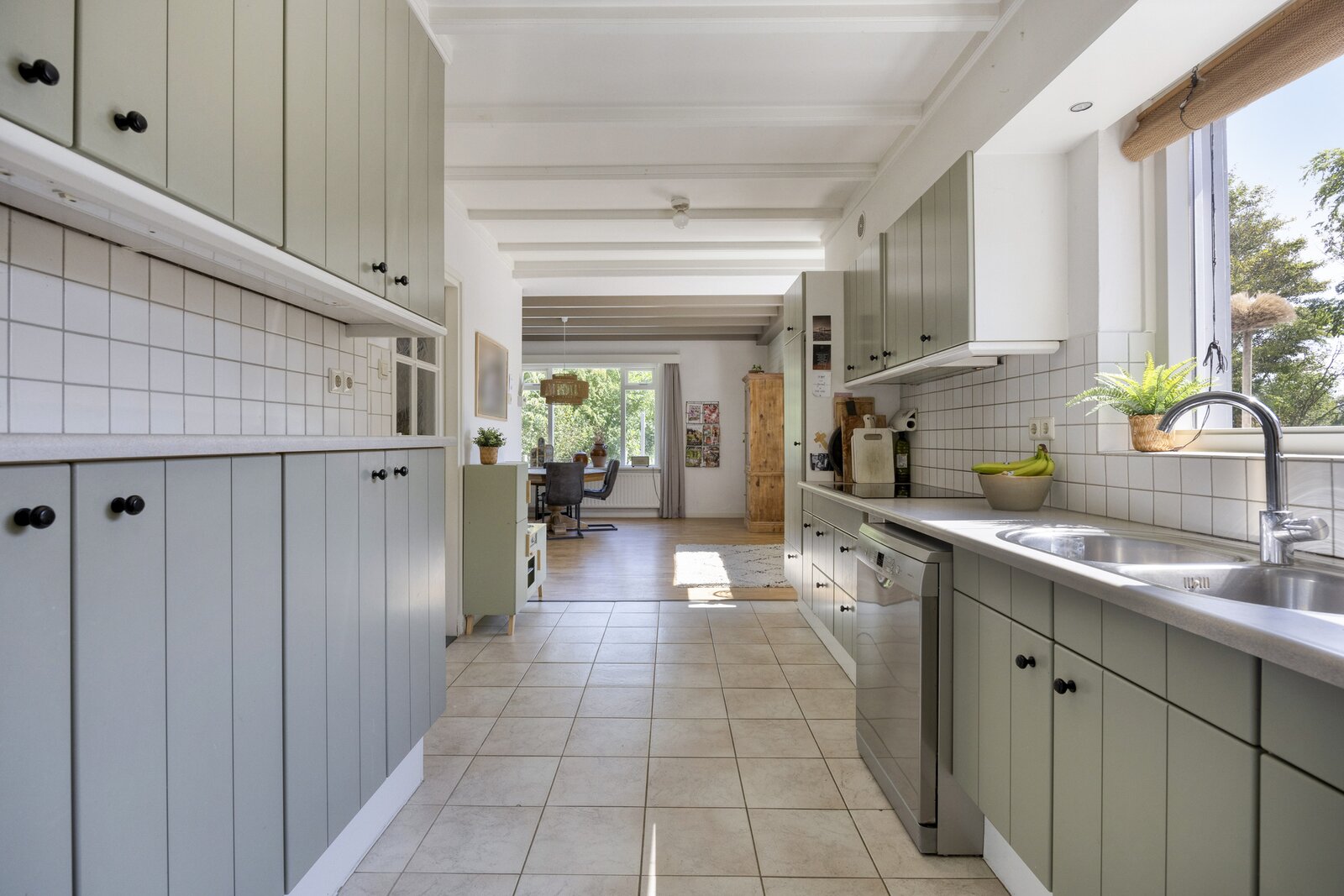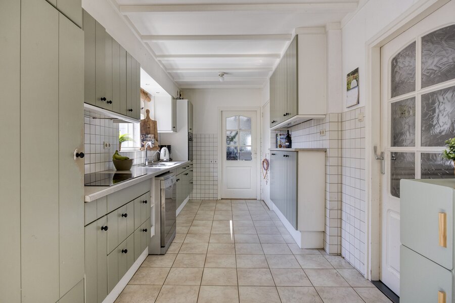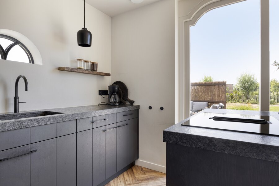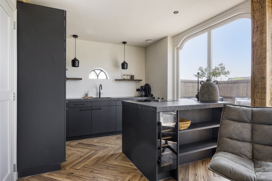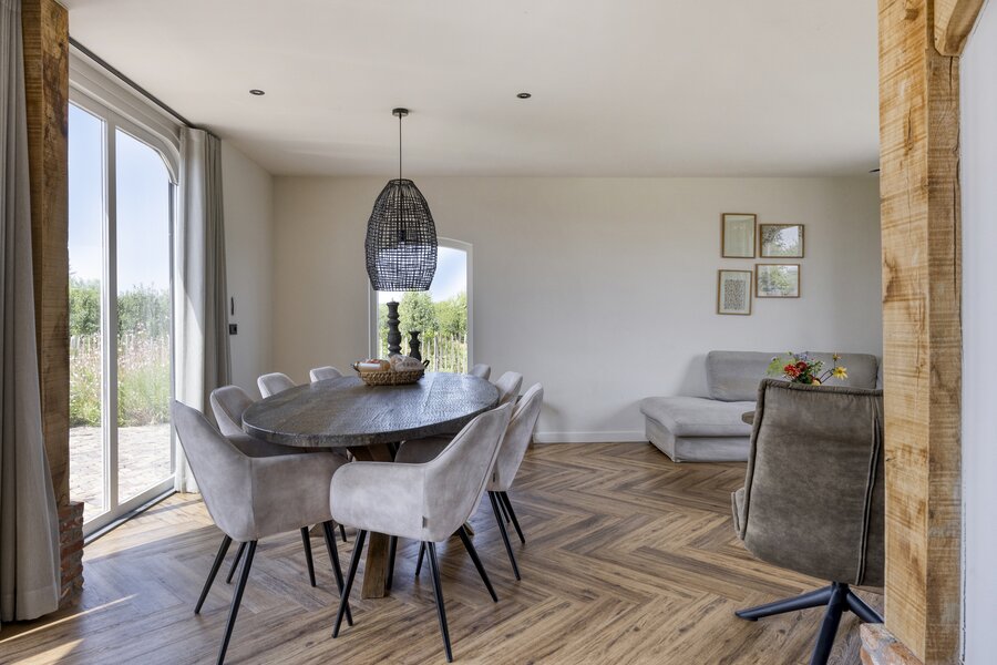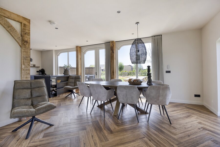 Woonkamer met grote raampartijen, openslaande deuren naar het terras en de tuin. De open keuken heeft een kookeiland en is verder voorzien van alle moderne apparatuur.