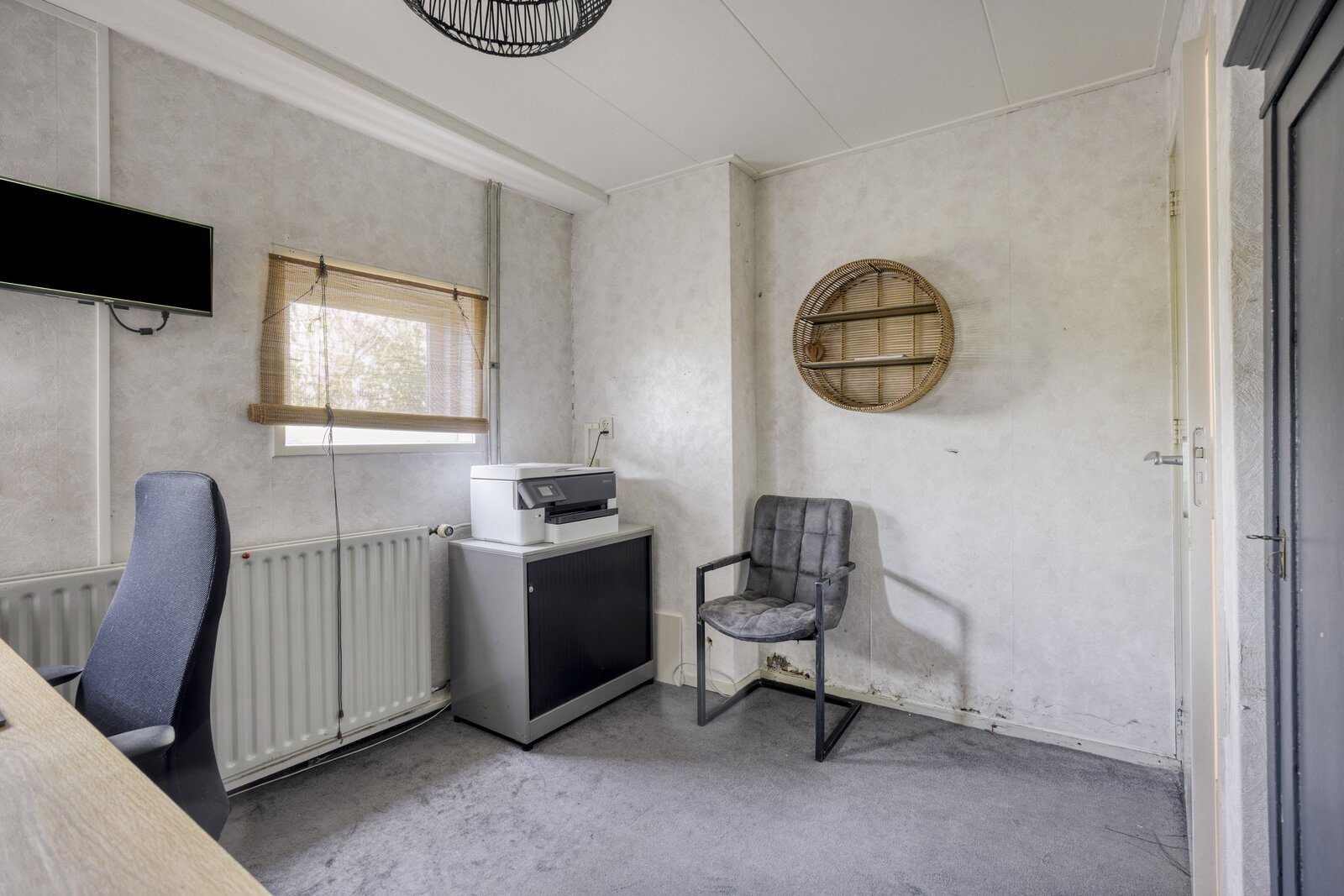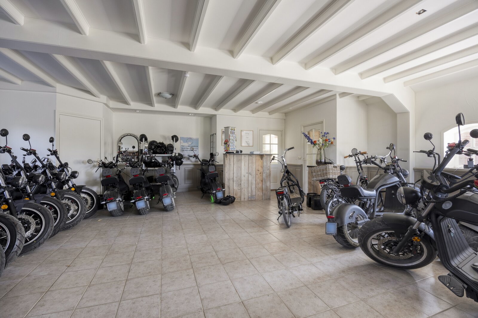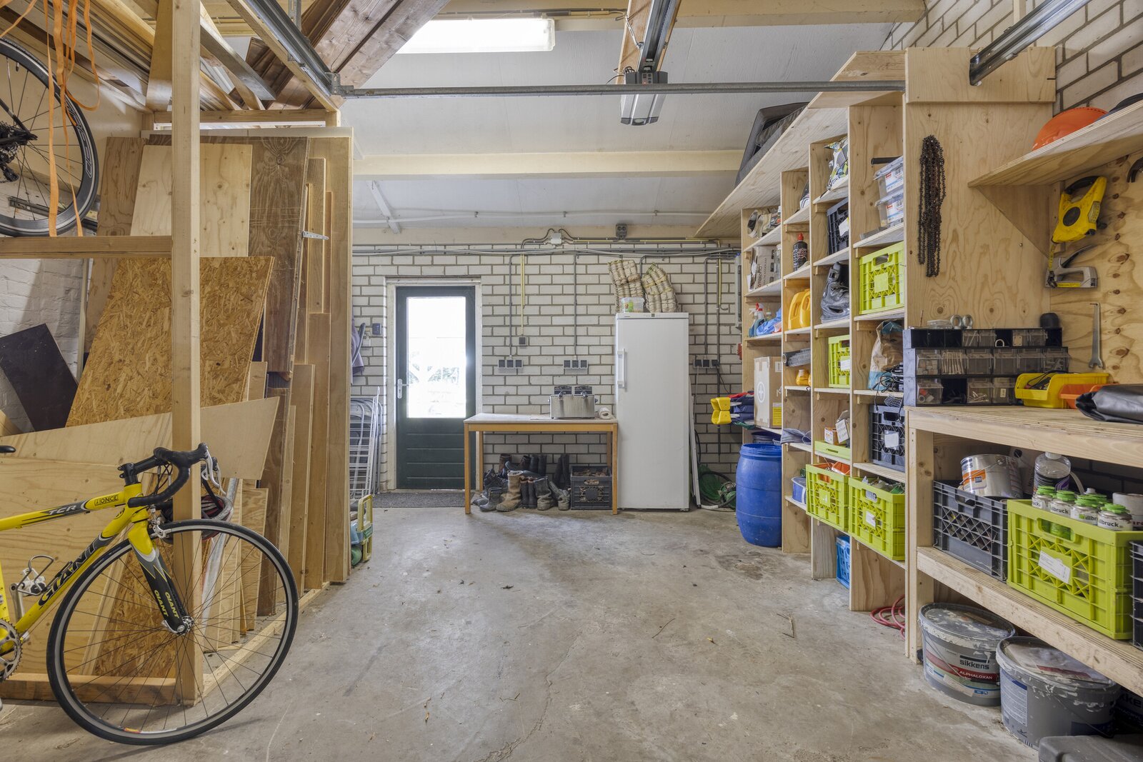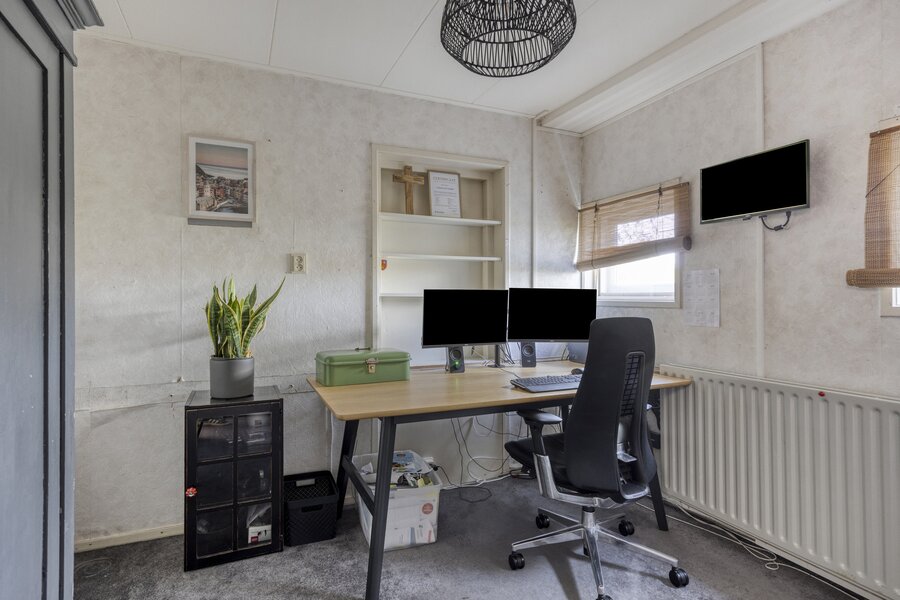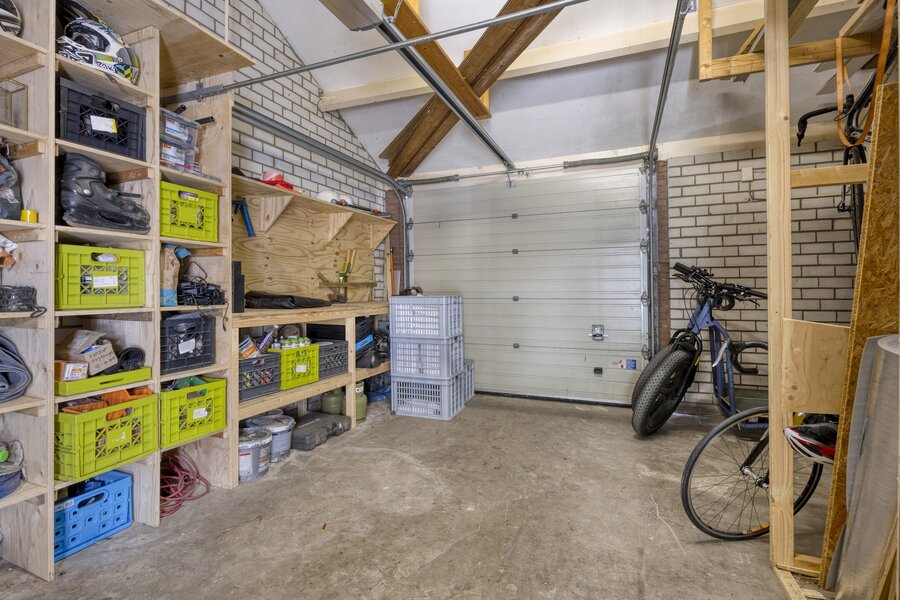 De grote garage (voormalige woonkamer) fungeert momenteel als 'bedrijfsruimte' en bevat een afgesloten ruimte met de cv-opstelling. Hier is eenvoudig weer een woonkamer te realiseren. Verder bevindt zich hier nog een toilet.
