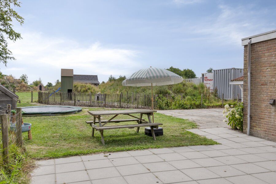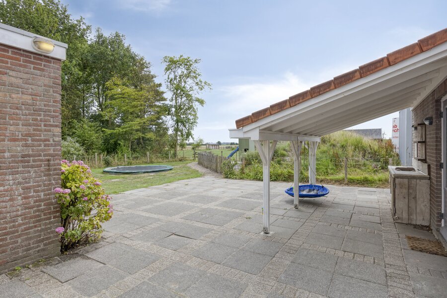 Riant aangelegd terras, overkapping aan de garage, die grenst aan een 2e berging. De garage is voorzien van elektra, water en meterkast. De tuin rondom het terras is zo groot als u zelf wenst en biedt veel privacy dankzij omliggende bossen en een aangelegde ‘duin’.