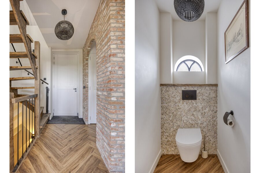 Via de hal naast de keuken heeft u toegang tot de badkamer met douche en toilet, het kantoor op de begane grond en de trap naar de eerste verdieping.
