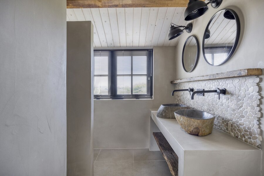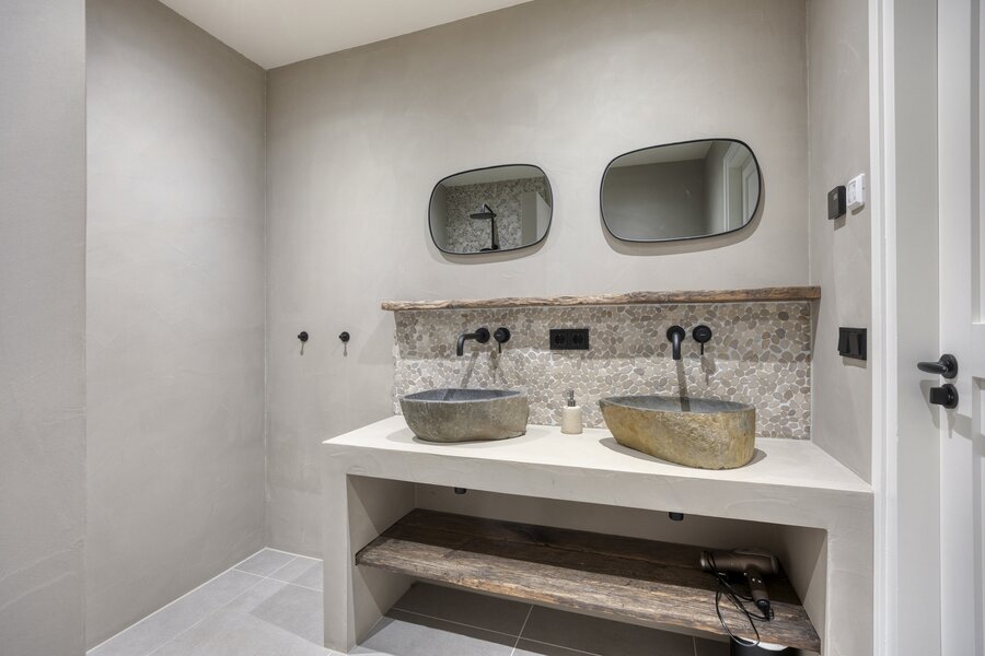Eerste verdieping: overloop met bergruimte en toegang tot de twee ruime slaapkamers en moderne badkamer met inloopdouche, toilet en wastafelmeubel met 2 natuurstenen waskommen.