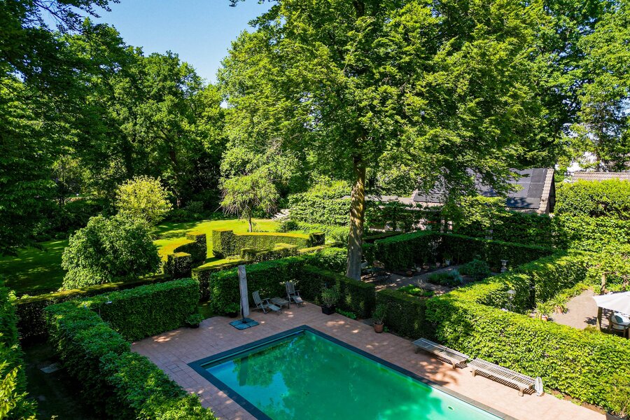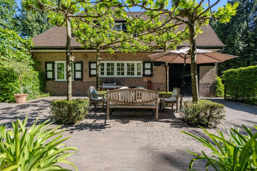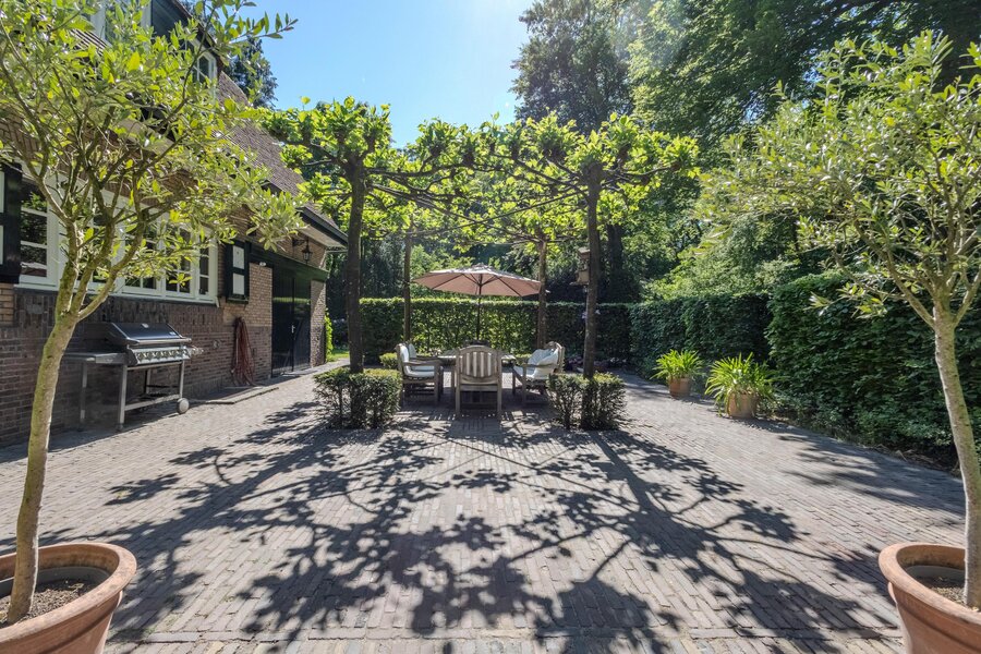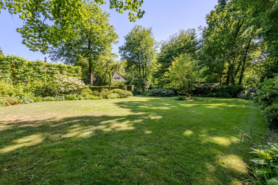 De, onder architectuur aangelegde, tuin (met sproei-installatie) rondom de villa heeft een fraai lijnenspel door de vijverpartij, diverse tuinkamers met hagen, terrassen en paden met sierbestrating, gazon, volwassen borders en bomen. De diverse terrassen bij de villa zorgen dat binnen en buiten harmonieus in elkaar overvloeien en het buitenleven altijd nabij is.