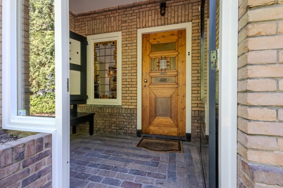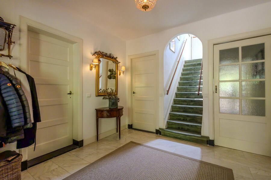 Uitnodigende, overdekte entree naar voordeur met aansluitend de hal met fraaie marmeren tegelvloer, garderobe en bordestrapopgang naar de eerste verdieping.