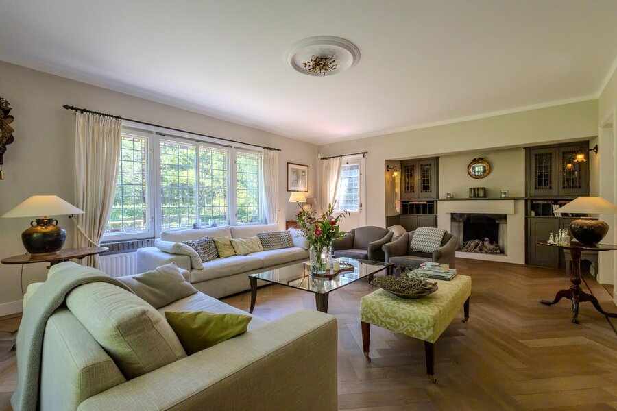 De ruime living heeft een eikenhoutenvloer (visgraatmotief) met wengé bies en is middels en-suite deuren verdeeld in een t.v.-kamer en een kamer met een zitgedeelte met een stijlvolle woonstijl. De haard in strak vormgegeven schouw, de originele vaste kasten met sierglas en de ramen met glas-in-lood geven het geheel een stijlvolle uitstraling.