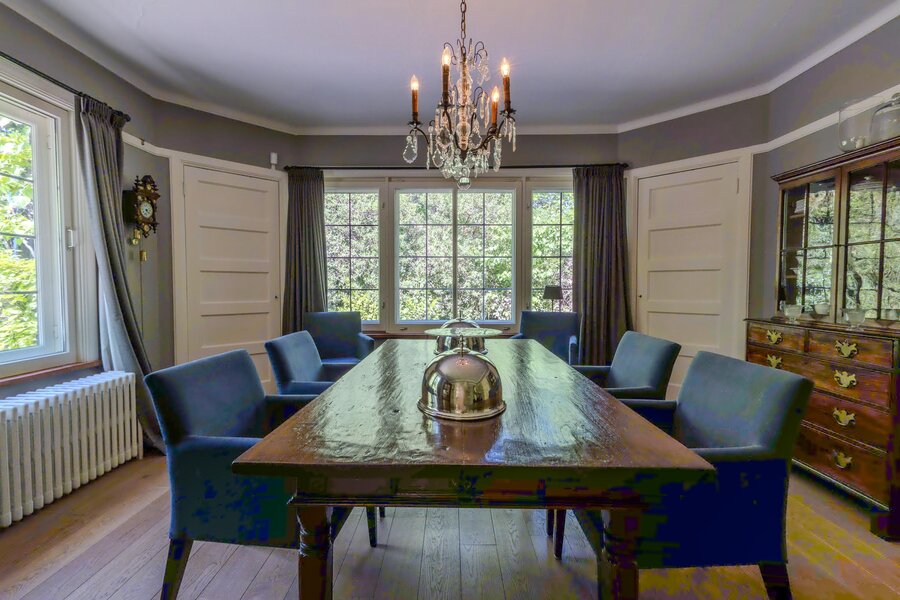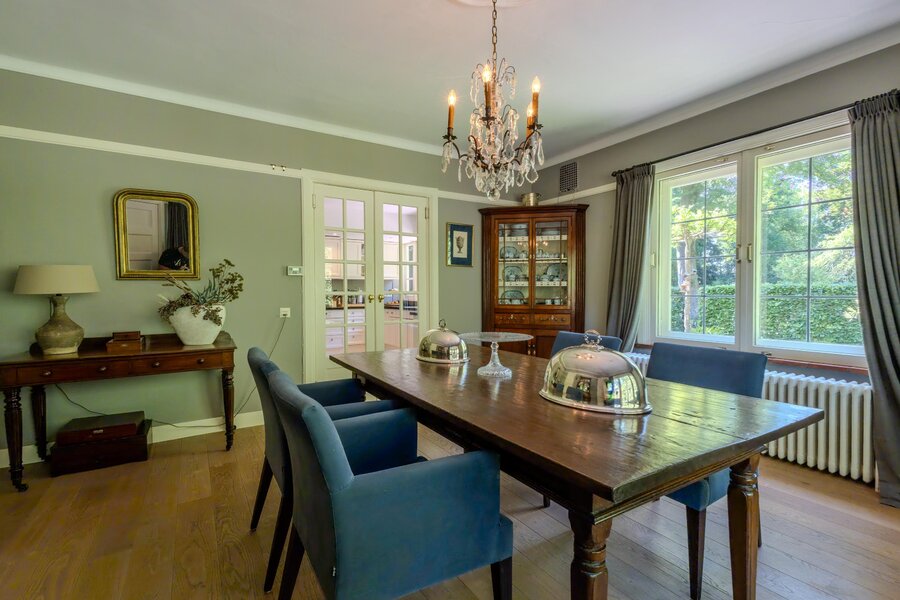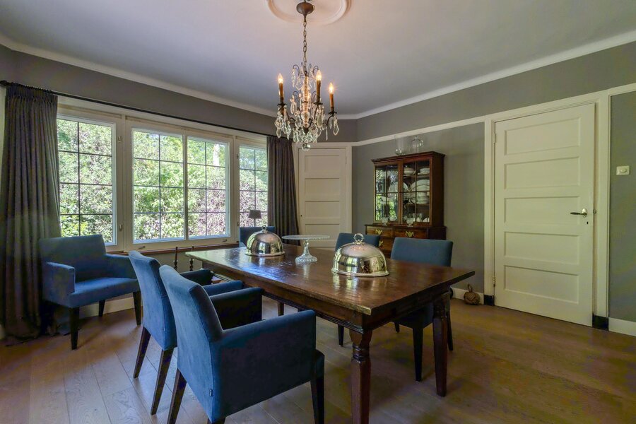 Aansluitend -via dubbele deuren met roedeverdeling- is de eetkamer bereikbaar, voorzien van een houten vloer en twee vaste servieskasten.
