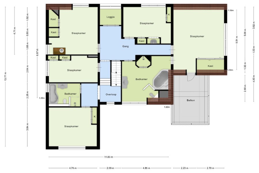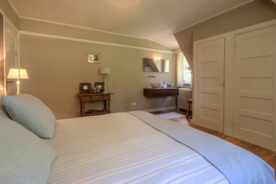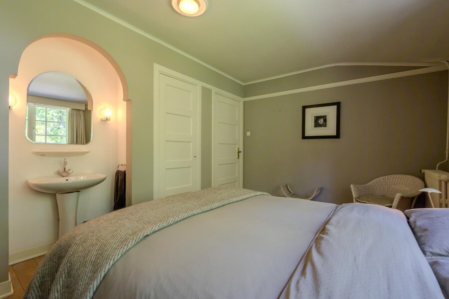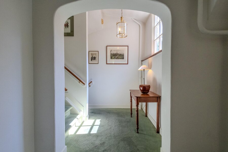Vanaf de overloop leiden enkele treden naar een gang waar zich de andere slaapkamers bevinden. In de gang geven openslaande deuren met roedeverdeling toegang tot een loggia.